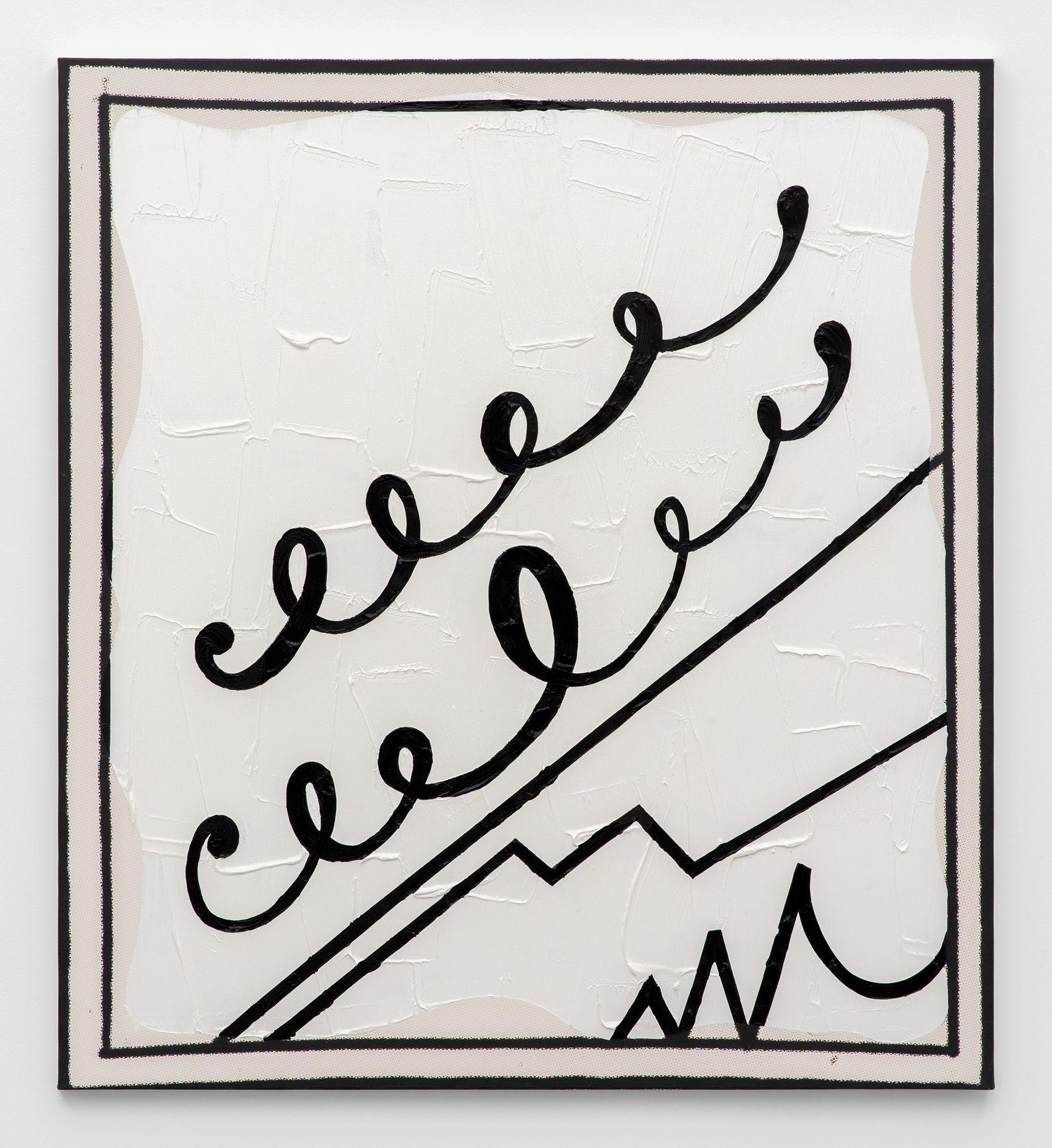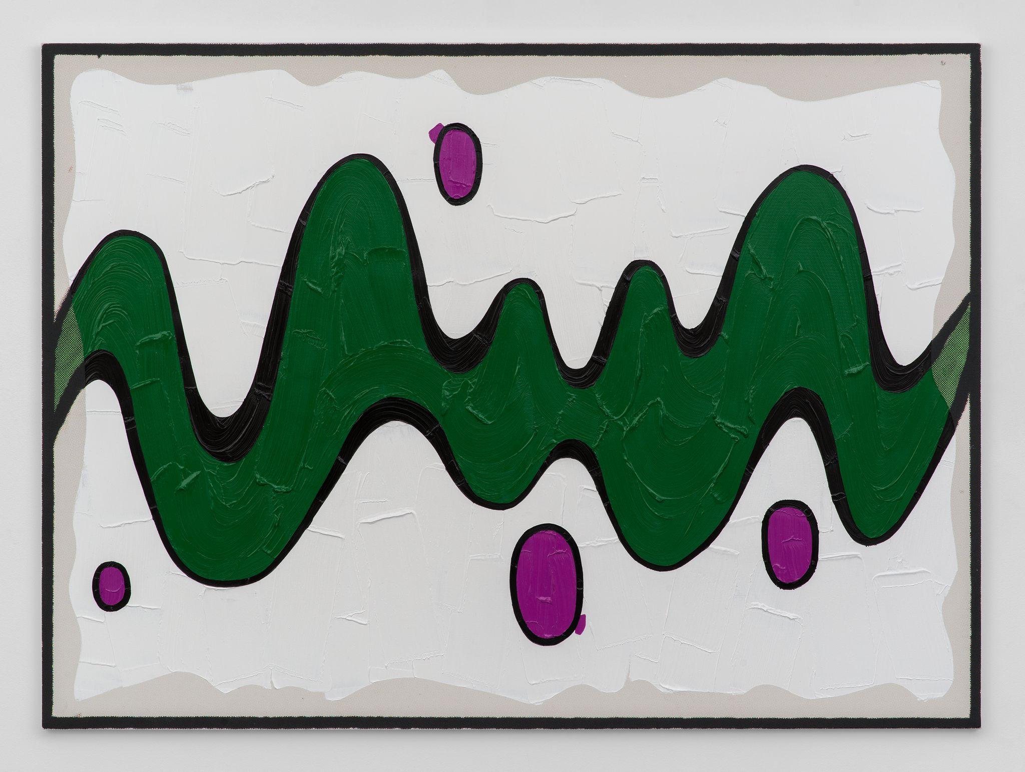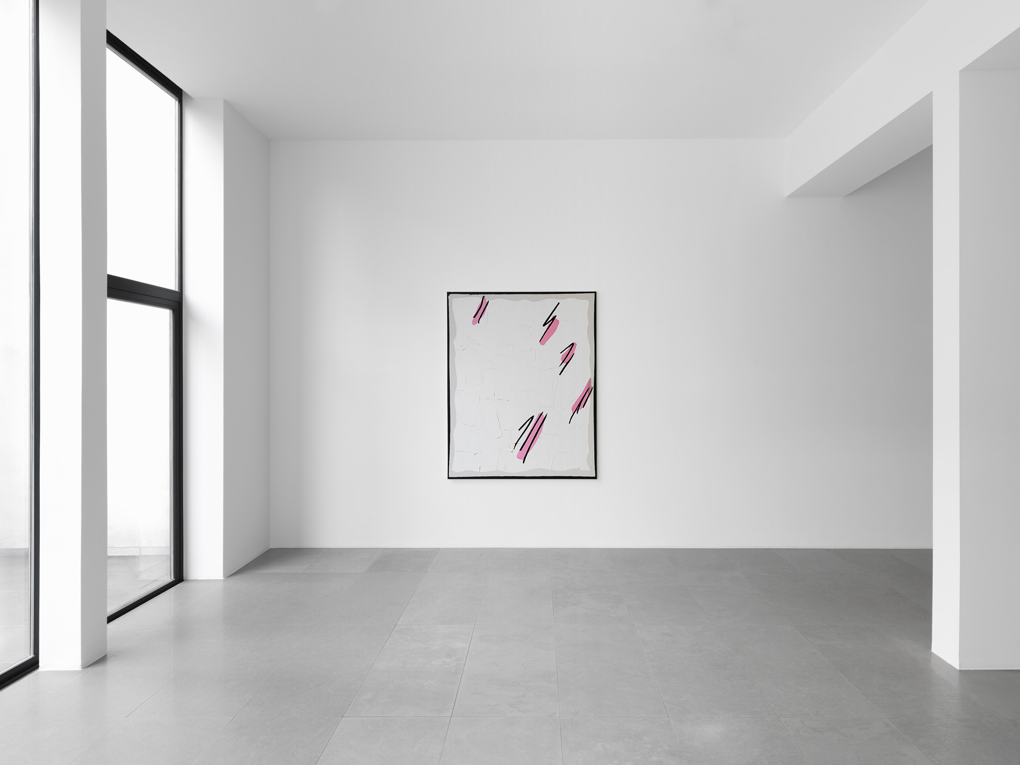 At the heart of the presentation is a new series of paintings that belong to one of Lavier’s most iconic bodies of work: Walt Disney Productions. The starting point for the project, which began in 1984, is to be found in a Walt Disney comic strip from 1977, in which Mickey and Minnie Mouse visit a modern art gallery. Here, they encounter an array of paintings and sculptures that ingeniously mimic genuine modern and contemporary art (the biomorphic sculptures in the story resemble the work of Jean Arp, for example). Fascinated by this, Lavier started to make life-size replicas of the Disney artworks. Hence his colourful, abstract canvases are directly inspired by the paintings that sprang from the cartoonist’s imagination but which, in their own humorous way, were undoubtedly based upon real works of art. By appropriating the fictitious paintings from the inaccessible, printed page and presenting them as autonomous objects within a real gallery space, Lavier recreates an equivalent viewing experience to that of Mickey and Minnie. This loop calls into question the link between fact and fiction – notably the point as which the simulacrum becomes reality – and the representation of modern art in society. Interestingly, the striking simplicity of Lavier’s compositions and the thick, painterly surfaces belie their technical complexity: each canvas incorporates a number of different materials and techniques, ranging from photography to laser-jet and silk-screen printing.