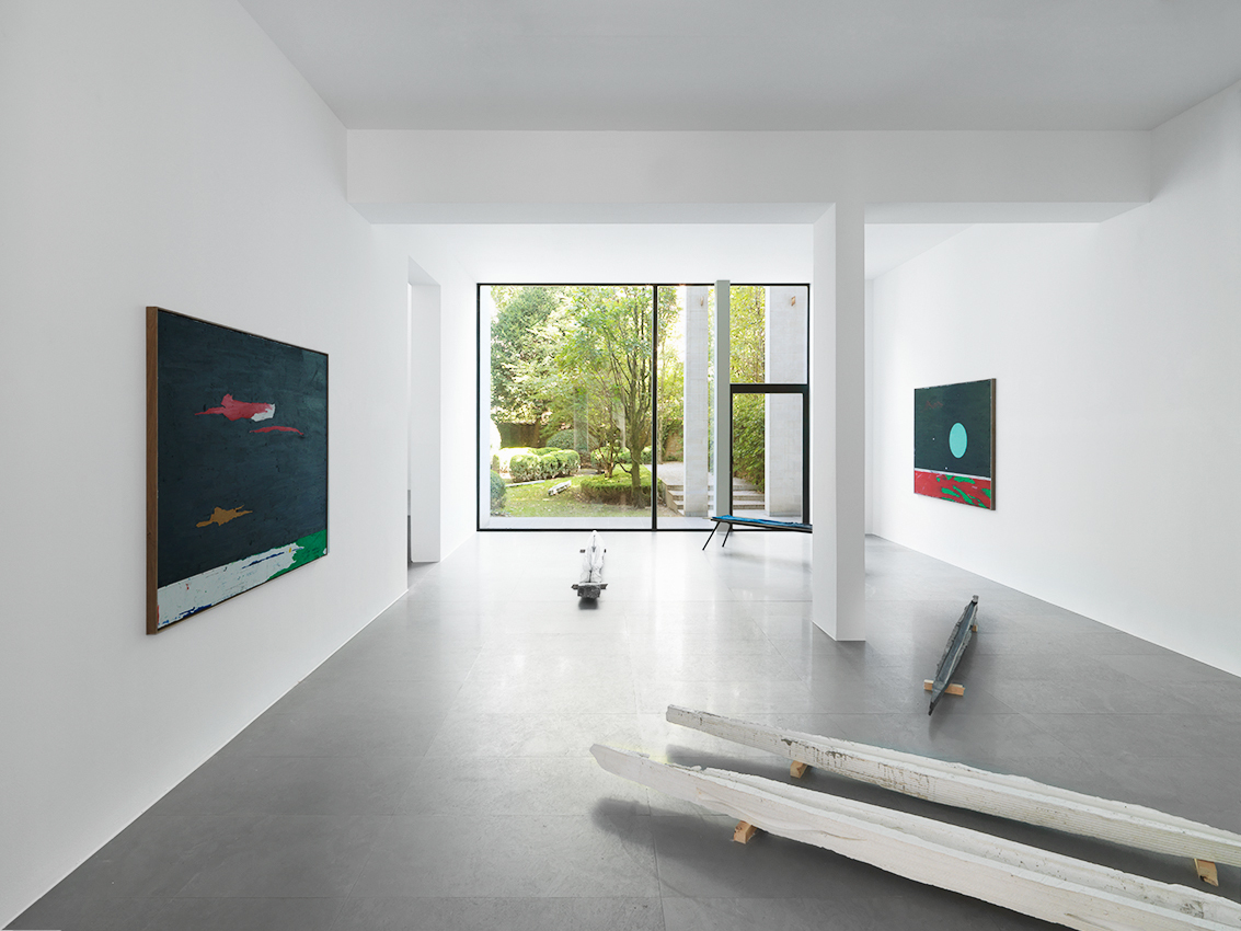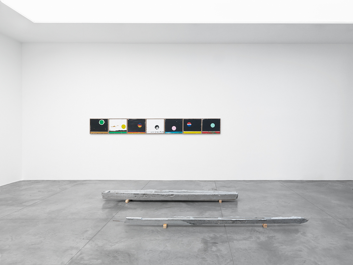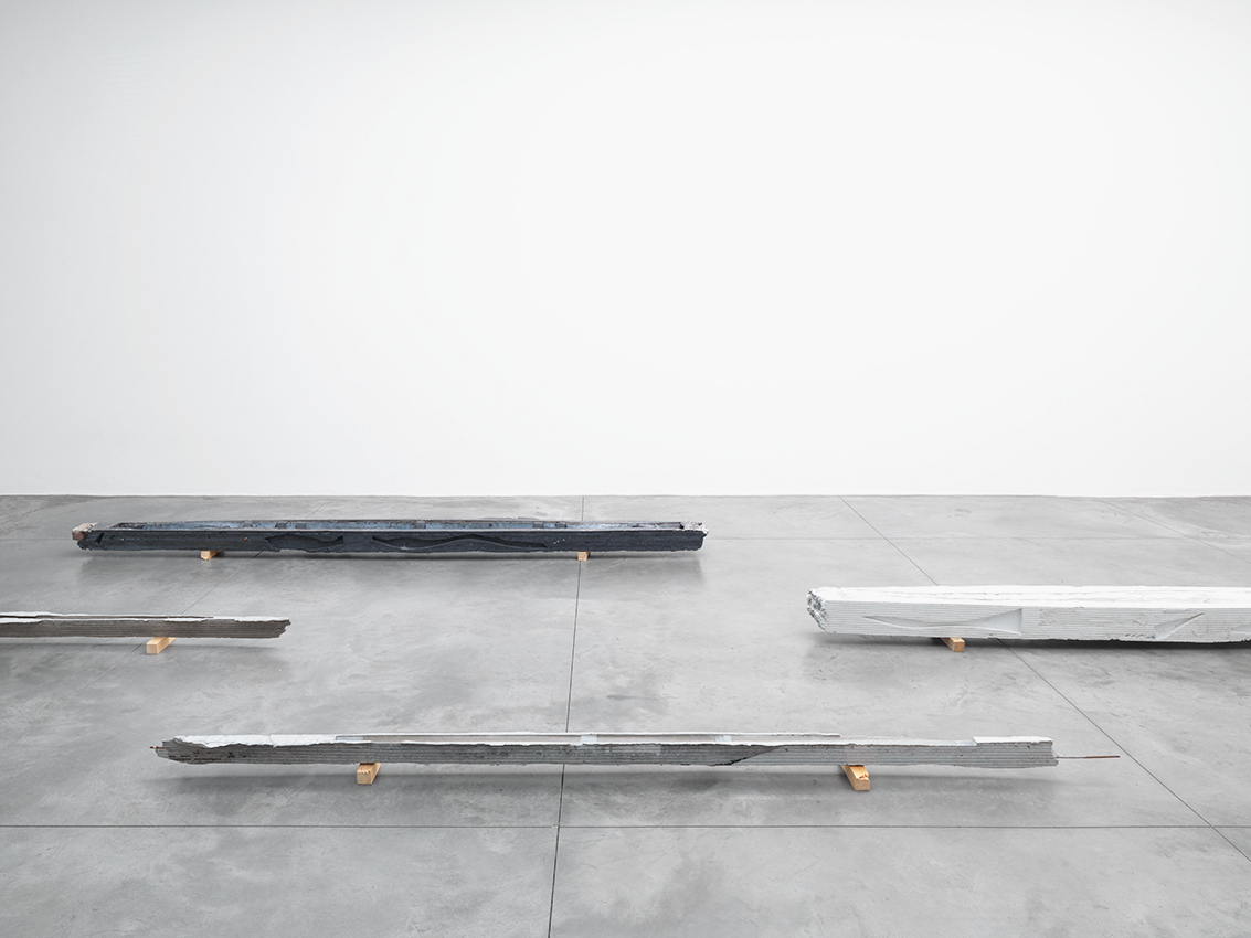 The sculptures on the floor seem to have been swept along in one and the same chromatic momentum. Previously, they kept the color of the material they were cast in, but today the concrete sculptures are pigmented. On the floor, their stretched silhouettes thus draw lines of color, which echo those we find in the pictures.