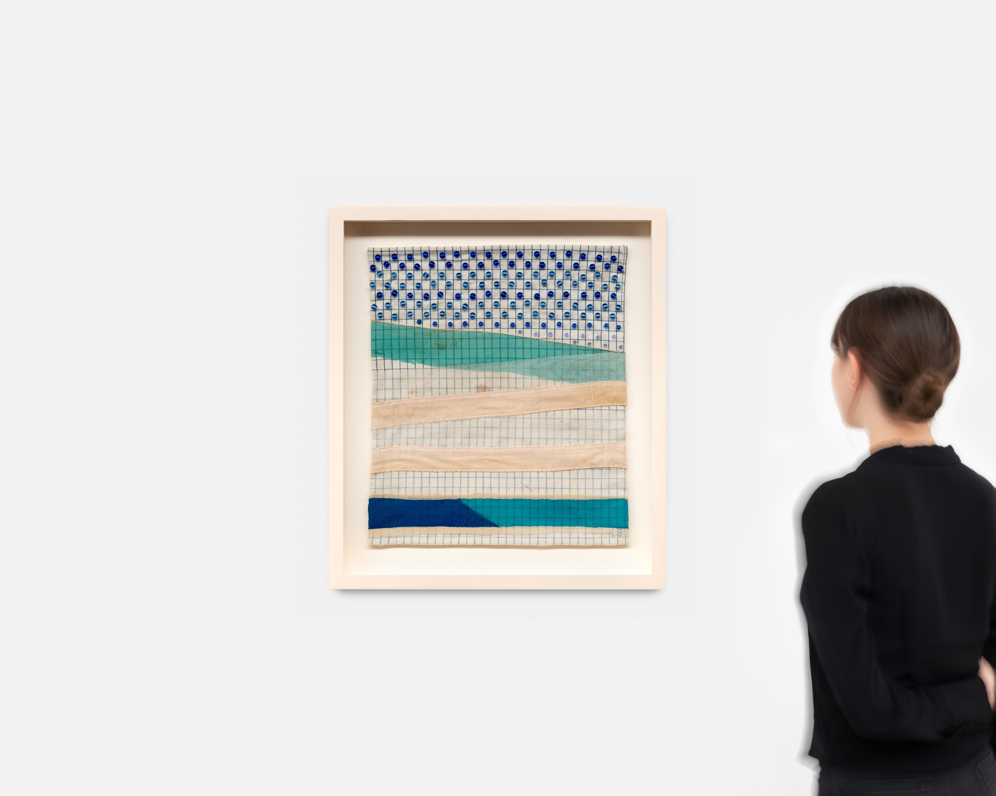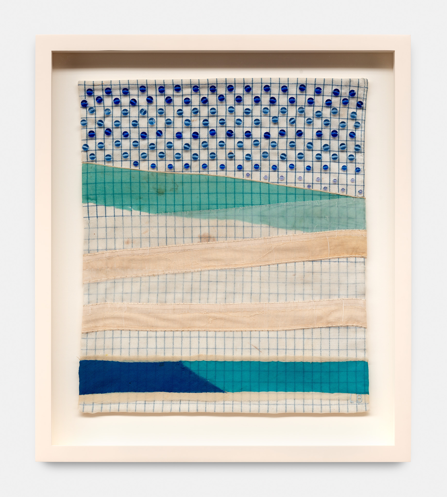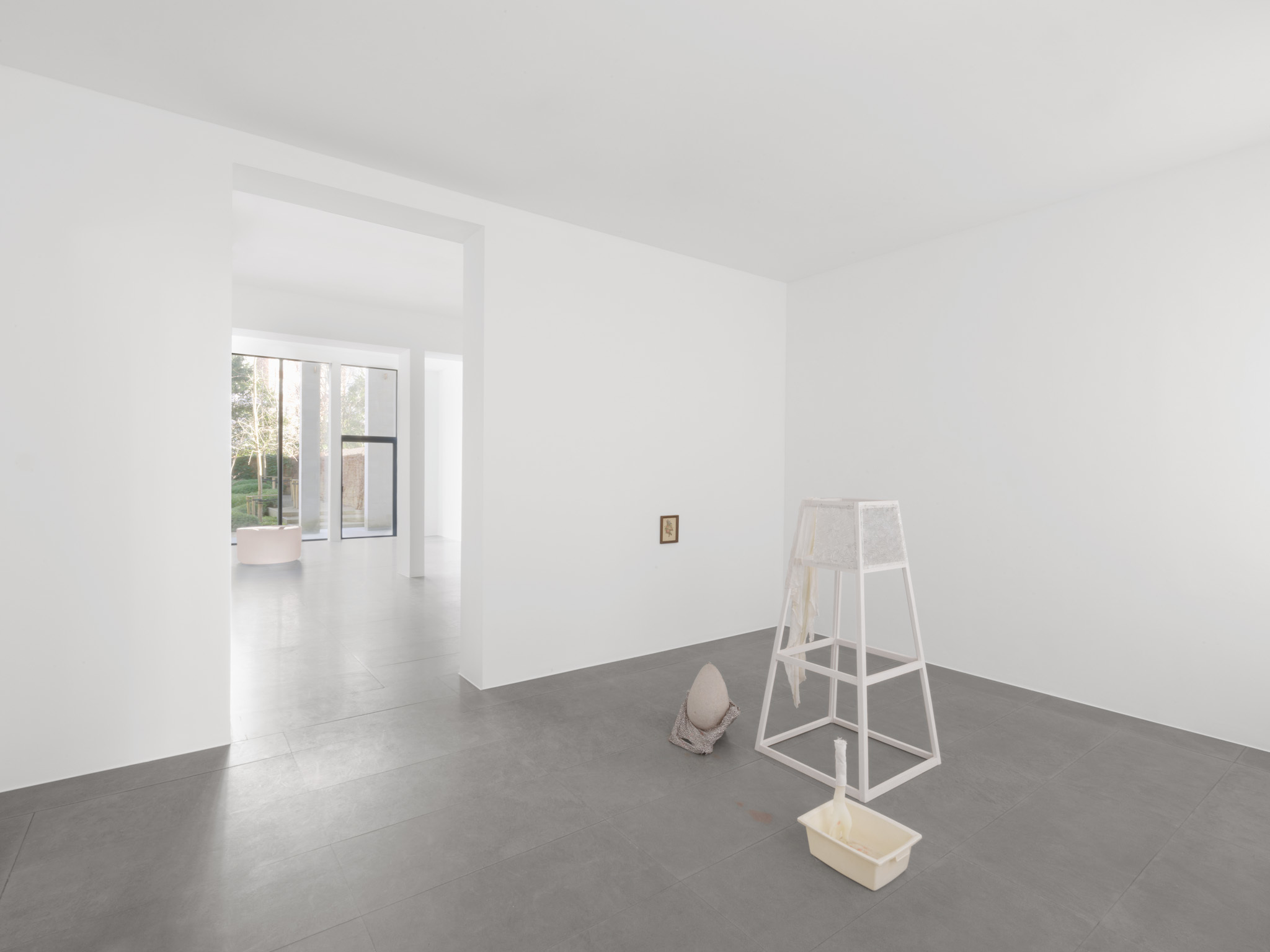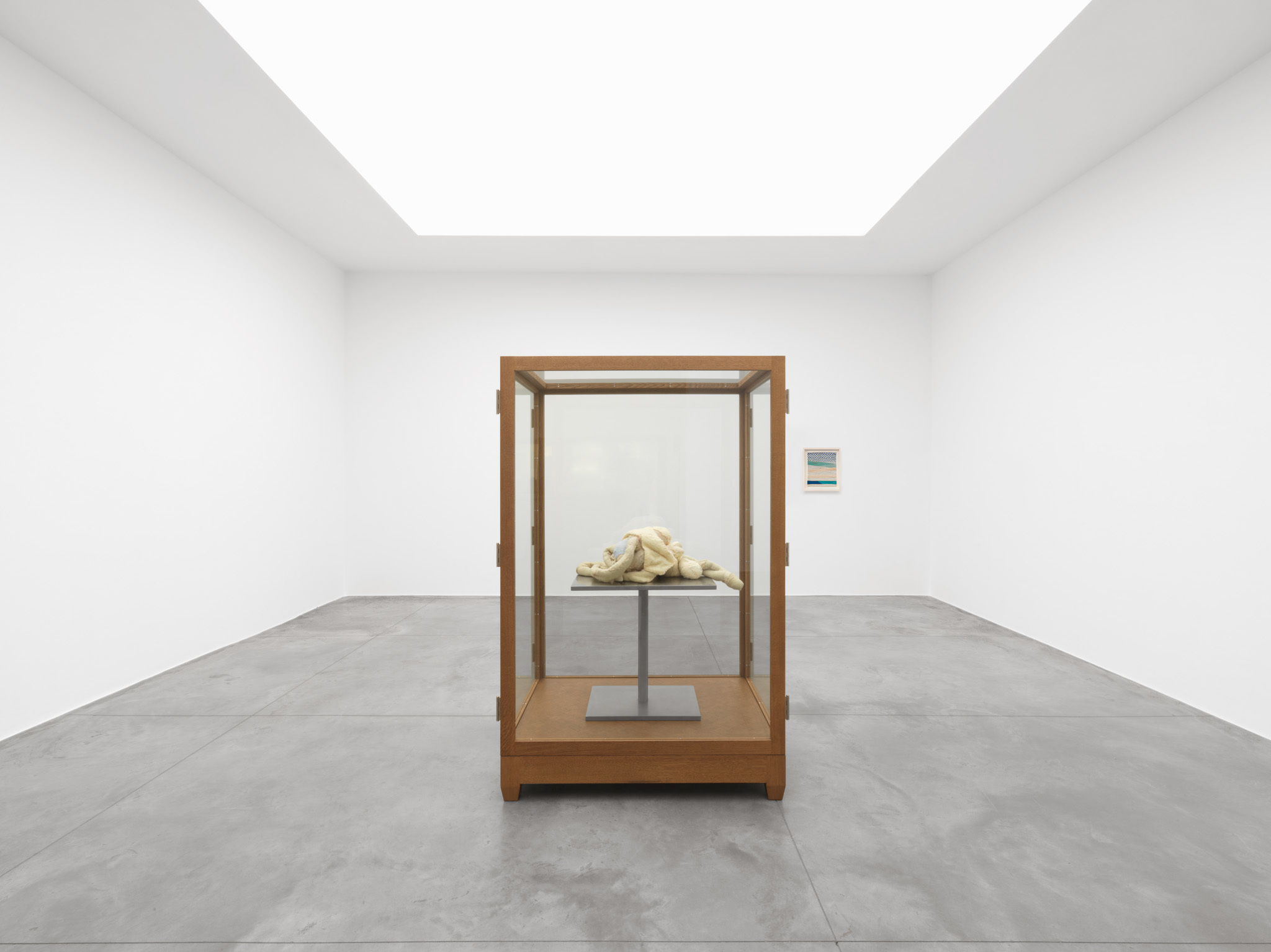 Domesticity, motherhood and the female experience are also explored by Cathy Wilkes (b. 1966). The artist is known for her meticulously composed tableaux incorporating found objects, textiles, sculpted elements and two-dimensional works, such as the salvaged print on the wall. In Untitled(2019), which was created for last year’s Venice Biennale, Wilkes nestles a swollen belly within a cloth-covered form that resembles a baby’s car seat. An isolated hand rests upon a plastic washing-up bowl. Looming above is a white tower with two contrasting additions: a tactile scrap of opaque fabric and a brittle panel of embossed glass. Wilkes’ sculpture is akin to an associative visual poem that hints at invisible states, emotions and relationships, yet is wholly open to interpretation.