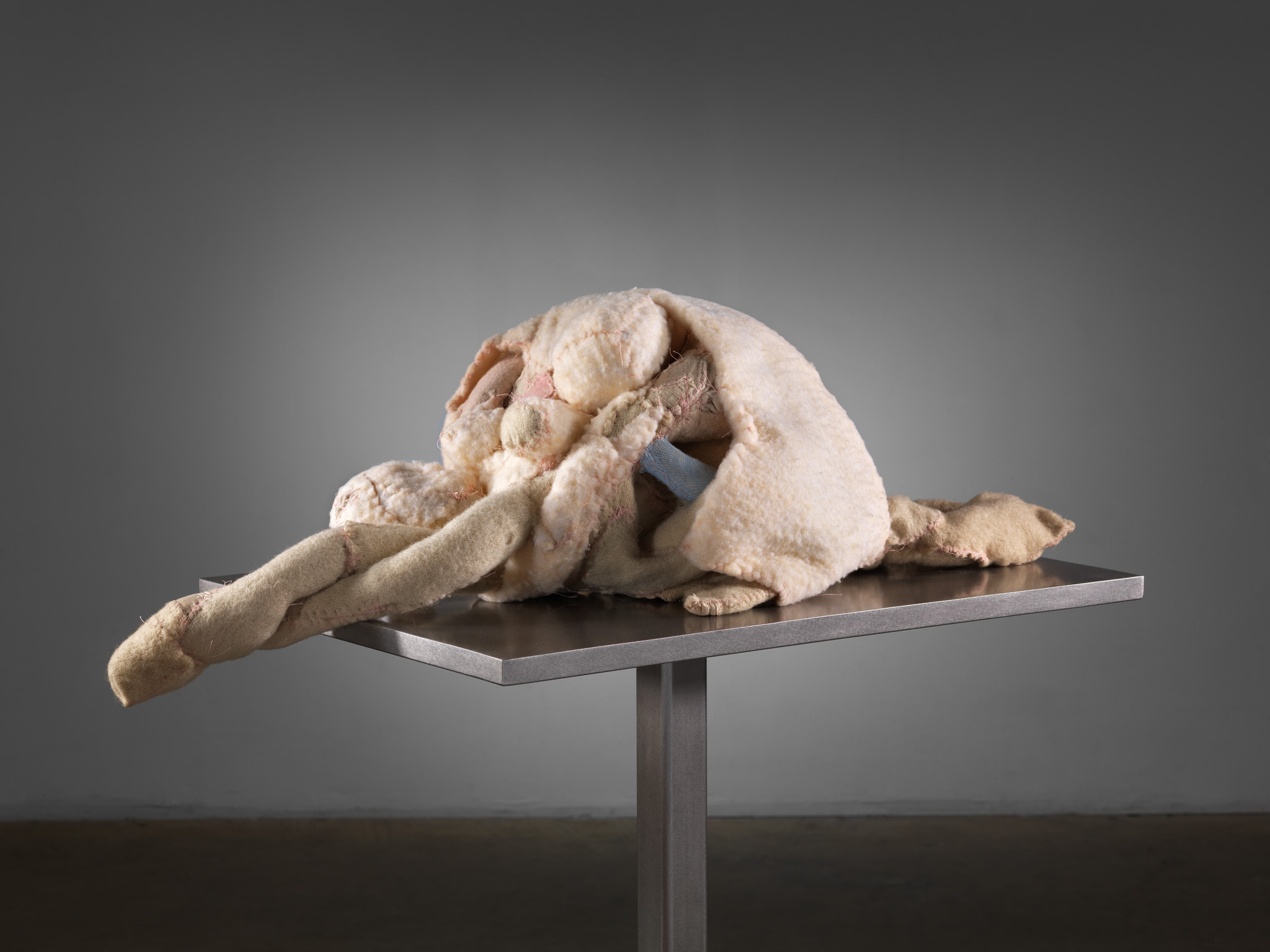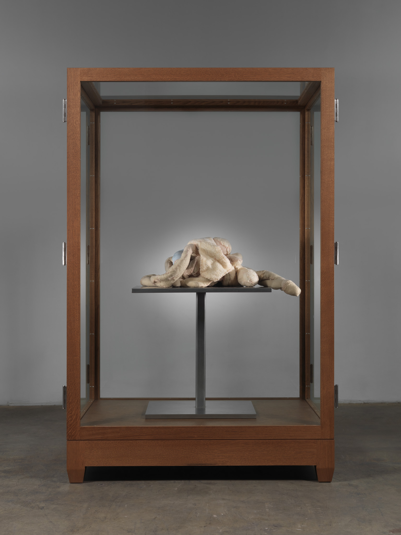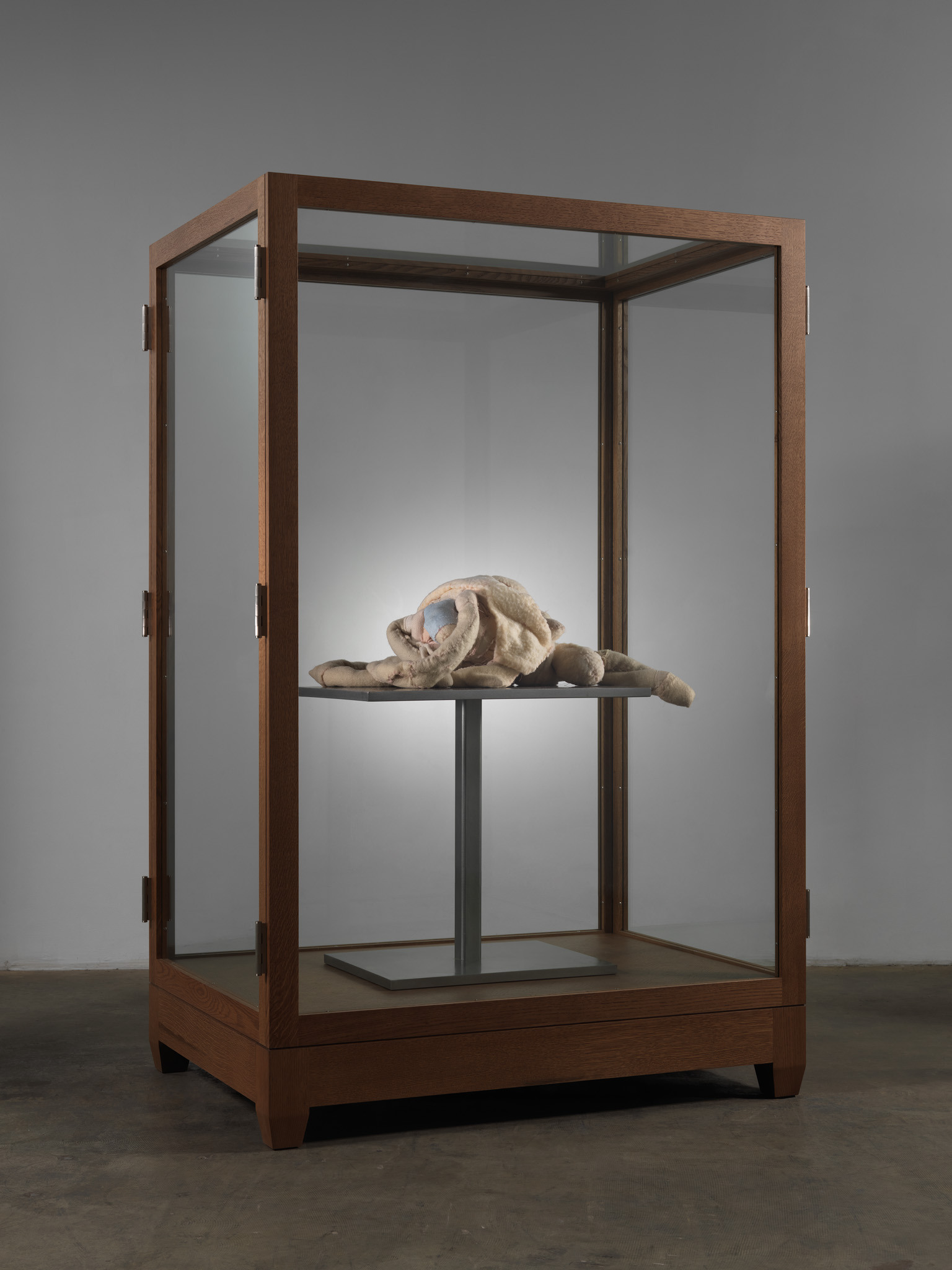 An amorphous sculpture that has been stitched together from scraps of fabric sits within an antique display case: a soft, semi-human mass of forms with accents of powder pink and baby blue, the colours associated with newborn babies. Entitled Child Devoured by Kisses (1999), this late work by Louise Bourgeois (1911-2010) conjures up a wealth of art-historical antecedents, such as Francisco Goya’s Saturn Devouring His Son (1821-1823): a startling depiction of Chronos (Romanised to Saturn in the title) who, according to Greek mythology, ate his children at birth to prevent them usurping his power. Similarly, the contours of the work evoke the lamb in Francisco de Zurbarán’s Agnus Dei (1635–1640). The sculpture’s materiality is a legacy of the artist’s childhood: Bourgeois was born into a family of tapestry restorers and some of her earliest recollections are of her mother sewing and mending. In this sculpture, Bourgeois touches upon the complicated memories of her own youth while also evoking the paradoxical horror of being literally consumed by parental affection.