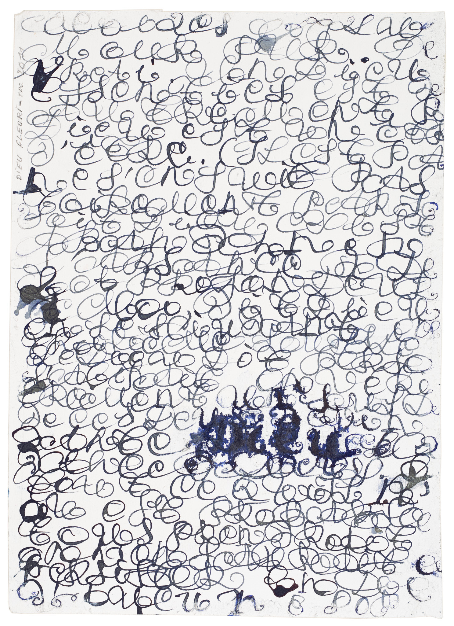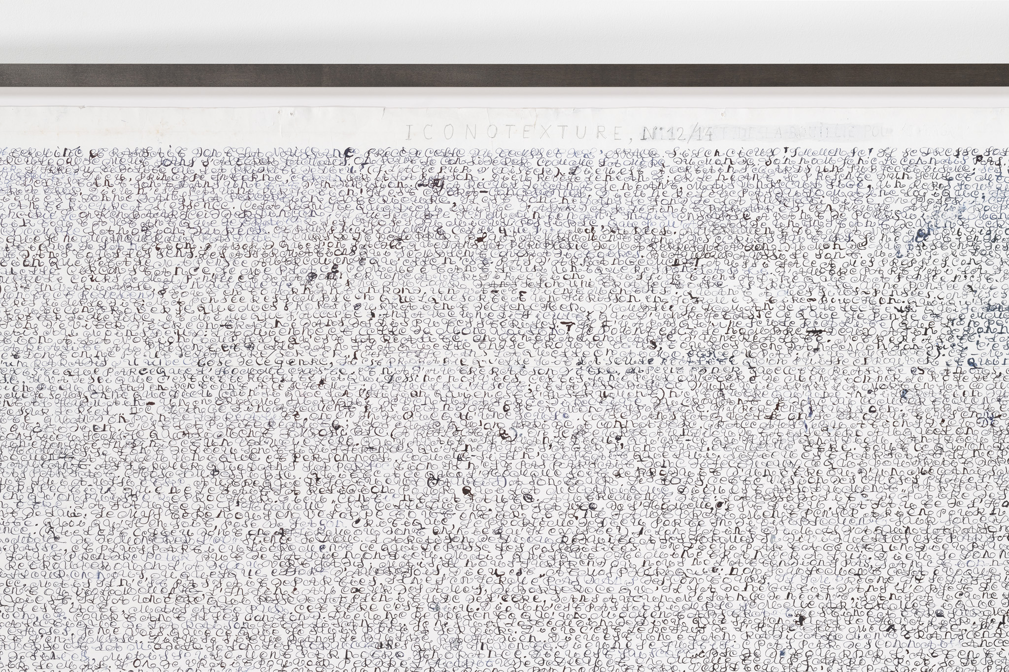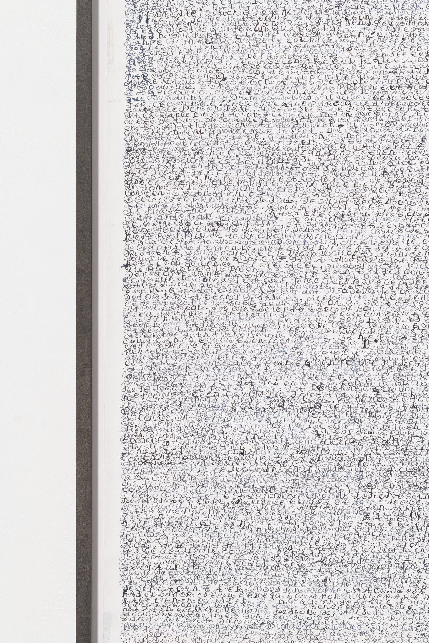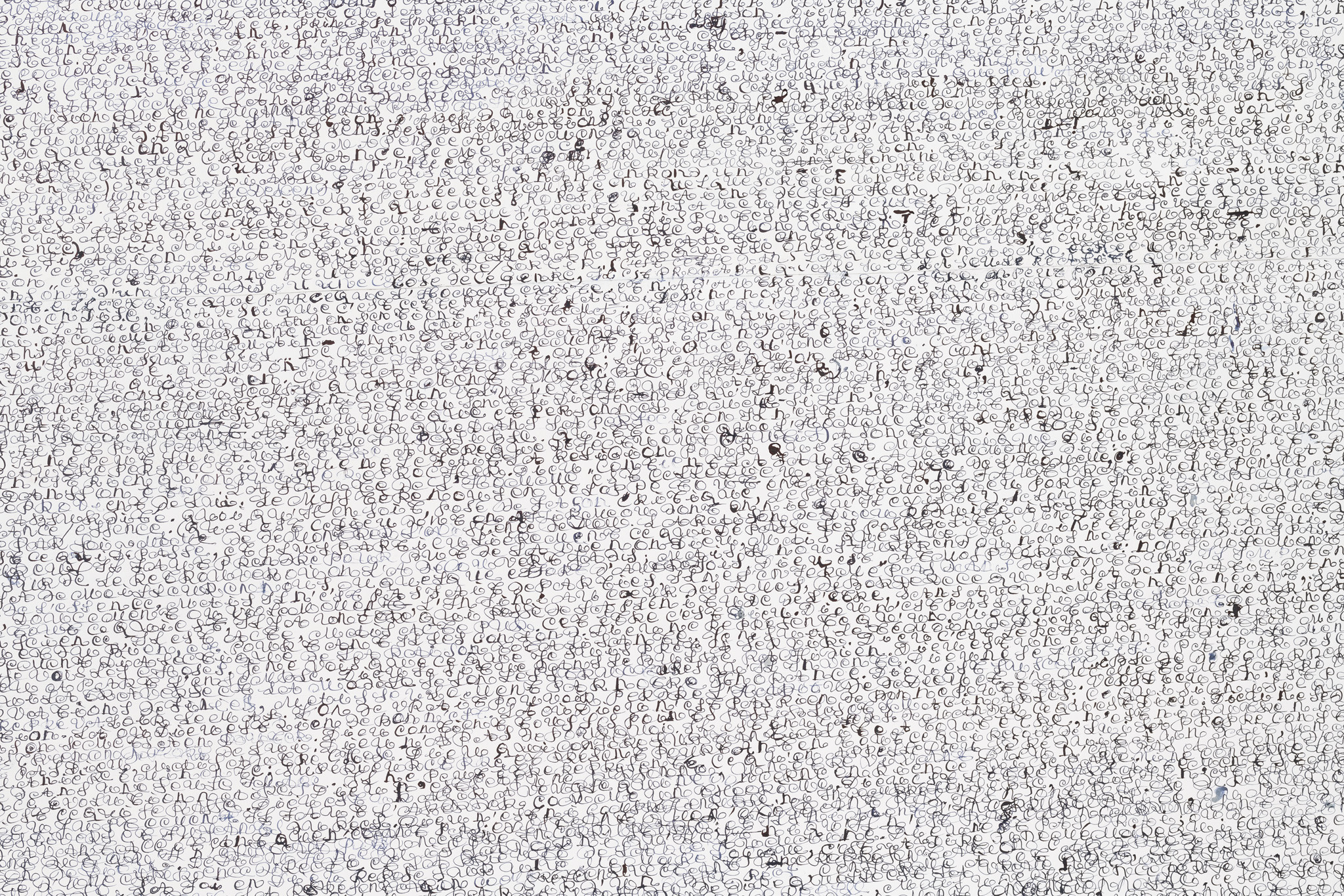 Words — and their absence — have a fundamental presence in Thierry De Cordier’s (b. 1954) Iconotextures series: a recent group of panels filled with swathes of dark blue calligraphy that ultimately give way to a tabula rasa, a void, absolute emptiness. The text works are composed of illogical definitions of God. Oscillating between the absurd and the sacred, the words become the spiritual medium of an image that strives to materialise the invisible. The large white works are ultimately empty surfaces that form, as it were, a diptych, suggesting the end of the series. When the words disappear altogether, De Cordier is expressing the futility of attempting to define God, saying: ‘Rien, ou presque… Dieu c’est absolument rien, mais en très grand!’