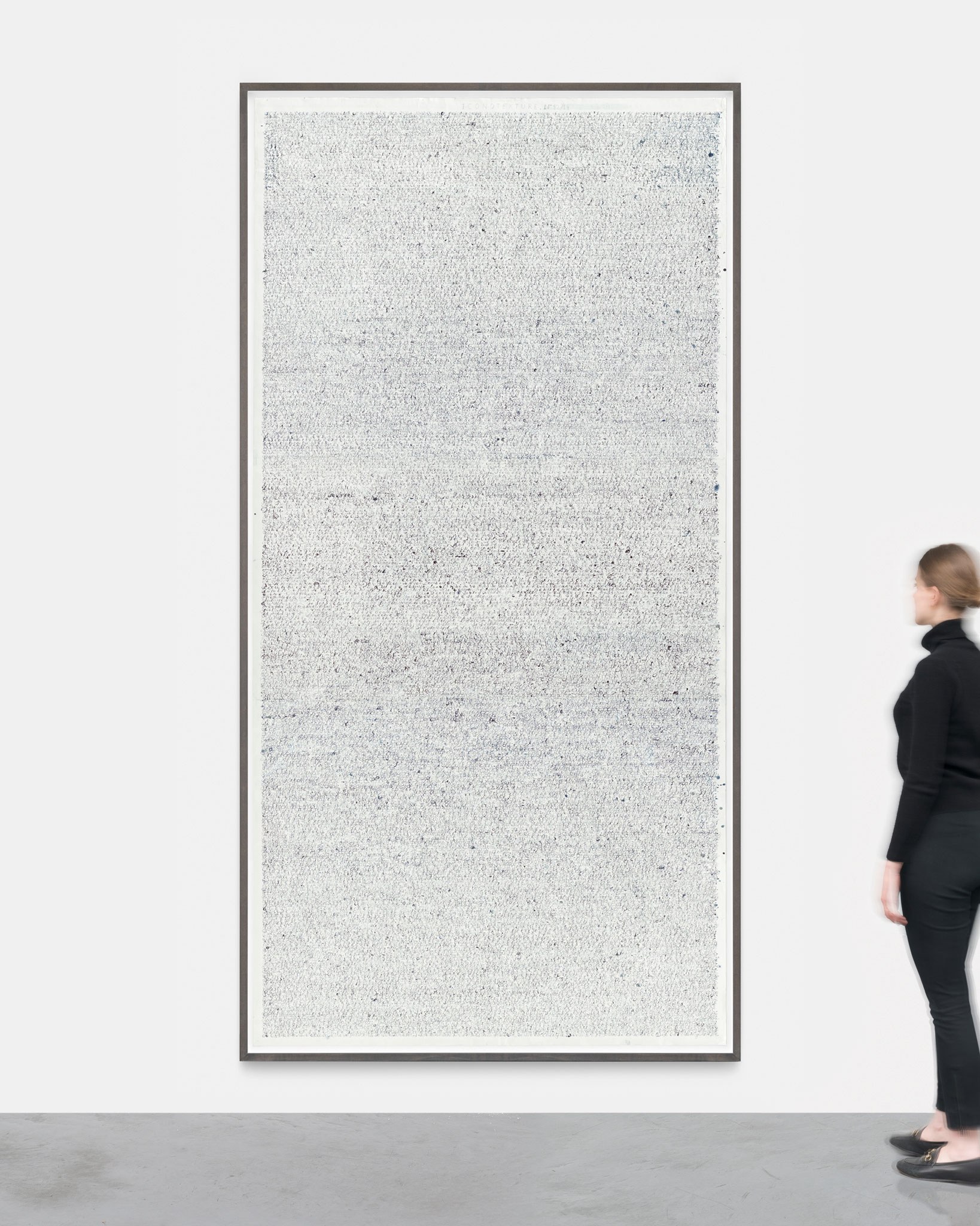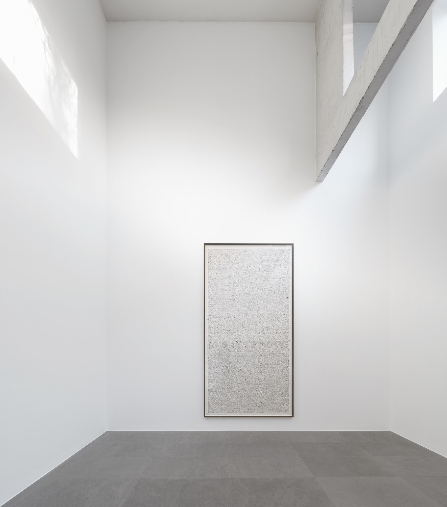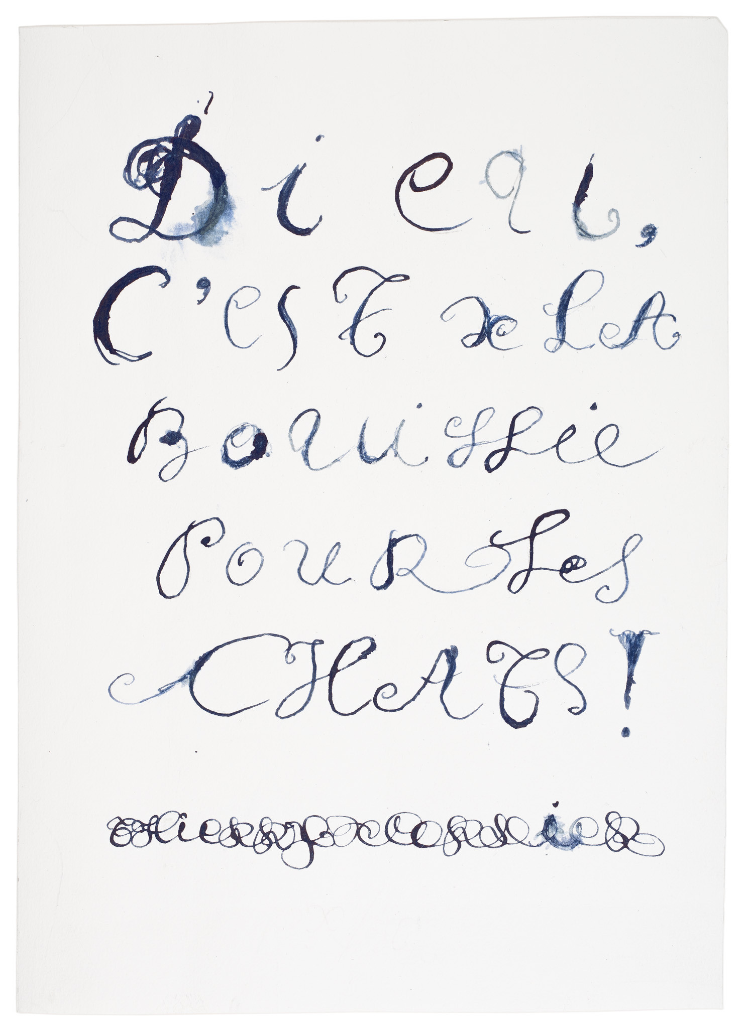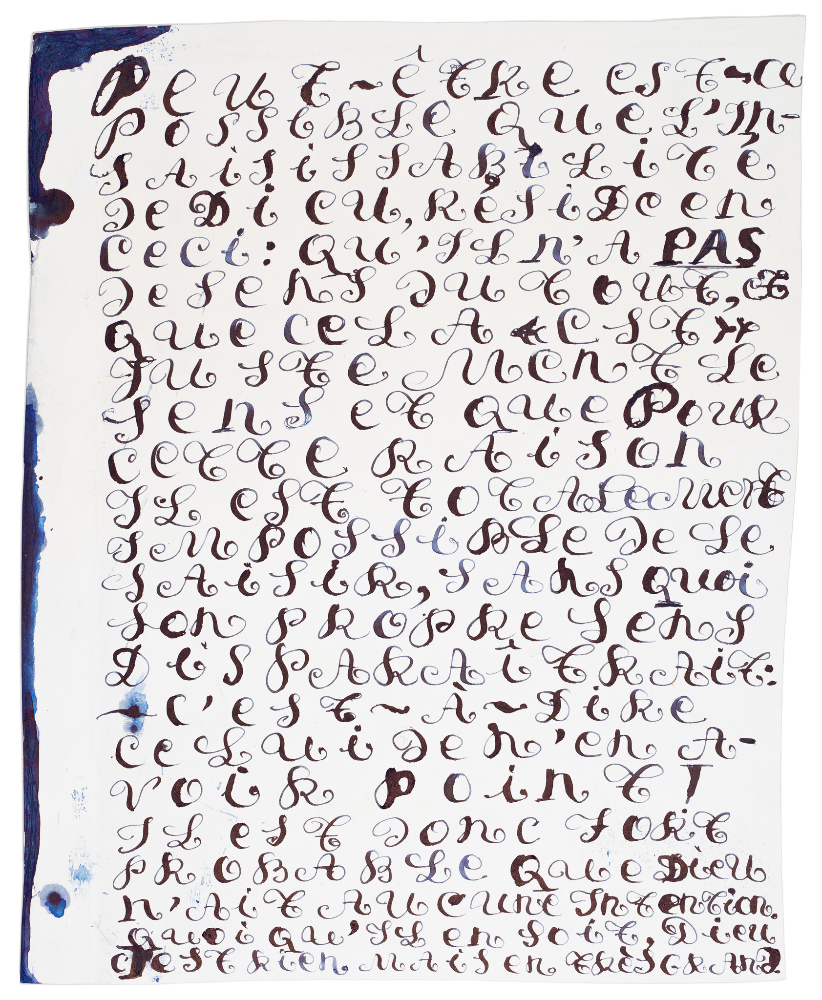 Words — and their absence — have a fundamental presence in Thierry De Cordier’s (b. 1954) Iconotextures series: a recent group of panels filled with swathes of dark blue calligraphy that ultimately give way to a tabula rasa, a void, absolute emptiness. The text works are composed of illogical definitions of God. Oscillating between the absurd and the sacred, the words become the spiritual medium of an image that strives to materialise the invisible. The large white works are ultimately empty surfaces that form, as it were, a diptych, suggesting the end of the series. When the words disappear altogether, De Cordier is expressing the futility of attempting to define God, saying: ‘Rien, ou presque… Dieu c’est absolument rien, mais en très grand!’