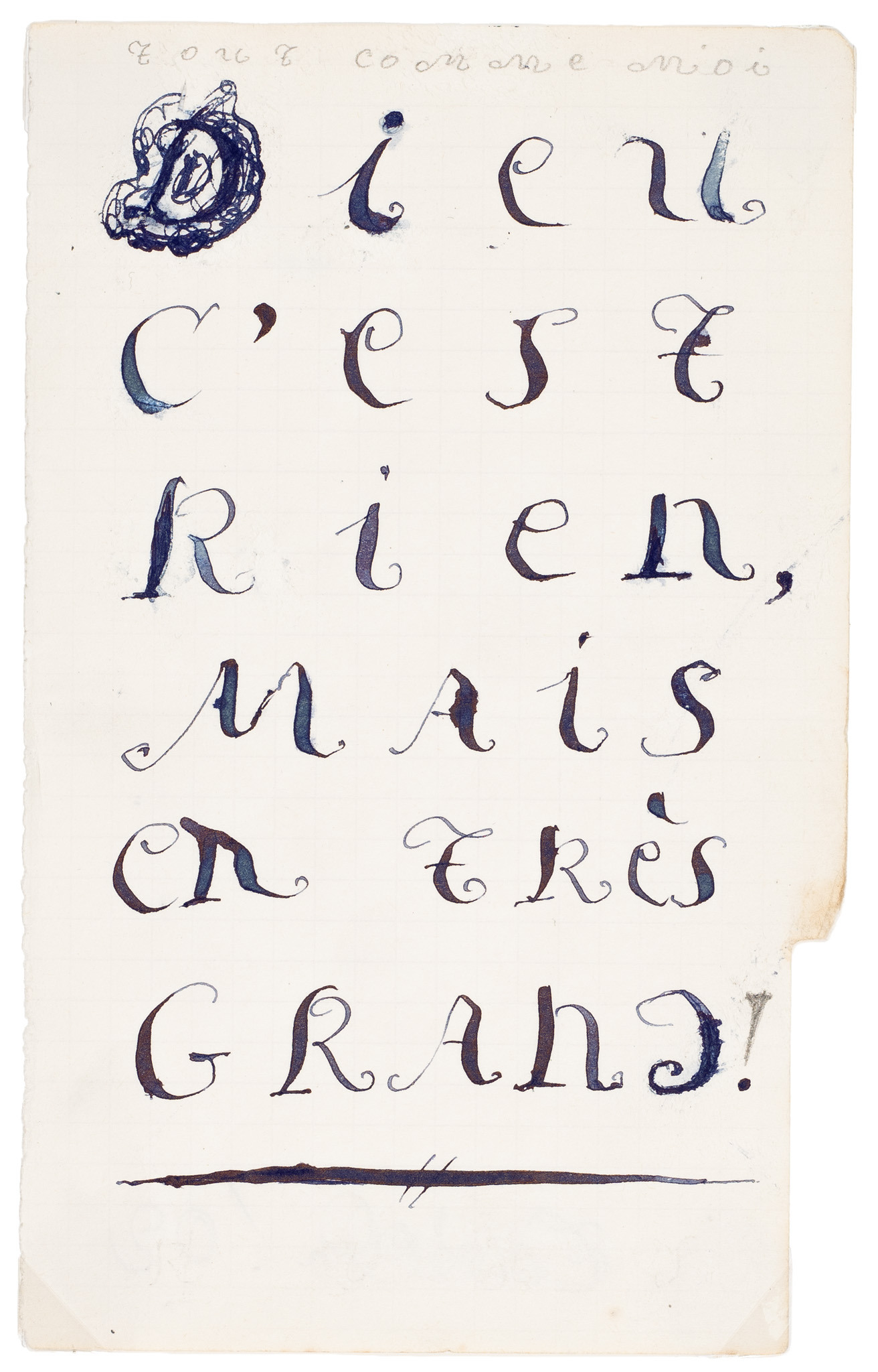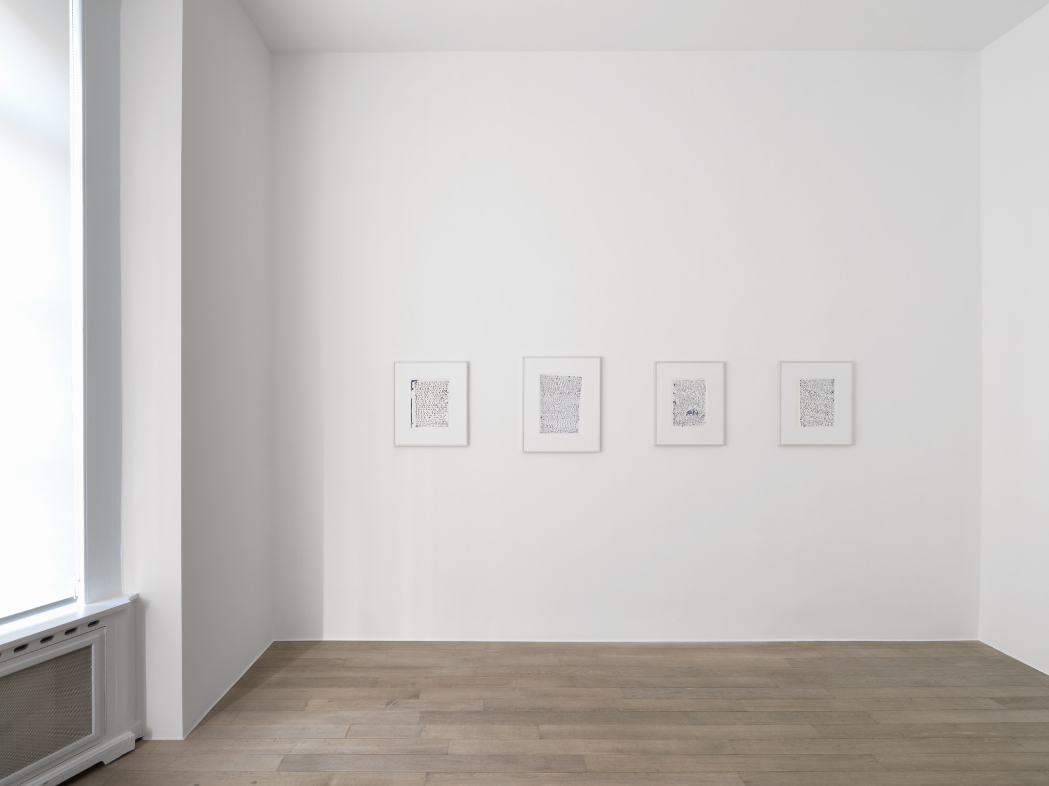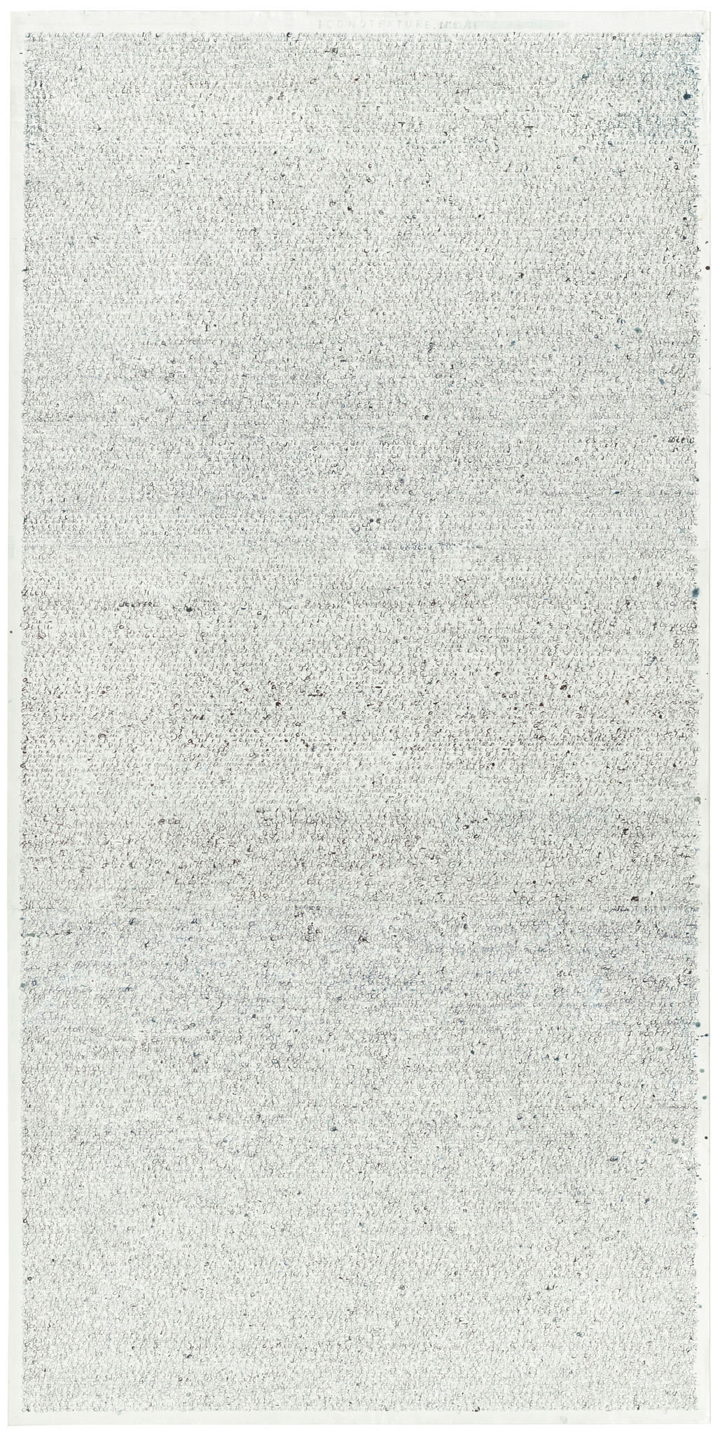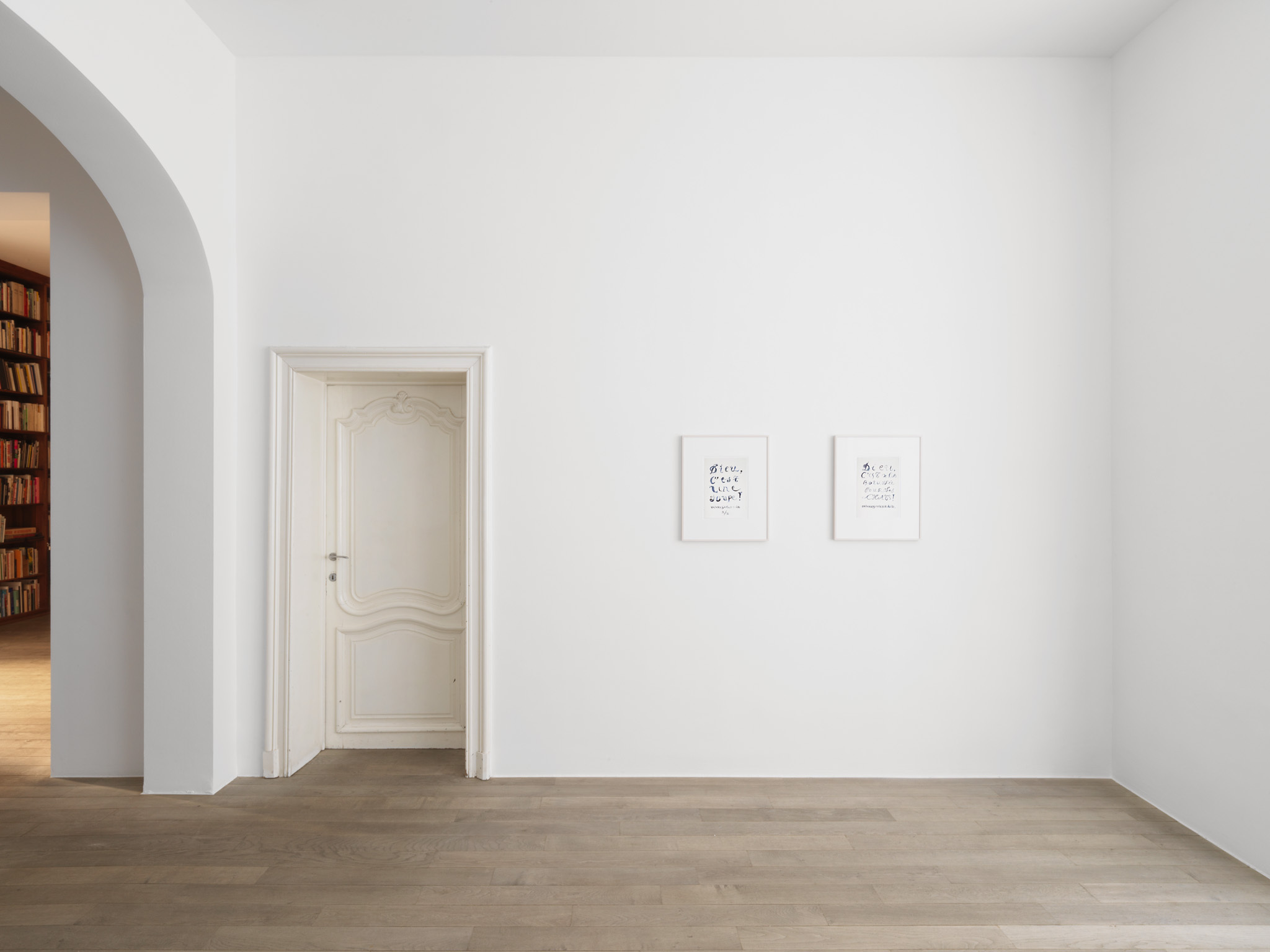 Words — and their absence — have a fundamental presence in Thierry De Cordier’s (b. 1954) Iconotextures series: a recent group of panels filled with swathes of dark blue calligraphy that ultimately give way to a tabula rasa, a void, absolute emptiness. The text works are composed of illogical definitions of God. Oscillating between the absurd and the sacred, the words become the spiritual medium of an image that strives to materialise the invisible. The large white works are ultimately empty surfaces that form, as it were, a diptych, suggesting the end of the series. When the words disappear altogether, De Cordier is expressing the futility of attempting to define God, saying: ‘Rien, ou presque… Dieu c’est absolument rien, mais en très grand!’