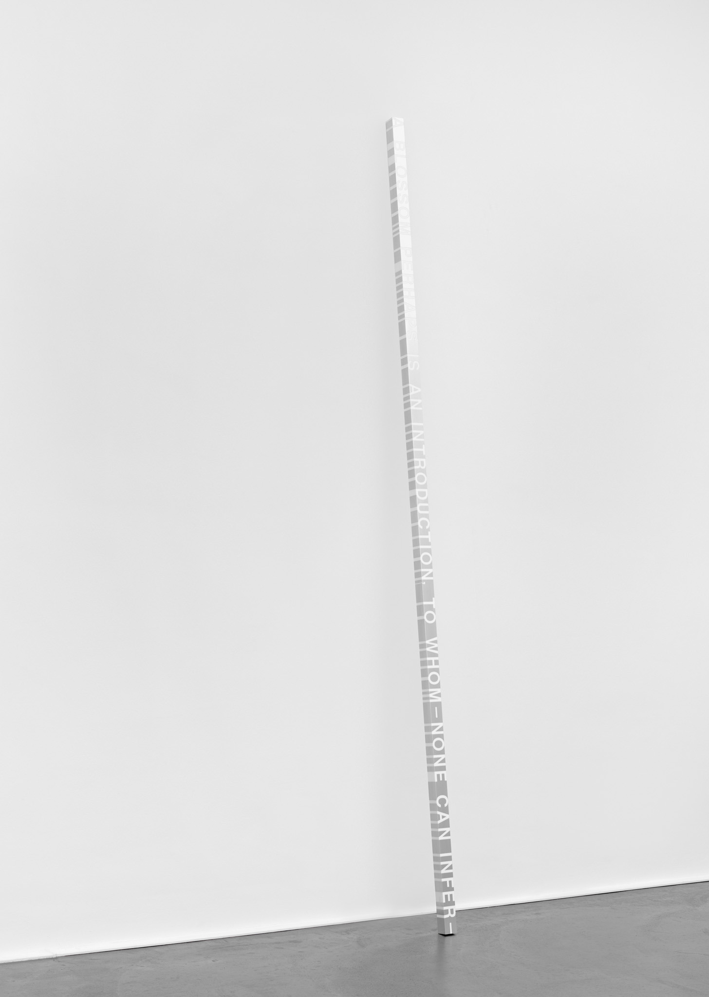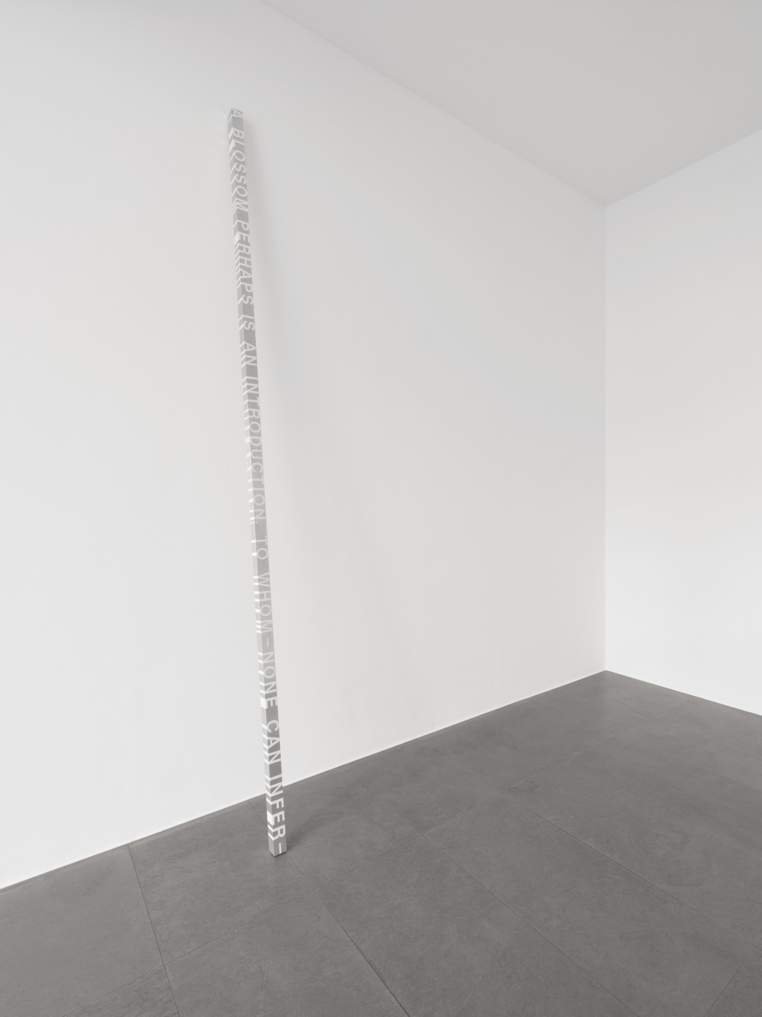 Roni Horn (b. 1955) uses a radically different language — that of minimalism — to create works that are austere but no less poetic. White Dickinson, A BLOSSOM PERHAPS IS AN INTRODUCTION, TO WHOM, NONE CAN INFER (2006-2007) is one of a series of sculptures featuring extracts from the letters of the nineteenth-century American poet, Emily Dickinson. Horn is drawn to the ‘heightened sensibility’ of her prose and lends it solid form by embedding the words in aluminium. Propped against the wall, the text is legible from the front and back but reduced to lines when approached side-on. Untitled (‘But the boomerang that returns is not the same one I threw.’) (2013-2017) belongs to a corpus of cast glass sculptures that are linked by the inclusion of literary quotes in their titles, in this case a line from Sputnik Sweetheart by Haruki Murakami. Resembling an ever-changing pool of water, this sensory work fluctuates with the light: at times appearing opaque, at others translucent. It is both textured (where the sides touched the mould) as well as highly reflective (where the glass was only exposed to the air during casting). By giving transient states a solid yet mutable form, Horn suggests that nothing is ever truly fixed. As she has stated in the past: ‘It isn’t two things. It’s everything. It’s synthesis; not this and that. It’s a state of integration.’