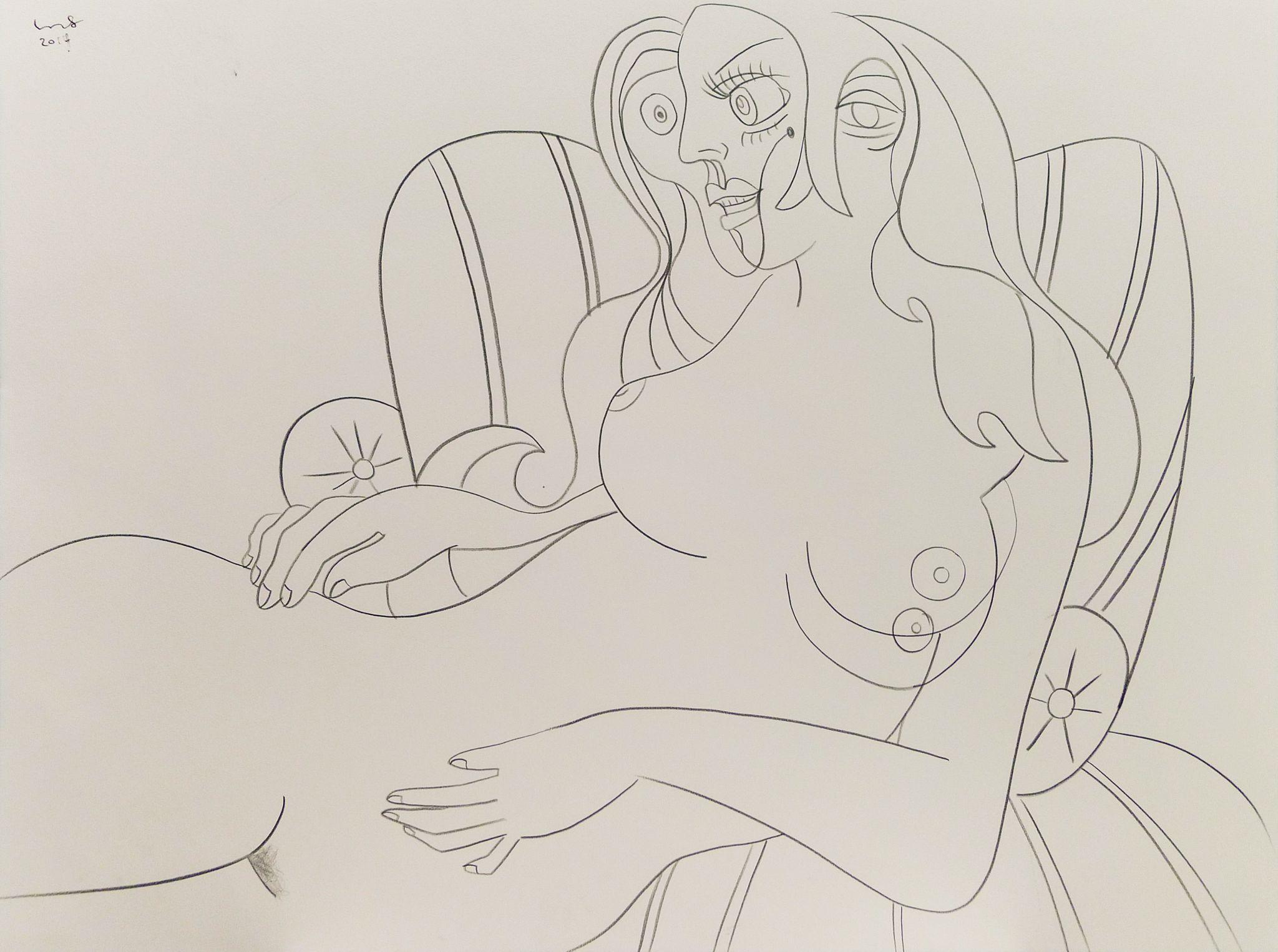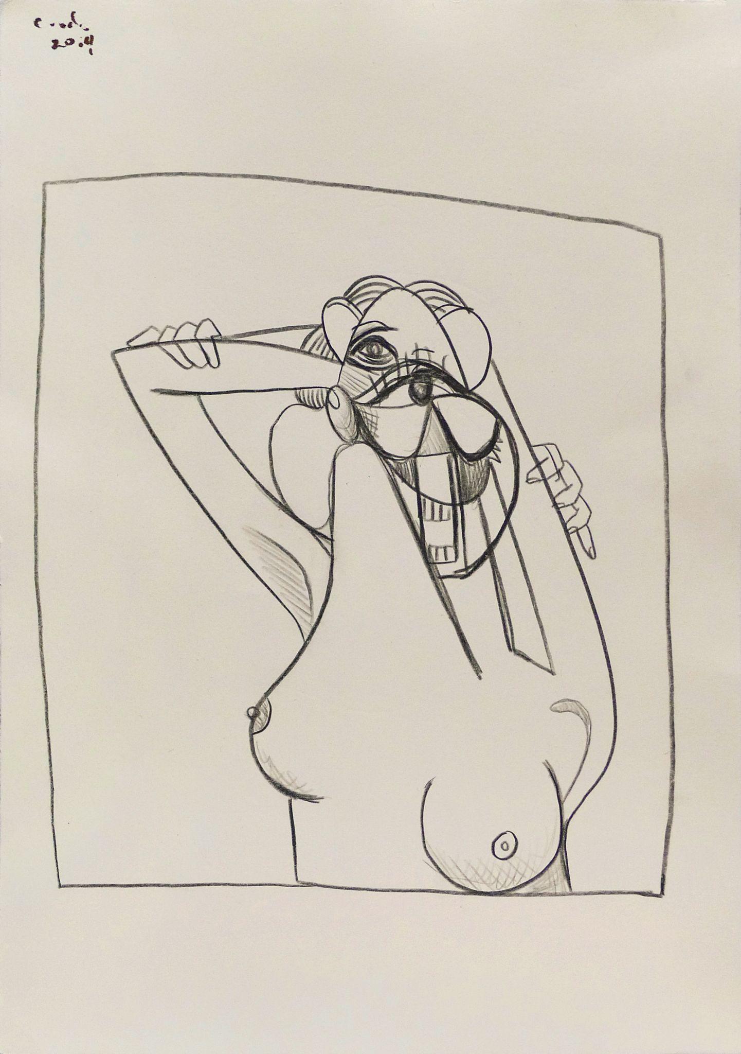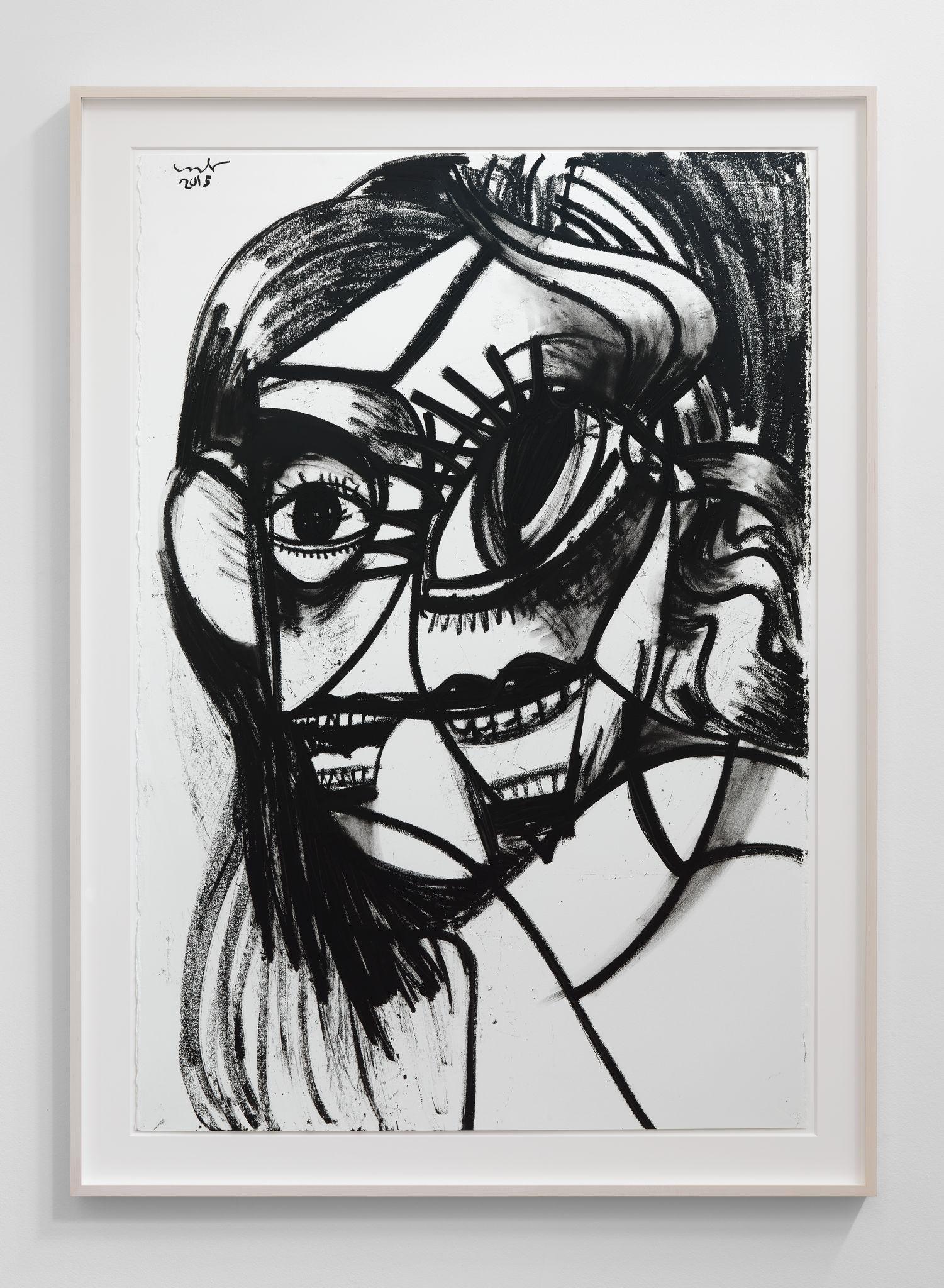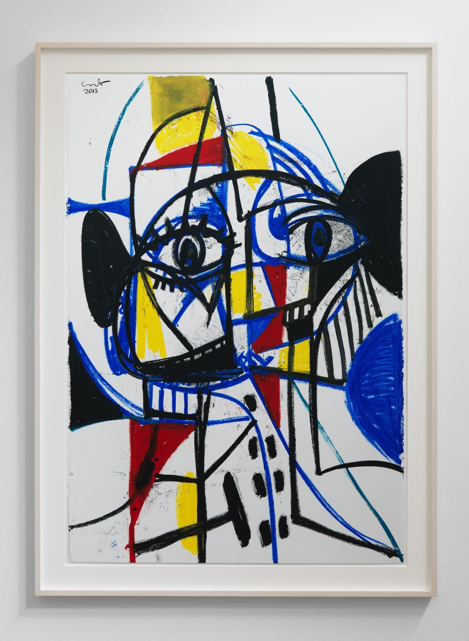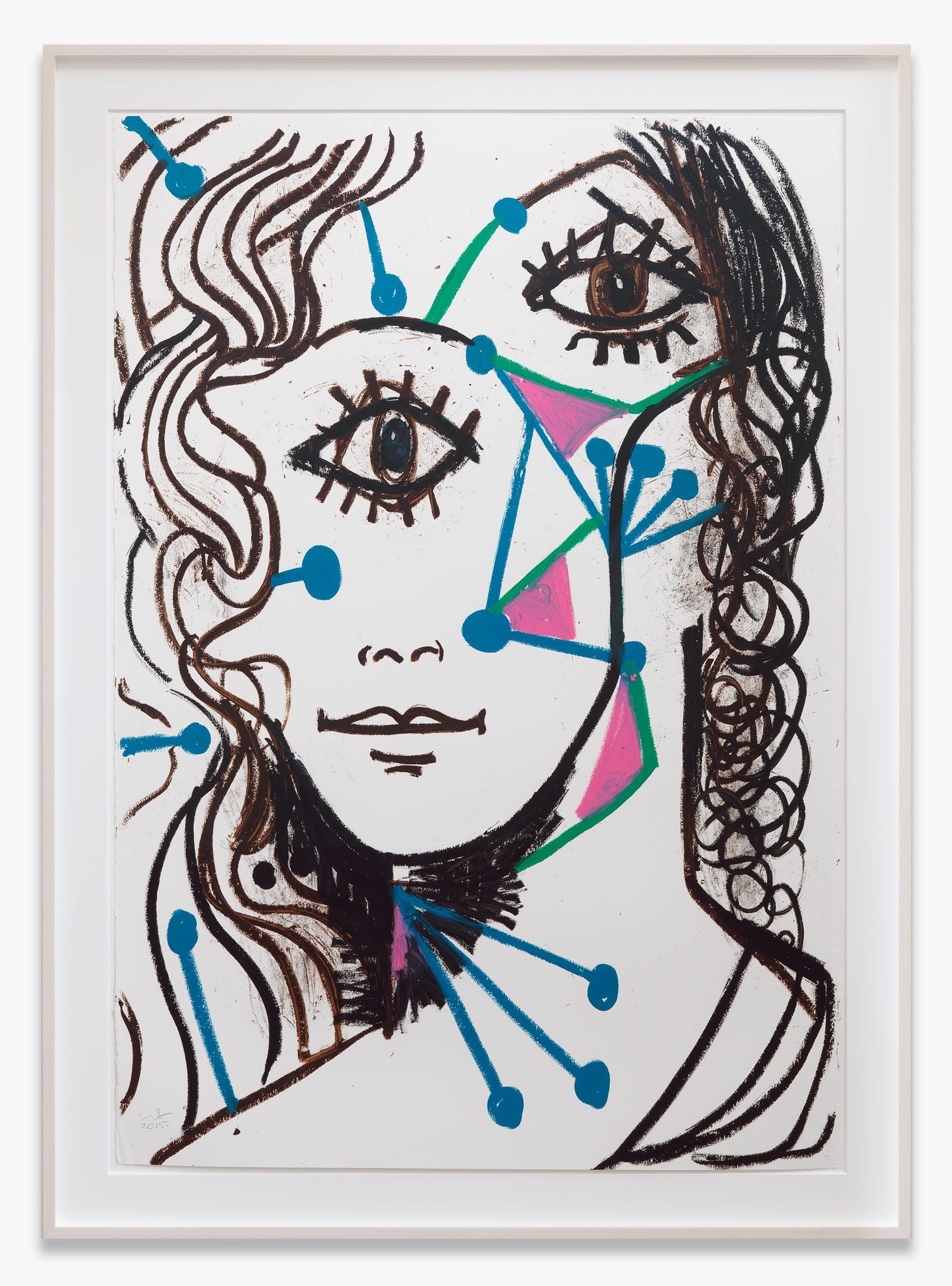 His compositions are imaginary constructs that, on the one hand, open a window onto an inner world. On the other hand, they also reveal an objective, outward-looking dialogue with art history and popular culture. It is a conversation that has provided him with a rich wellspring of inspiration throughout his thirty-year career, not only with regard to subject matter, but also in terms of approach and technique. Condo’s interaction with the work of his predecessors is the leitmotiv that runs throughout his highly diverse and idiosyncratic oeuvre, one that has seen him ‘borrow’ freely from the art-historical canon in order to express complex and conflicting emotional states, or to expose contemporary political, cultural and social mores. While the works in this exhibition share many similarities with his paintings – figuration, portraiture, fragmentation, caricature – they nevertheless betray a shift, and mark a resurgence of Condo’s engagement with the work of Picasso. At the same time, they are also informed by his abiding interest in popular American culture, including Playboy magazine, comics and cartoons.