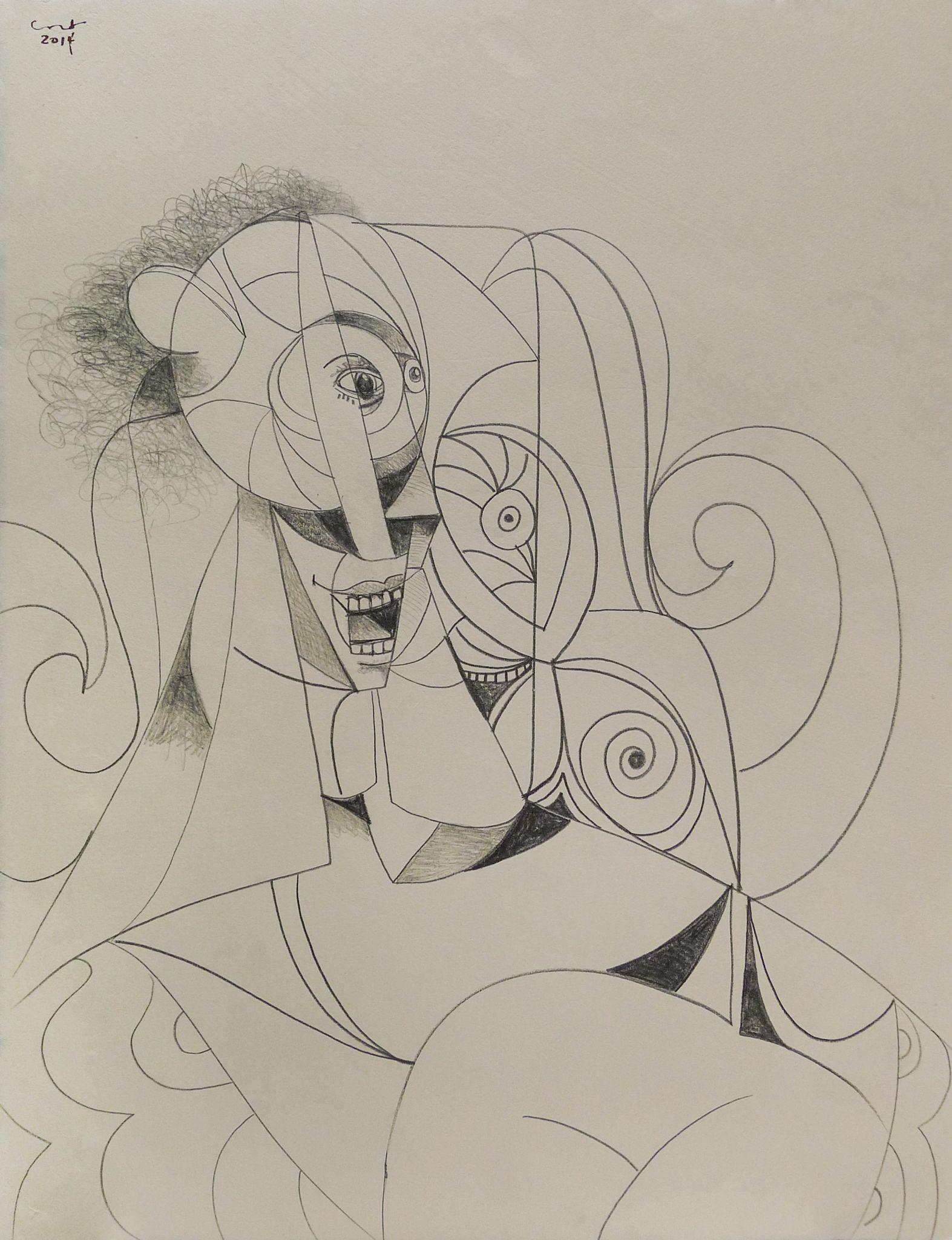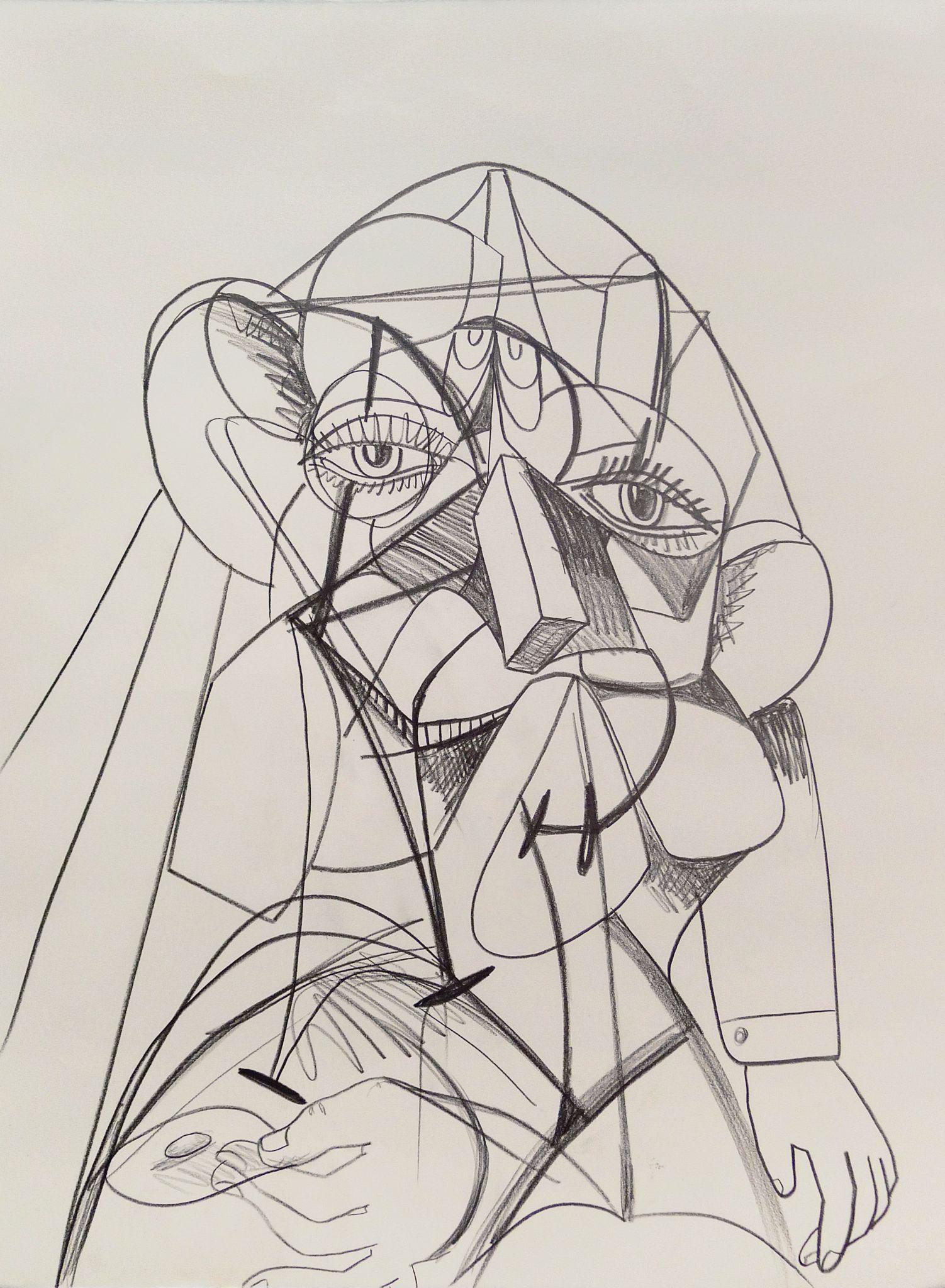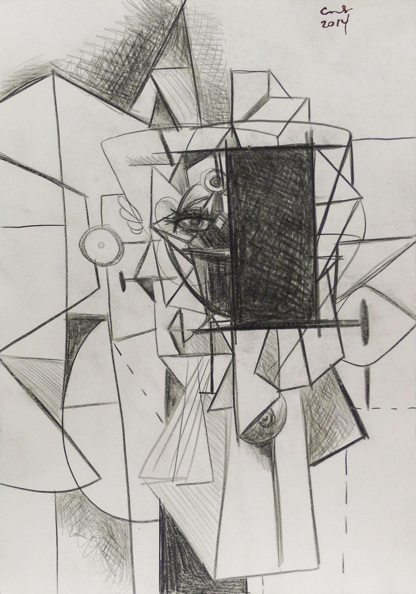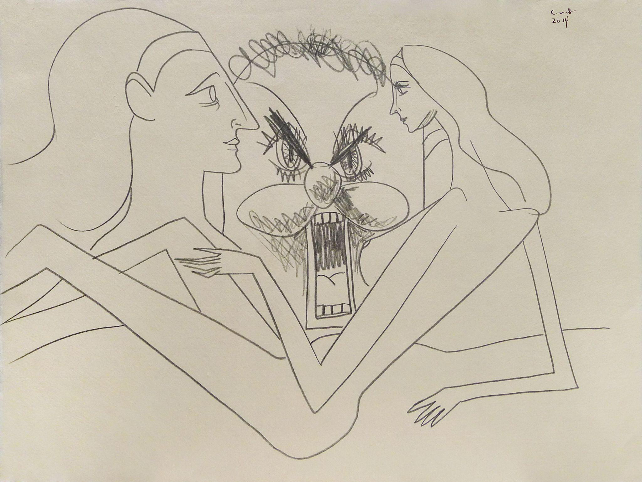 The formal correspondences between Condo’s drawings and Picasso’s cubist period are self-evident, although Condo prefers to define his own art as ‘psychological cubism’. He has said: ‘Picasso painted a violin from four different perspectives at one moment. I do the same with psychological states. Four of them can occur simultaneously… hysteria, joy, sadness, and desperation. If you could see these things at once that would be like what I’m trying to make you see in my art.’