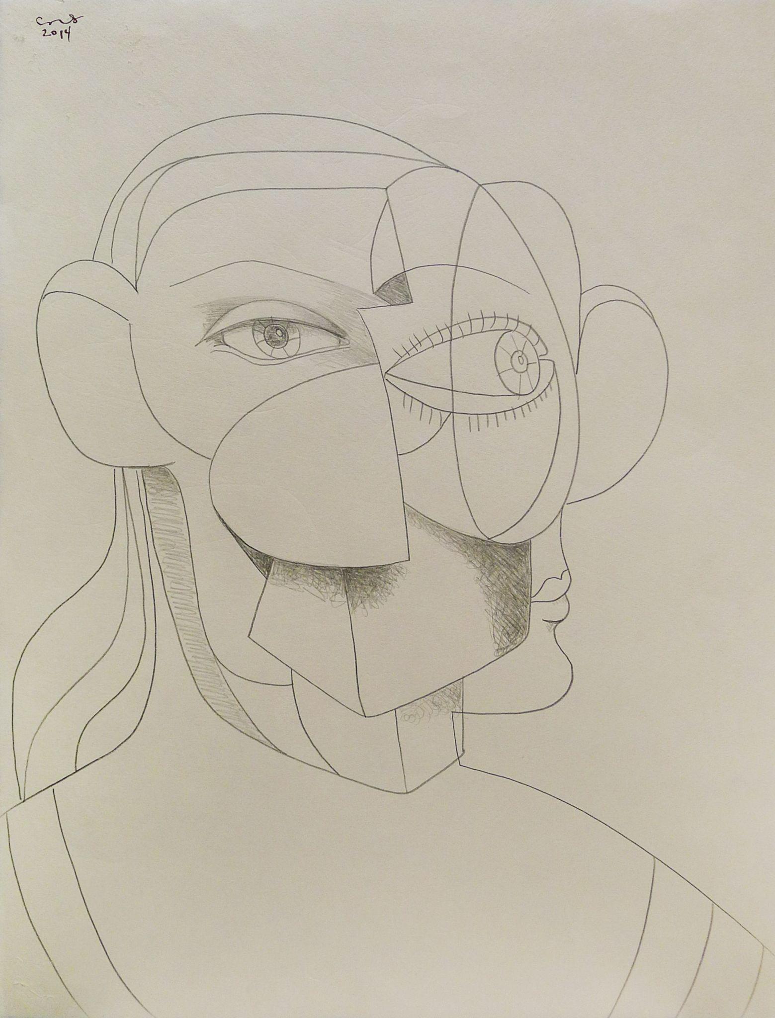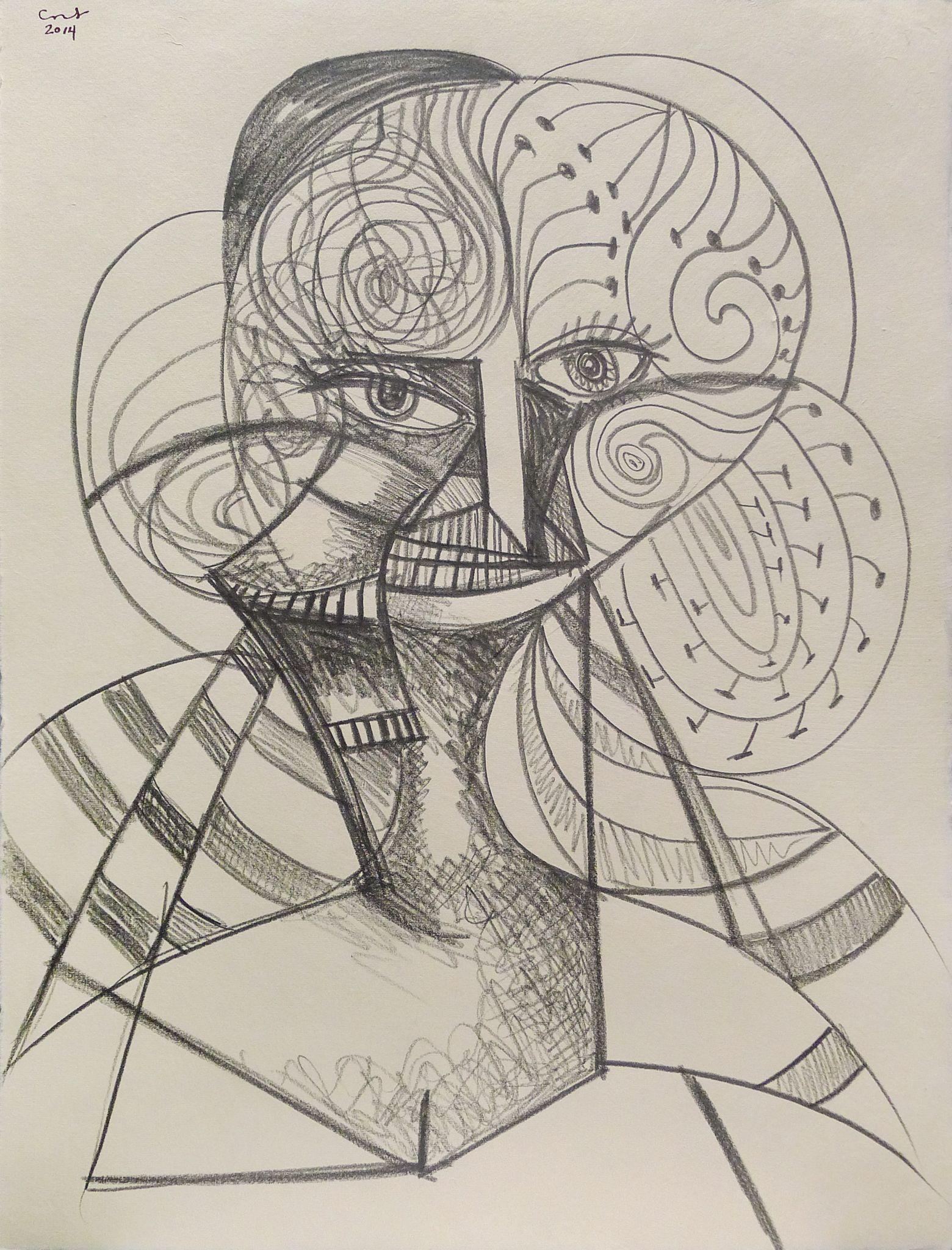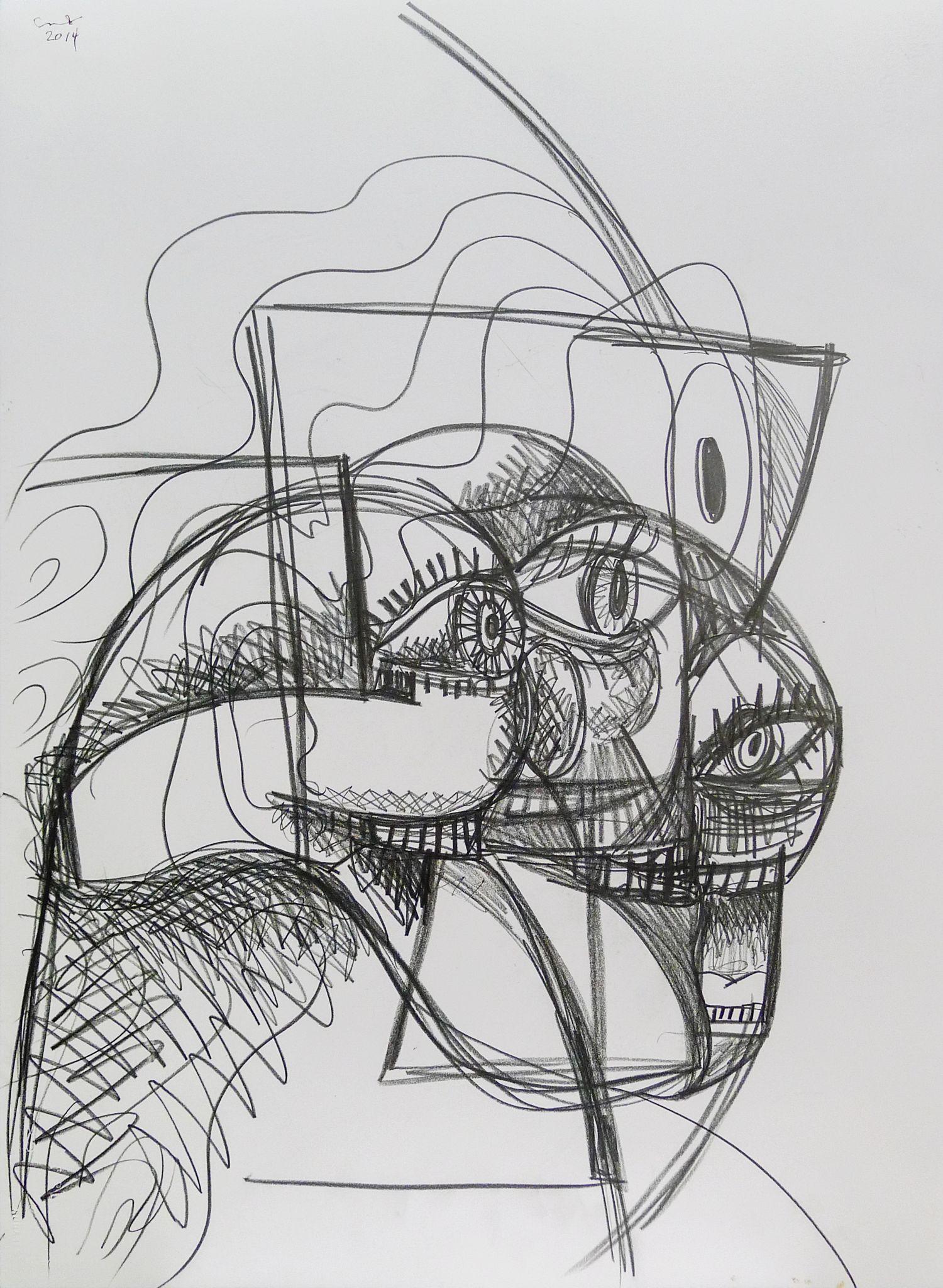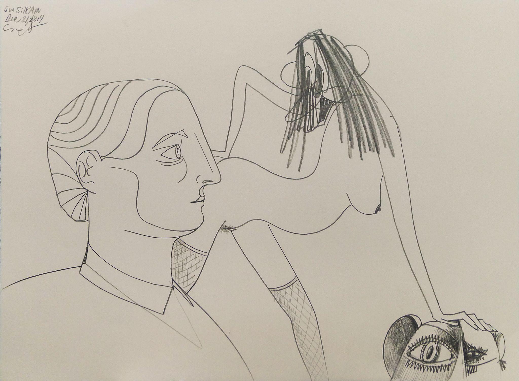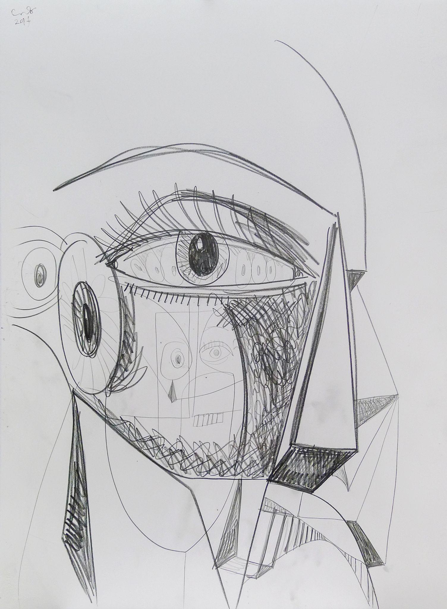 The formal correspondences between Condo’s drawings and Picasso’s cubist period are self-evident, although Condo prefers to define his own art as ‘psychological cubism’. He has said: ‘Picasso painted a violin from four different perspectives at one moment. I do the same with psychological states. Four of them can occur simultaneously… hysteria, joy, sadness, and desperation. If you could see these things at once that would be like what I’m trying to make you see in my art.’