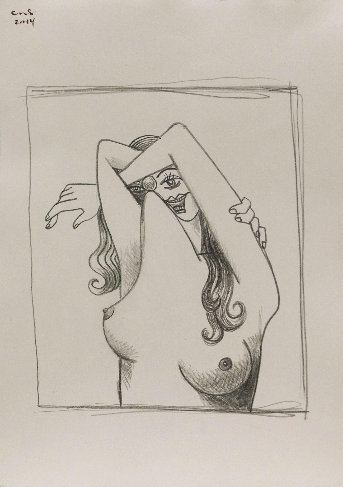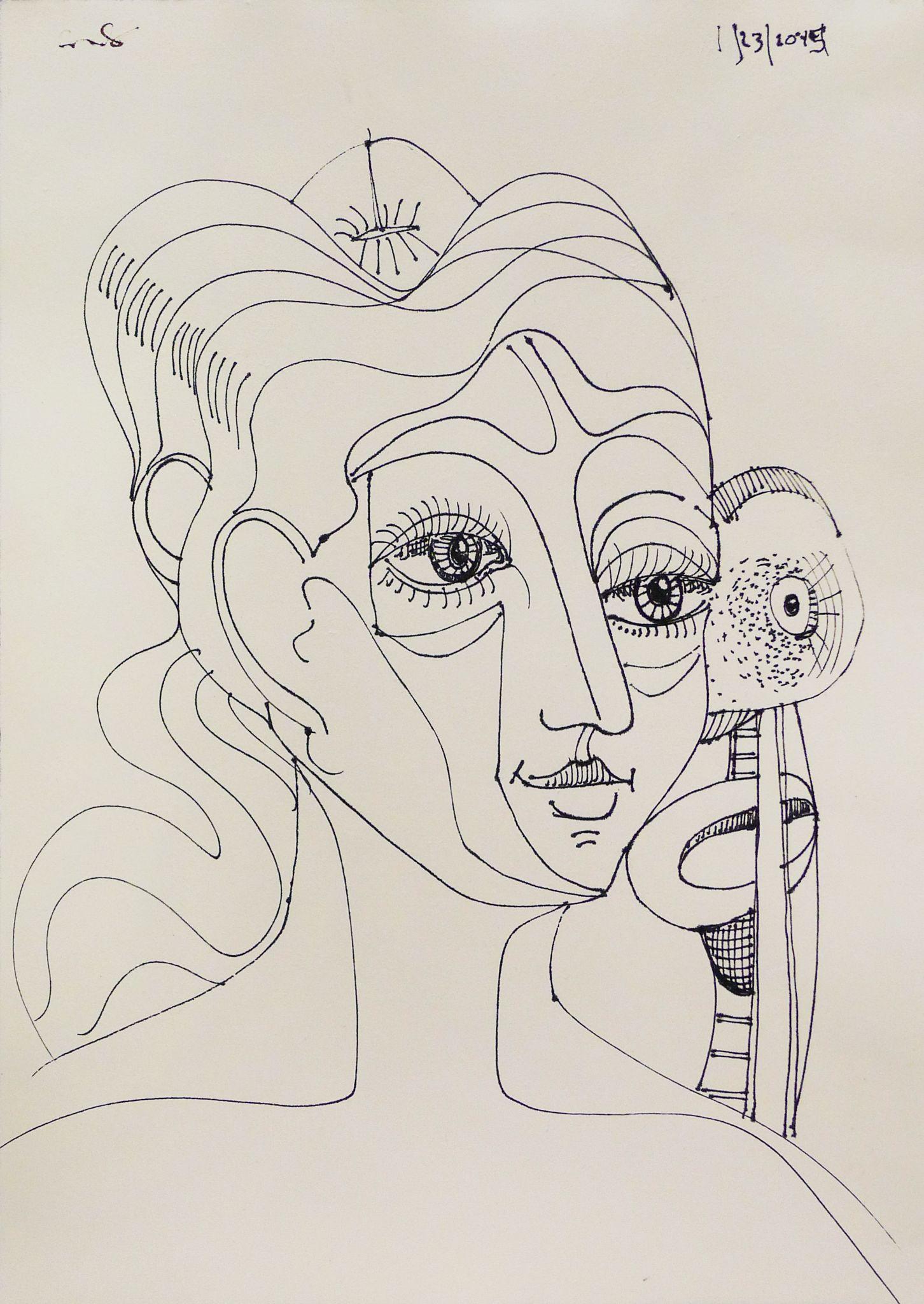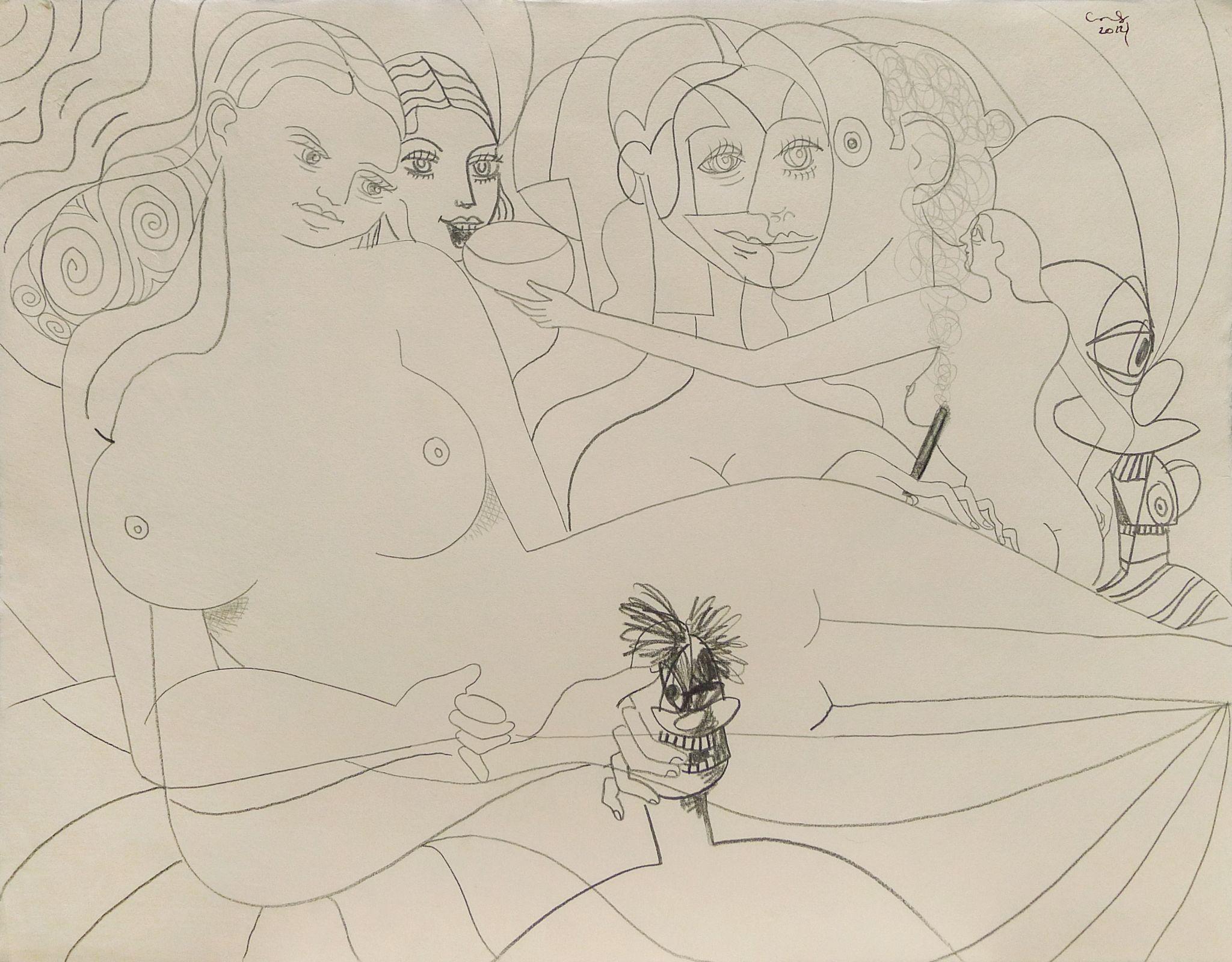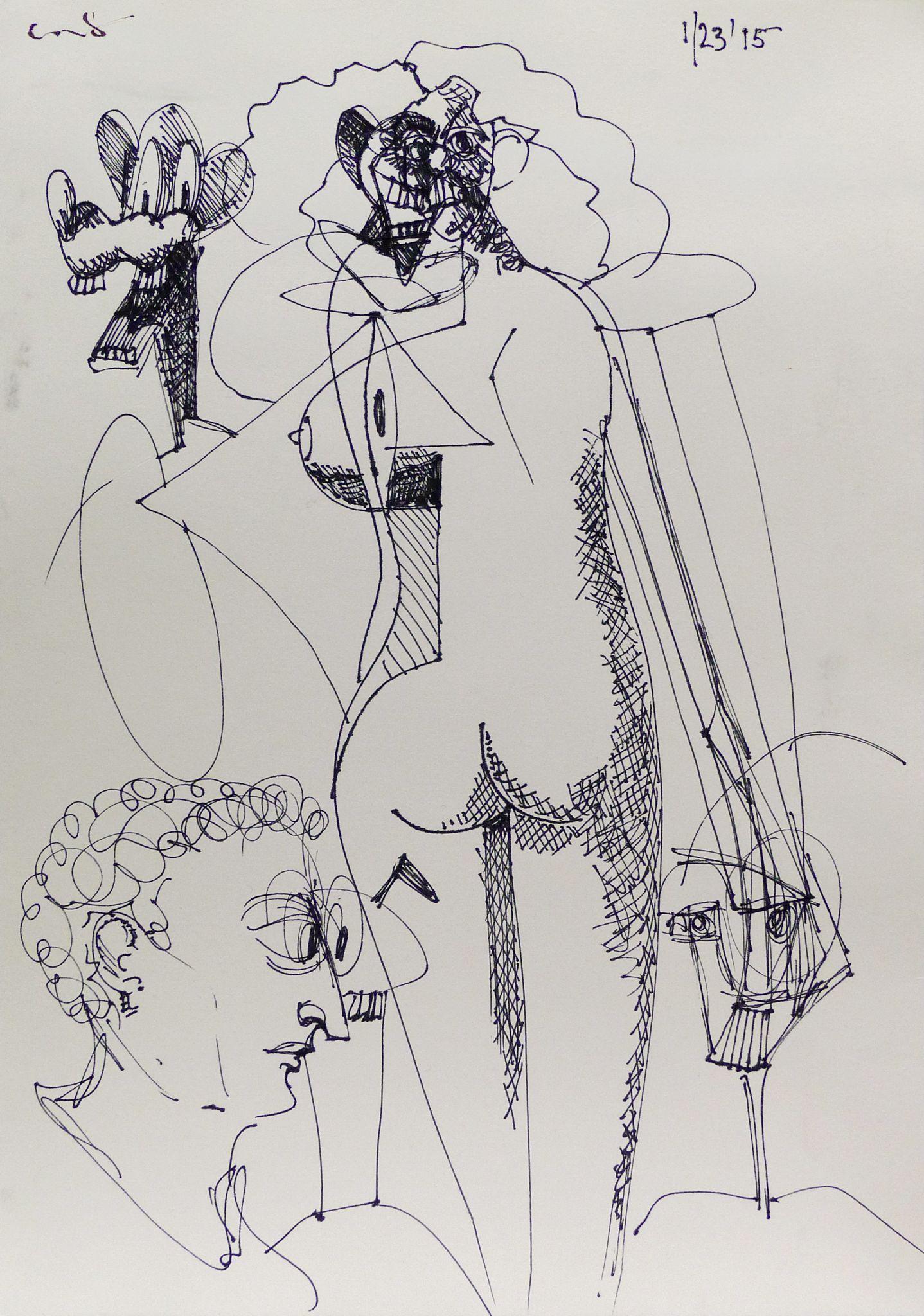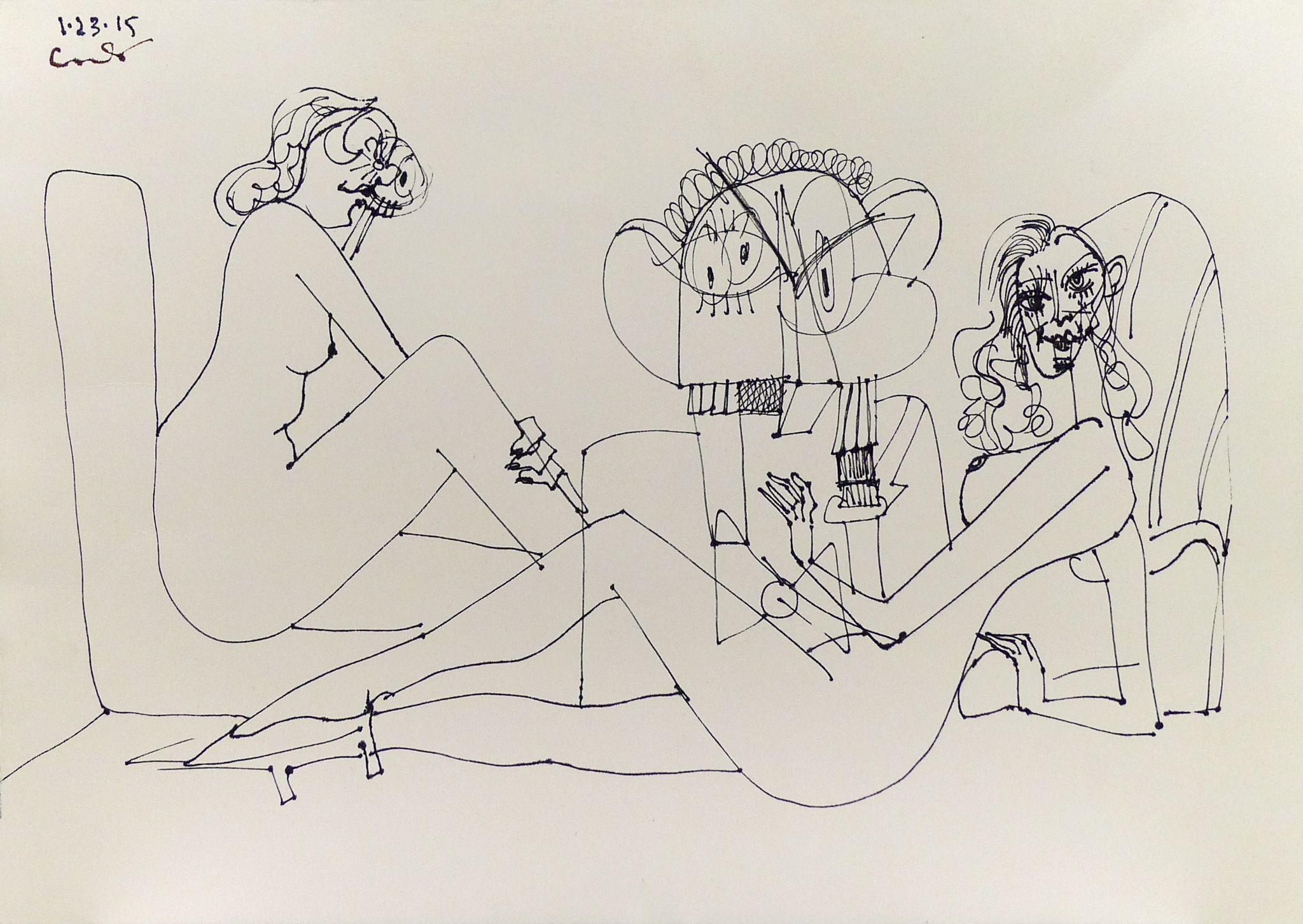 The formal correspondences between Condo’s drawings and Picasso’s cubist period are self-evident, although Condo prefers to define his own art as ‘psychological cubism’. He has said: ‘Picasso painted a violin from four different perspectives at one moment. I do the same with psychological states. Four of them can occur simultaneously… hysteria, joy, sadness, and desperation. If you could see these things at once that would be like what I’m trying to make you see in my art.’