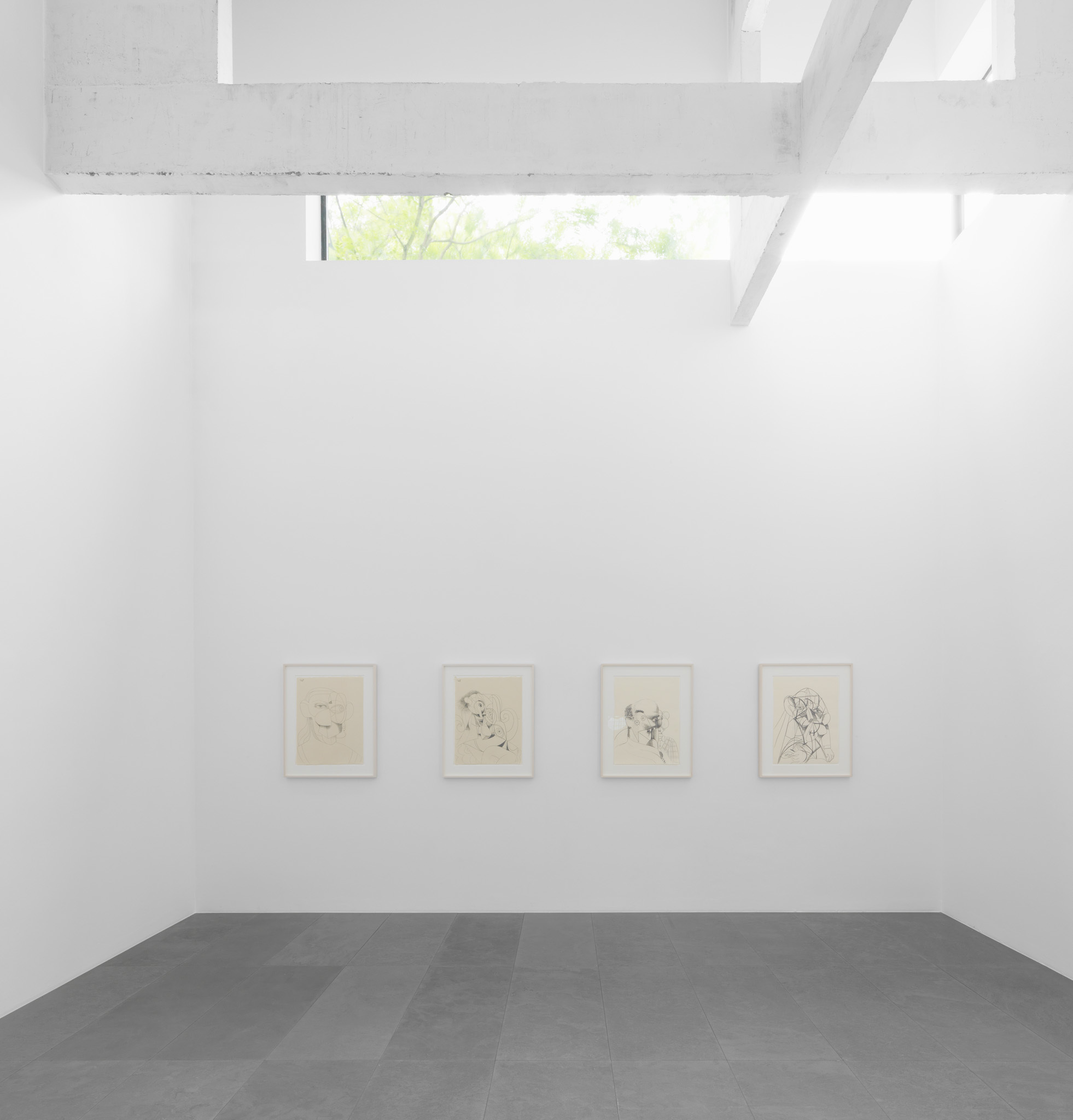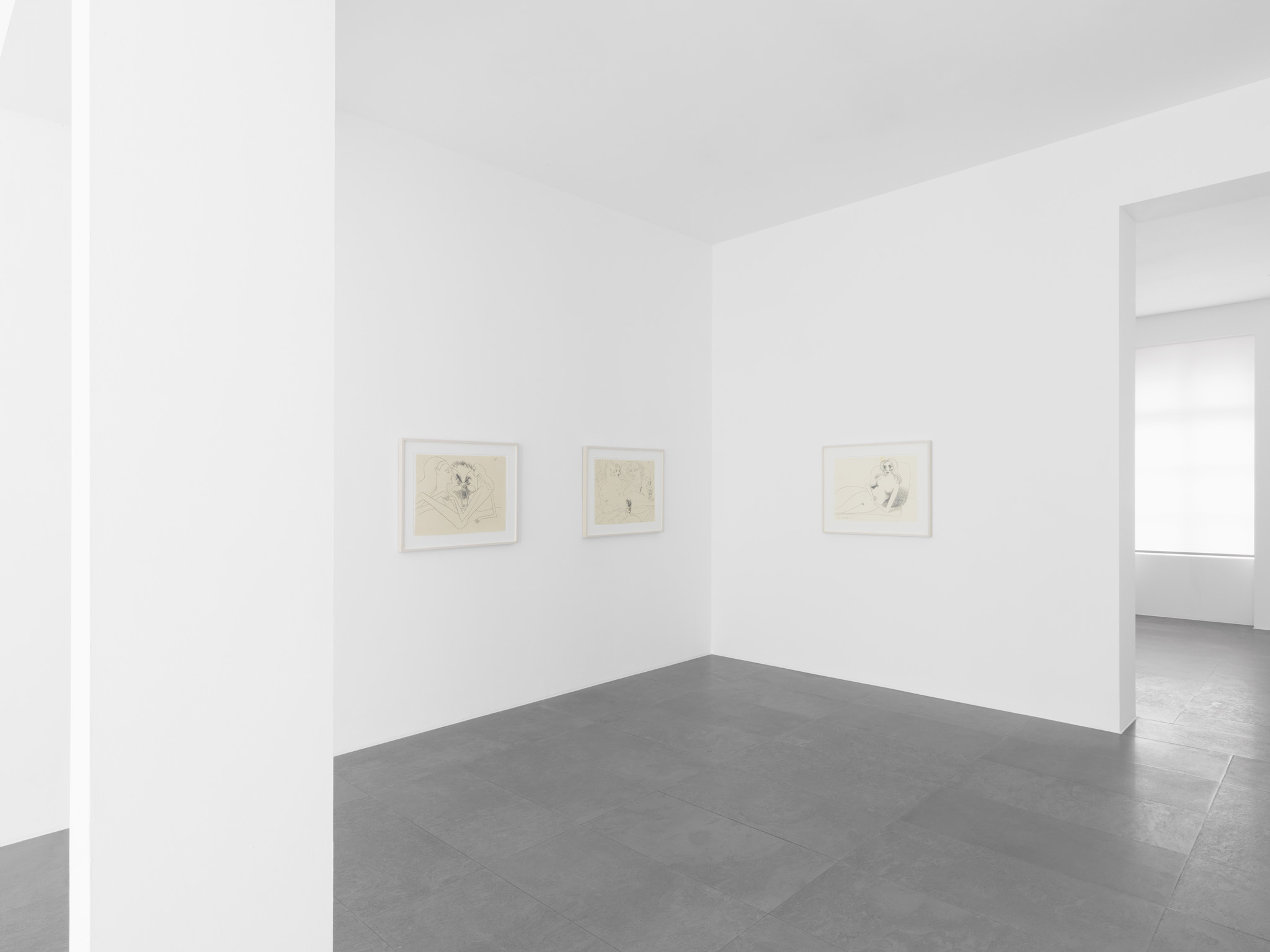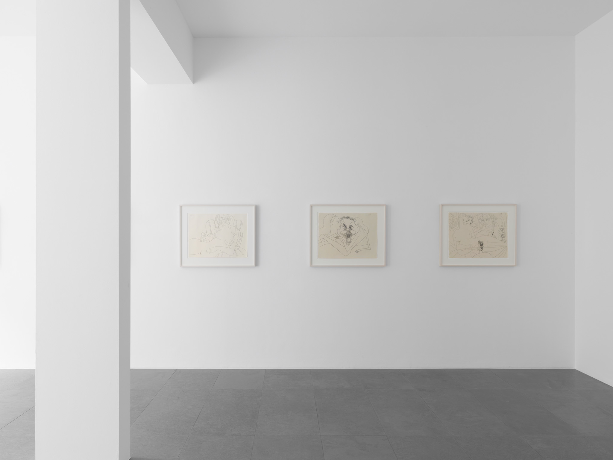 Condo’s drawings portray a grotesque reality that is characterized by nudity and sex, and which often exudes visceral emotions such as rage, insanity, hysteria, violence, loneliness and alienation. The figures are human, but often distorted and hybrid, depicted with multiple eyes and mouths. Condo aficionados will recognise familiar characters from earlier paintings, such as the butler Jean Louis, while one drawing is executed upon a blank orchestral score, a reminder of Condo’s musical abilities. The sense of distress that emanates from a number of works is linked to the artist’s profound reflection on the human condition: ‘If you can paint the anguish of everyday life and give some dignity to everyday despair… or some of the emotions that regular people have, their feelings or thoughts become worthy of an artistic endeavour. There’s something beautiful about recognizing those kinds of things in life and saying something about them… If you think about people’s feelings and emotions, or unimportant and insignificant thoughts, and shine a light on them, you get a kind of cinematic moment, like what happens before the first word on a page in a novel.’