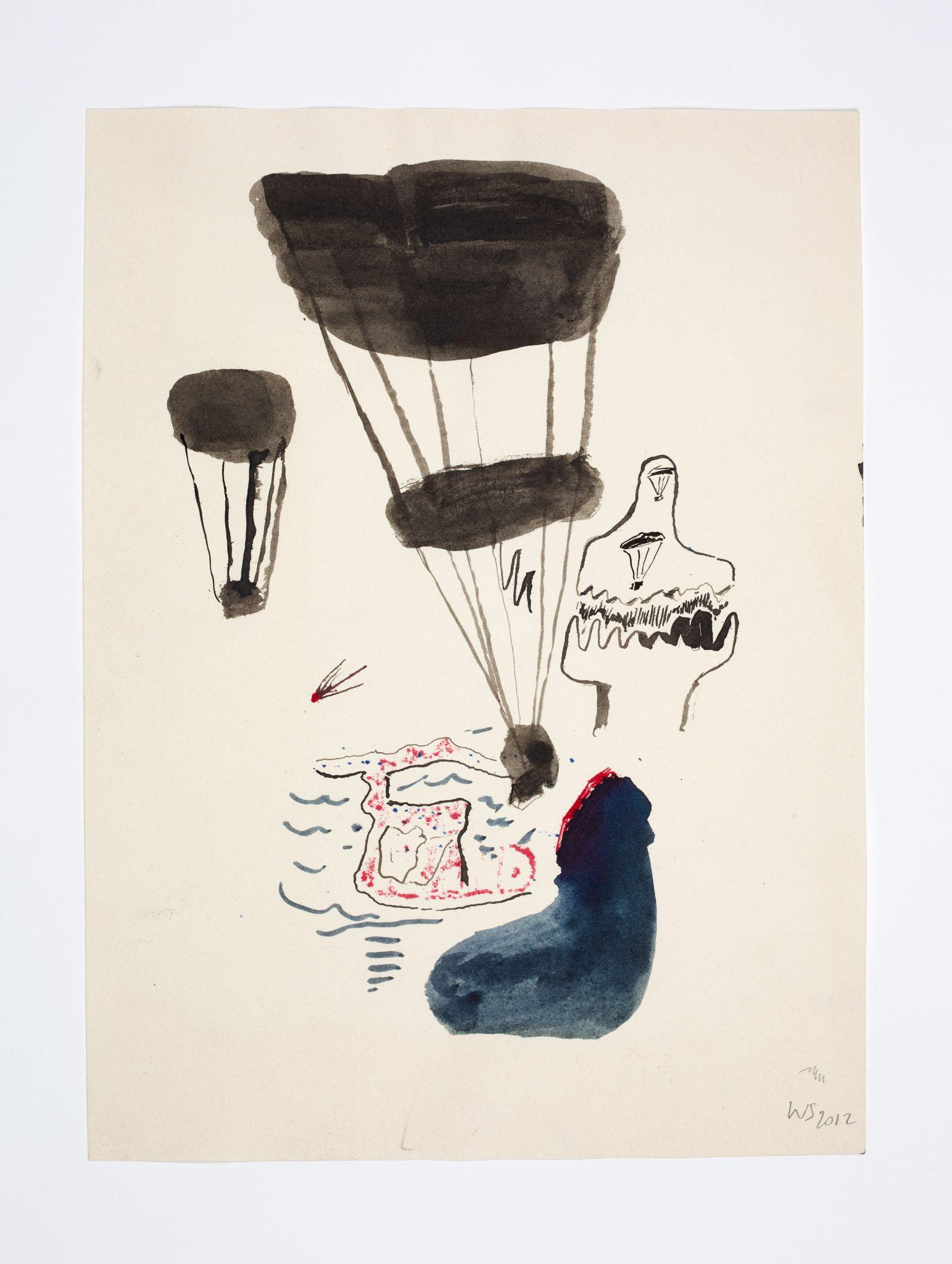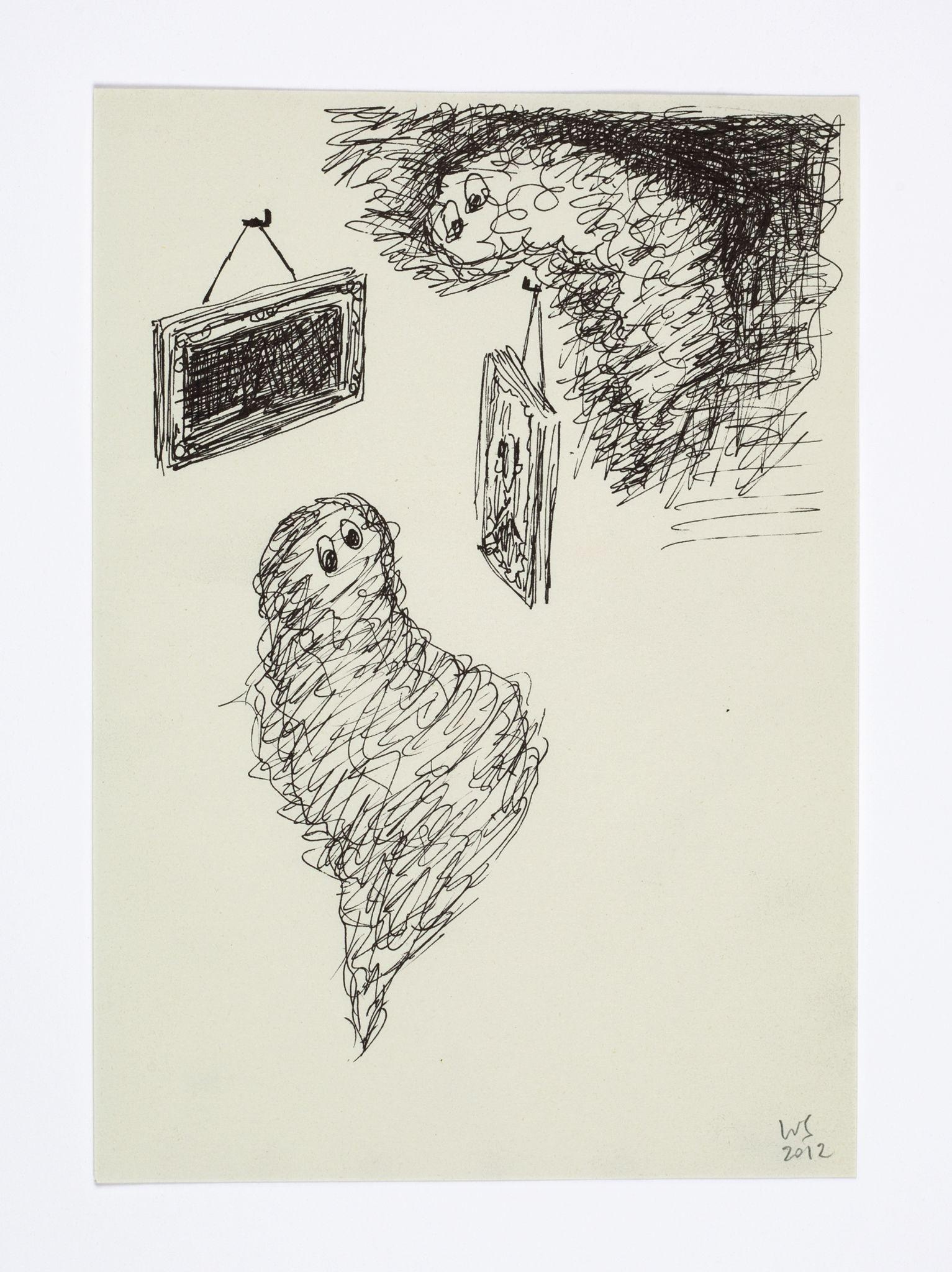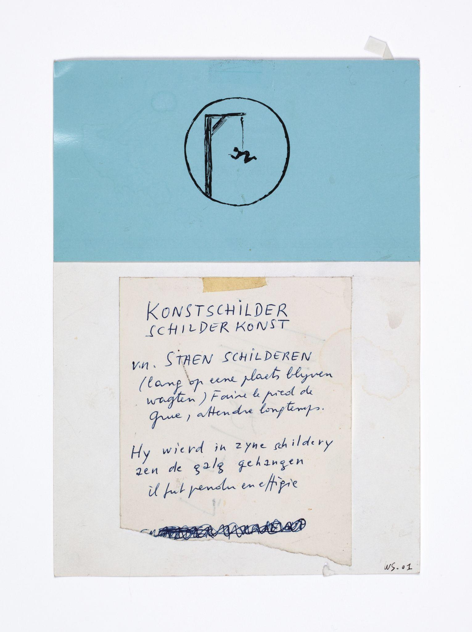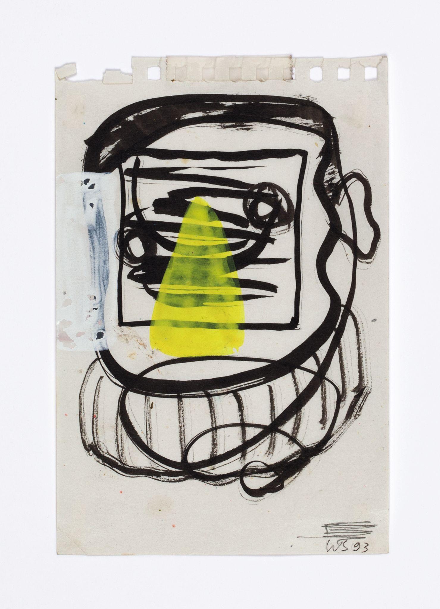 Walter Swennen is a painter and a draughtsman in equal measure. While his works in oil often engage with the complex questions inherent to the art of painting—its potential and limitations; what, why and how to paint — his works on paper can be read as the laboratory that not only fuels his ideas, but also points to possible answers. Like his paintings, Swennen’s sketches take the form of enigmatic compositions of recognisable elements: words, letters, pictograms, heraldic devices, strip cartoon figures, advertising slogans, geometric forms, animals, stereotypical characters and everyday imagery. Although this gives rise to obvious visual correspondences between certain paintings and drawings, and a sketch might form a springboard for a larger work, his graphics are always autonomous creations. Often executed in layers and in mixtures of pencil, ink, watercolour, pen or crayon, they can be viewed as a visual compendium of ideas, insights, discoveries, juxtapositions and associations.