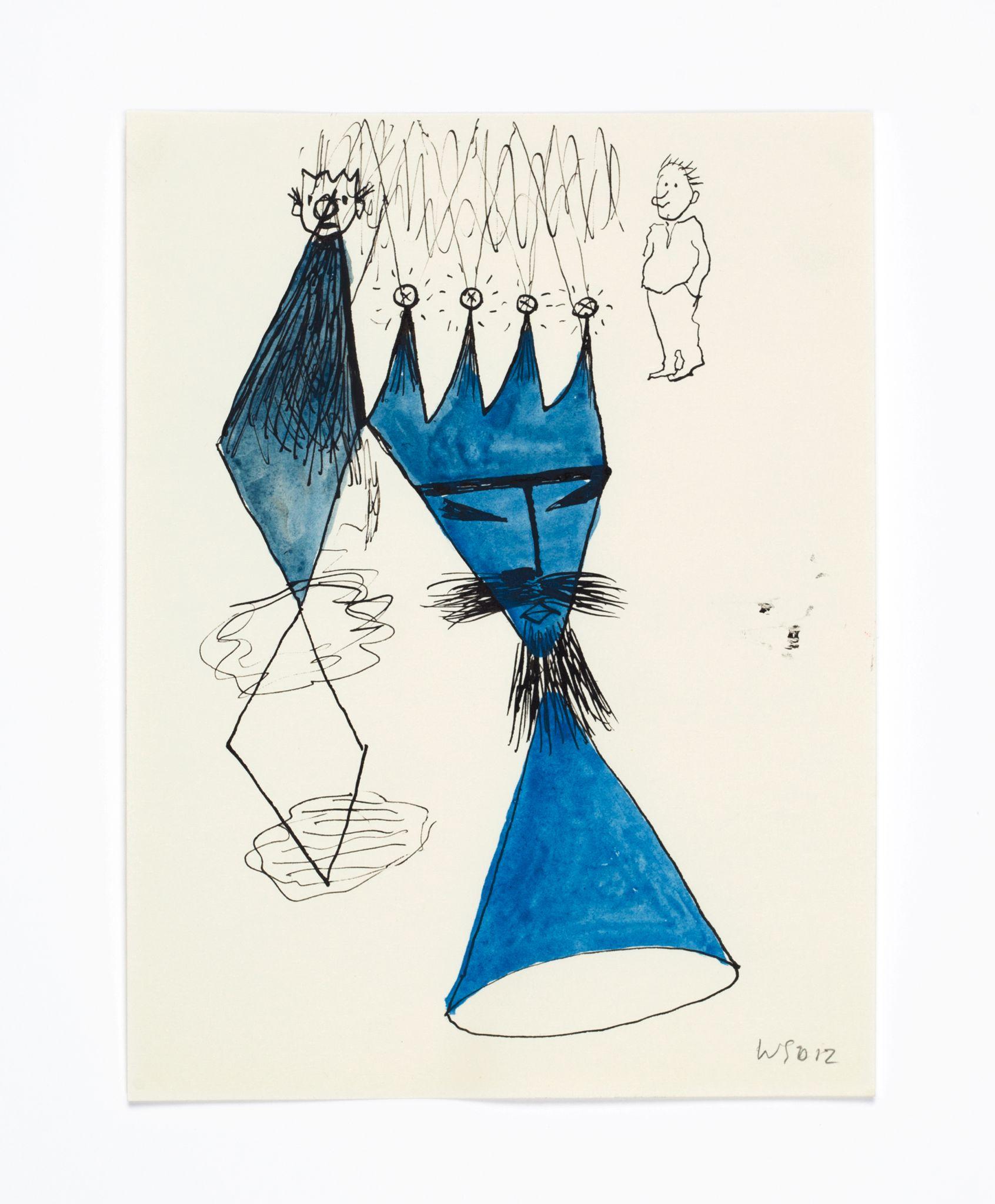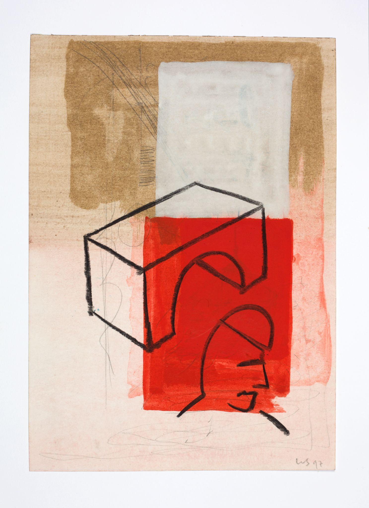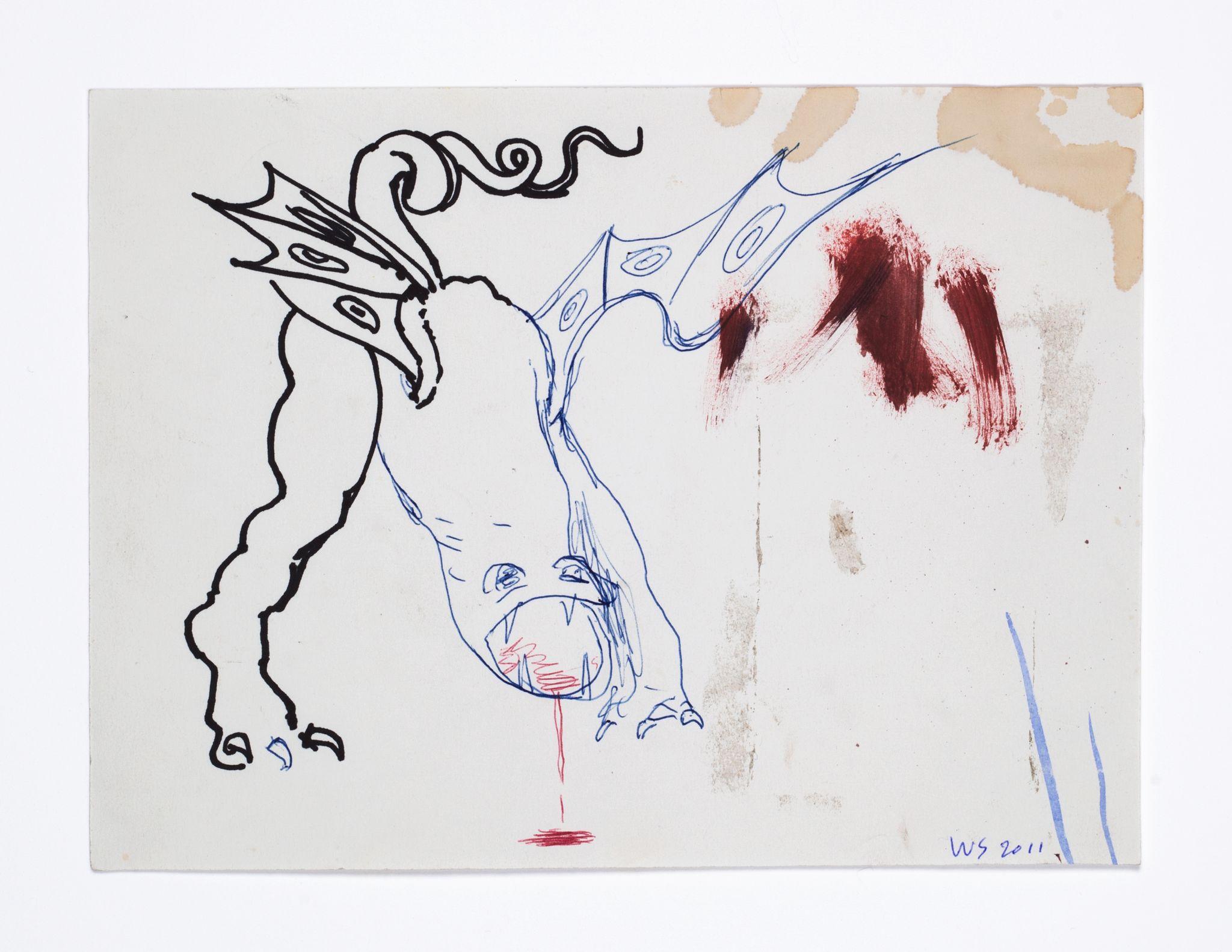 Walter Swennen is a painter and a draughtsman in equal measure. While his works in oil often engage with the complex questions inherent to the art of painting—its potential and limitations; what, why and how to paint — his works on paper can be read as the laboratory that not only fuels his ideas, but also points to possible answers. Like his paintings, Swennen’s sketches take the form of enigmatic compositions of recognisable elements: words, letters, pictograms, heraldic devices, strip cartoon figures, advertising slogans, geometric forms, animals, stereotypical characters and everyday imagery. Although this gives rise to obvious visual correspondences between certain paintings and drawings, and a sketch might form a springboard for a larger work, his graphics are always autonomous creations. Often executed in layers and in mixtures of pencil, ink, watercolour, pen or crayon, they can be viewed as a visual compendium of ideas, insights, discoveries, juxtapositions and associations.