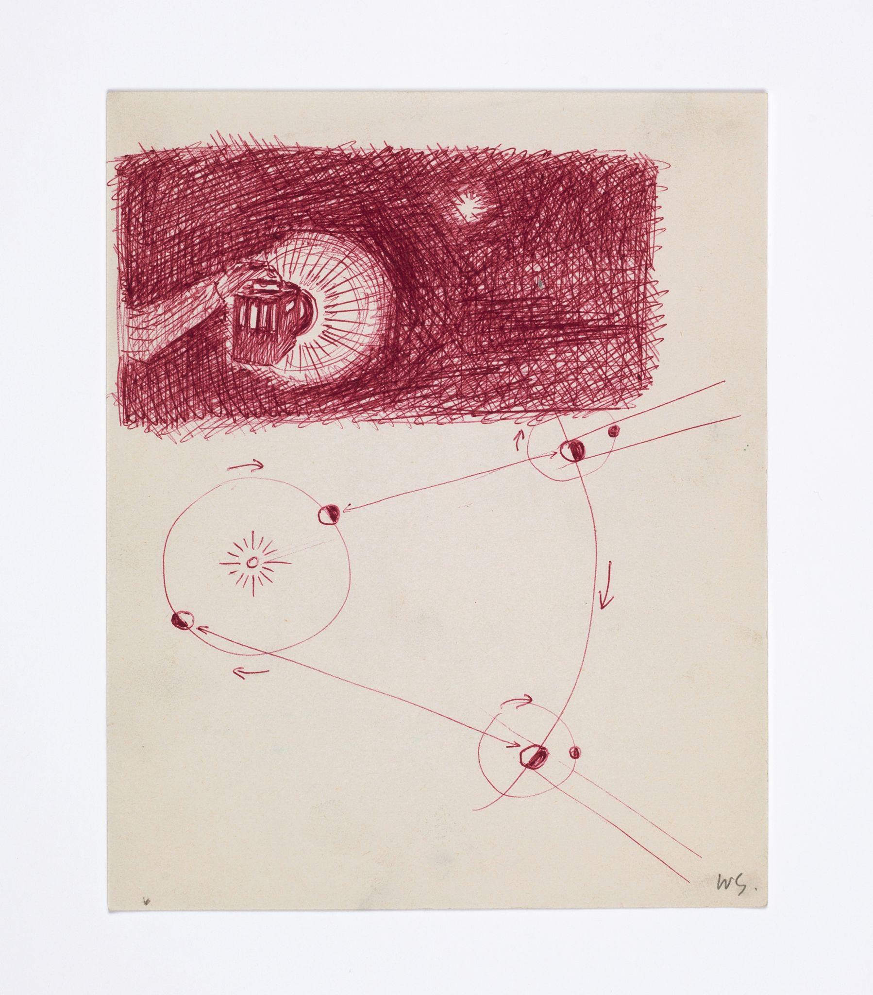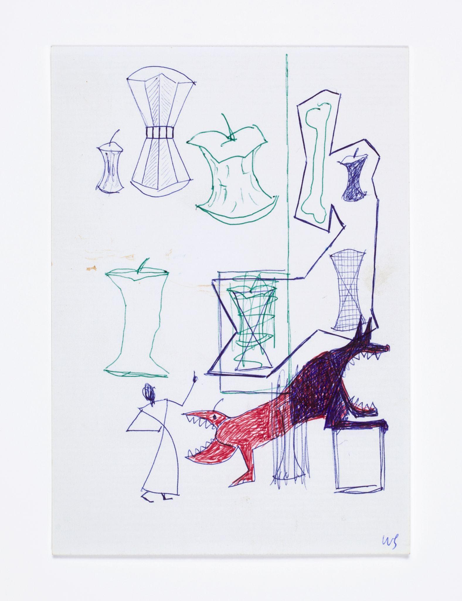 Modest in scale (often no larger than the page of a standard sketchbook), humorous and bursting with life, Swennen’s joyful graphic inventions nevertheless point to a greater conceptual significance. To define what they are, it is often easier to state what they are not: they do not attempt to accurately represent anything, be it a person, place, situation or thing; nor are they abstract or expressionist; they are not studies of isolated objects, nor evocations of inner emotional states. They do not open up onto a three-dimensional pictorial space that can, figuratively speaking, be entered. In other words, they are not mimetic. Instead, they can be read as complex mental constructions in which images and meanings, ideas and language overlap, intersect or converge.