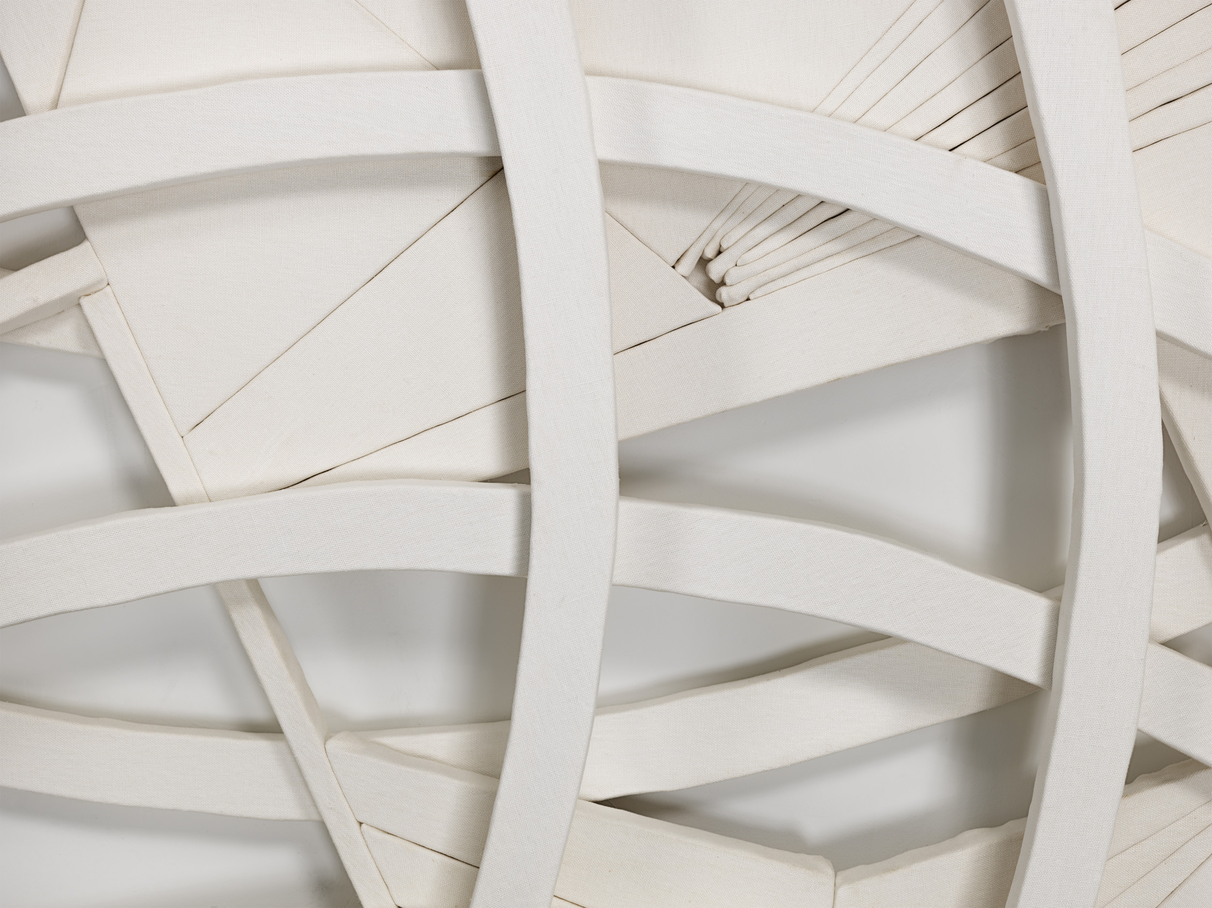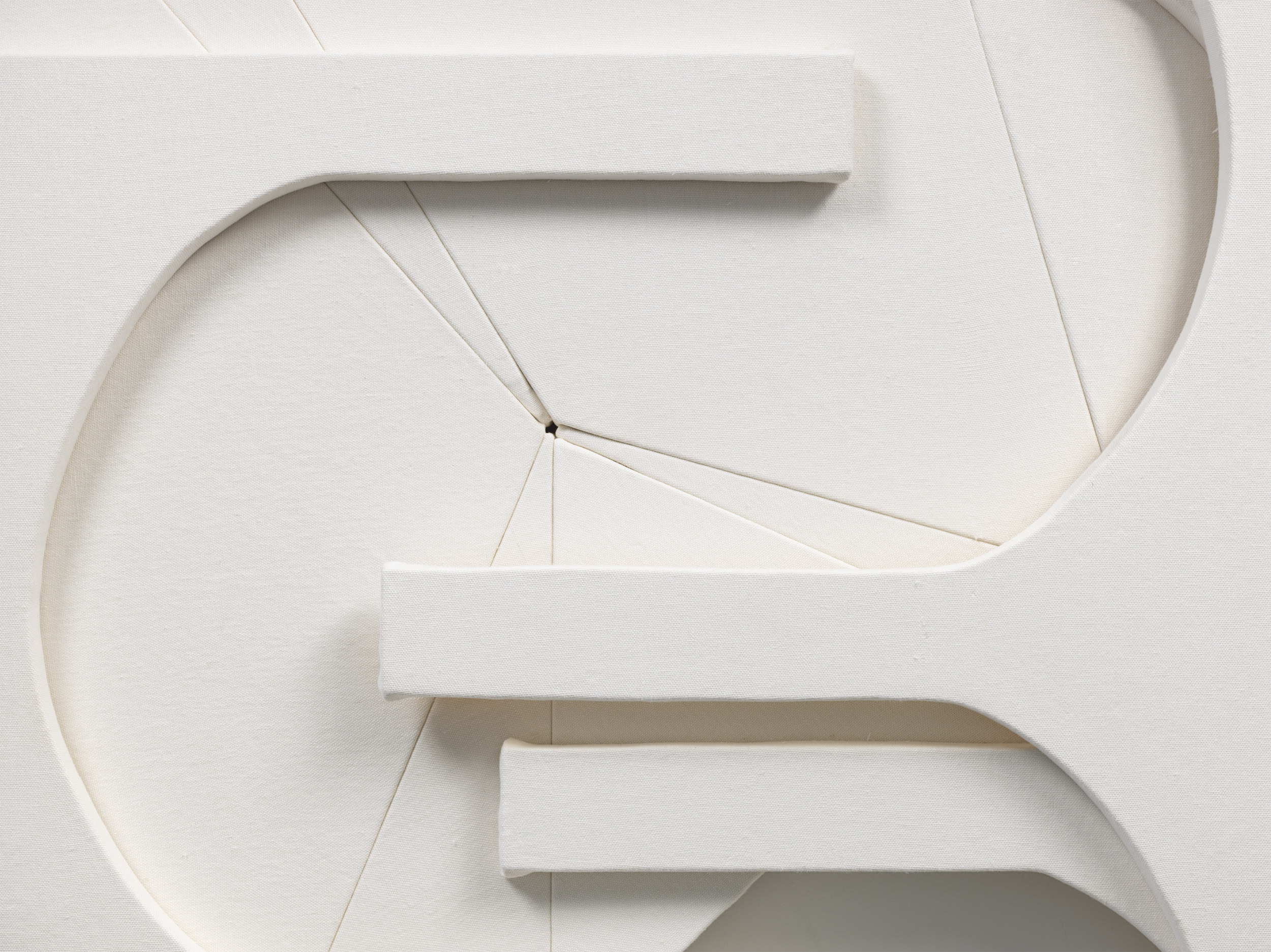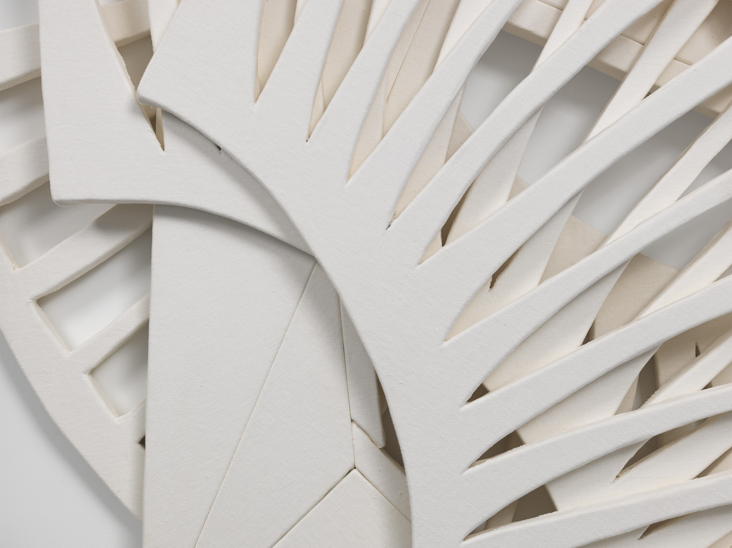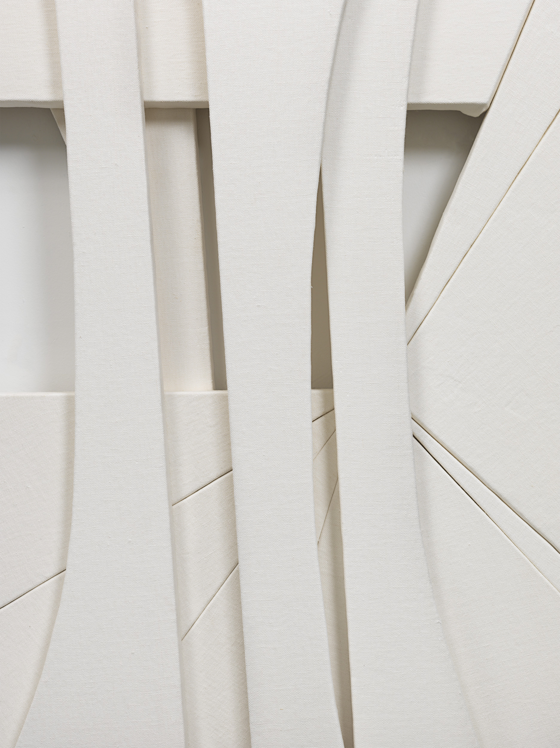 Although colour featured heavily in Kahn’s previous exhibition at the gallery, it is absent in this recent body of work. What we see, instead, is a return to the raw, untreated linen. The unprimed canvas has its own natural hues and textures.
