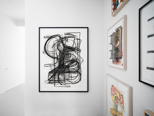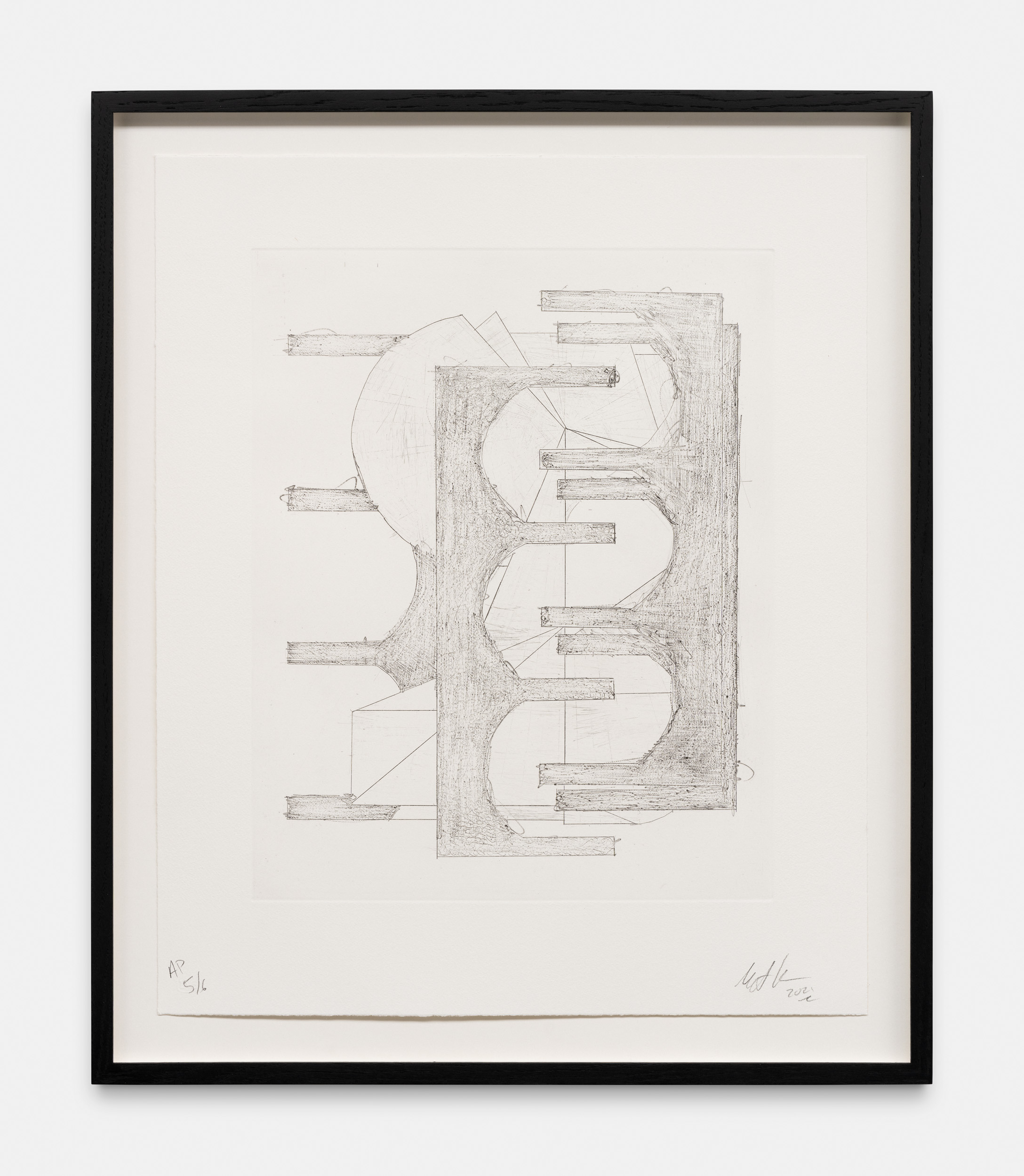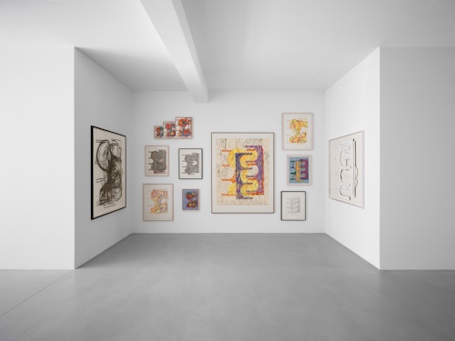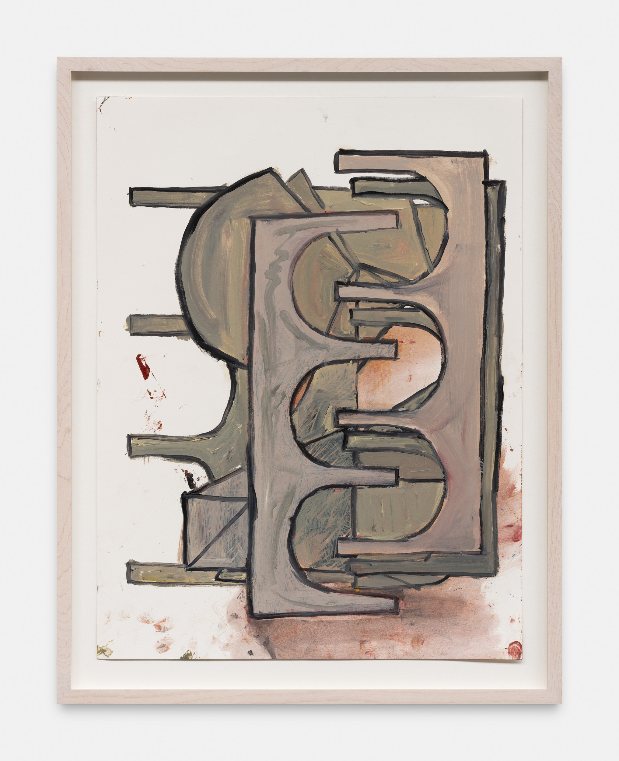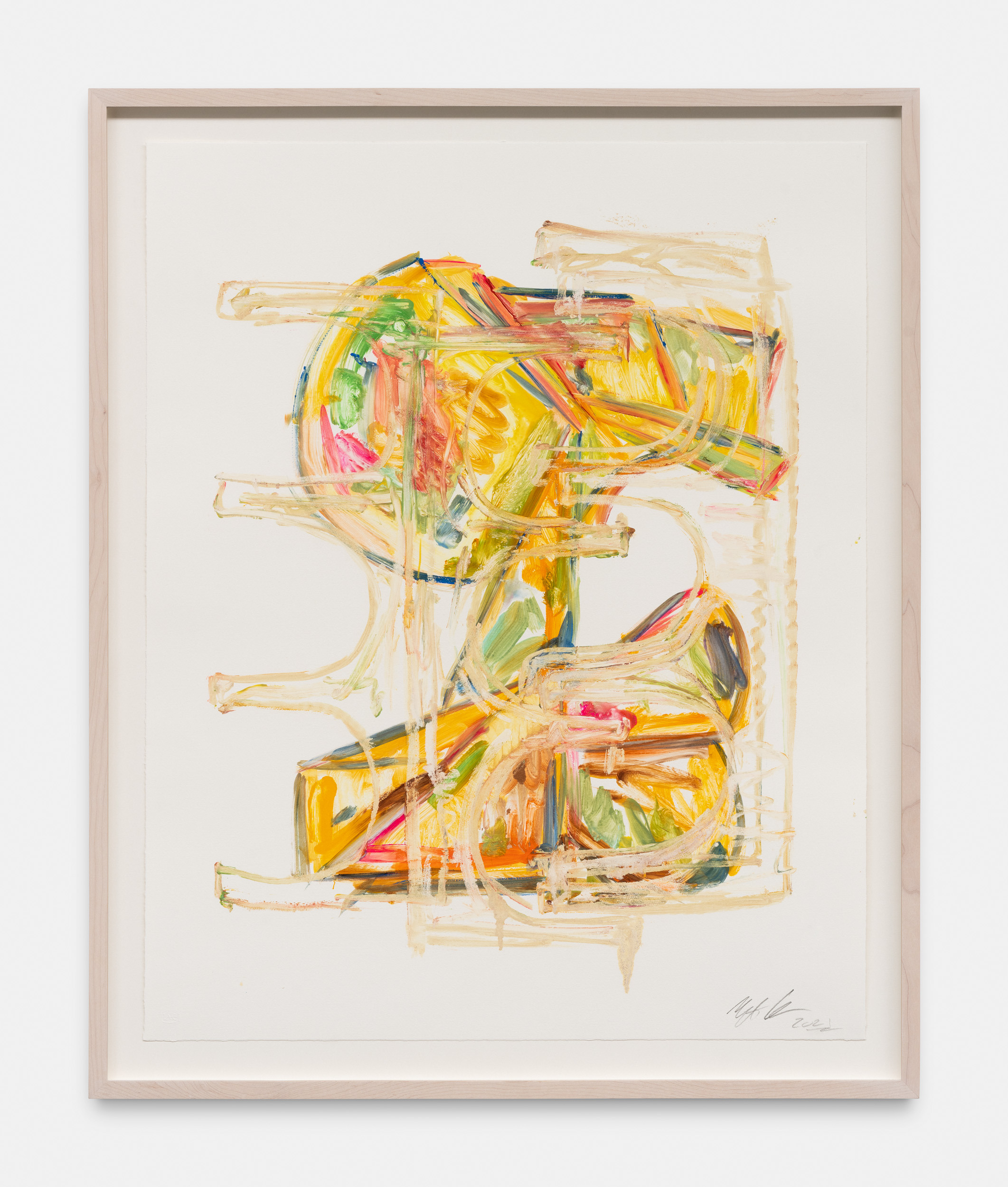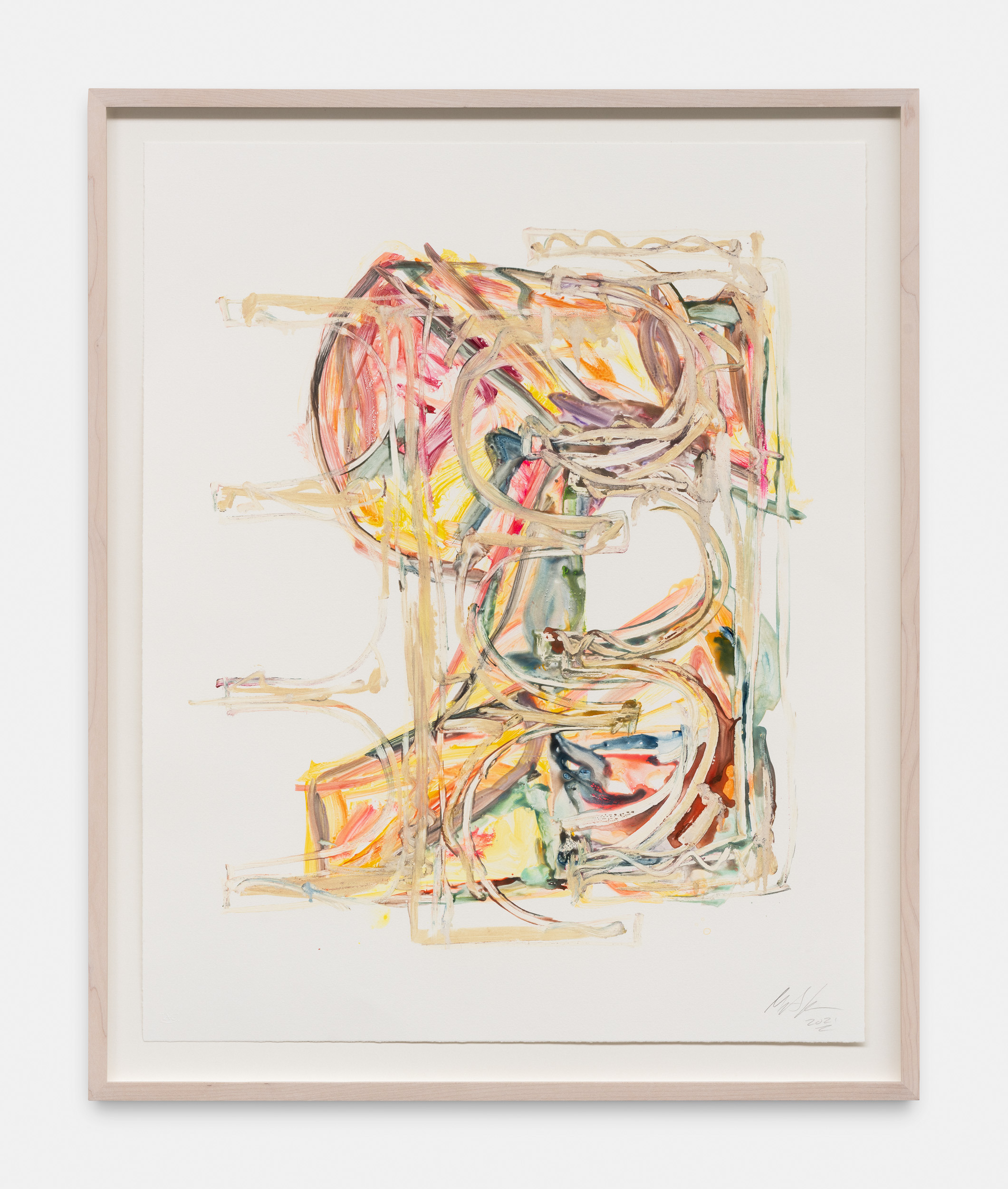 Another key development is the multi-layered construction of the works. Three distinct strata are discernible: an intricate configuration of canvases between two sets of open, repeating and transposed forms. The layers evoke the conventional organisation of a painting into foreground, middle ground and background. In Kahn’s compositions, however, they are as distinct as they are indivisible, weaving in and out of each other to form a single composite image. This tripartite structure also opens itself up to a temporal reading, calling to mind the idea of a merging of past, present and future. One could also interpret the empty canvas as a tabula rasa, an allusion to the absence of preconceived ideas. “On the one hand, they are fully completed objects. On the other, they have a canvas in a state that would typically be considered incomplete or in progress – it would normally be gessoed and painted,” Kahn explains. “I felt this captured the nature of the moment. I think we are in a moment of change yet much of it is very unfinished. There is both great anxiety and also incredible hope and beauty. I wanted these works to embody all this.”In addition to the canvas reliefs, Wyatt Kahn presents a group of studies for New Houston Street, Spring 2021. Created before, during and after the making of this work, they testify to the importance of drawing and printmaking within his practice. Sketches, tracings, collages and charcoal sketches, as well as a selection of vibrant monotypes, provide a unique insight into the artist’s working methods, while also revealing Kahn to be a rigorous draughtsman.