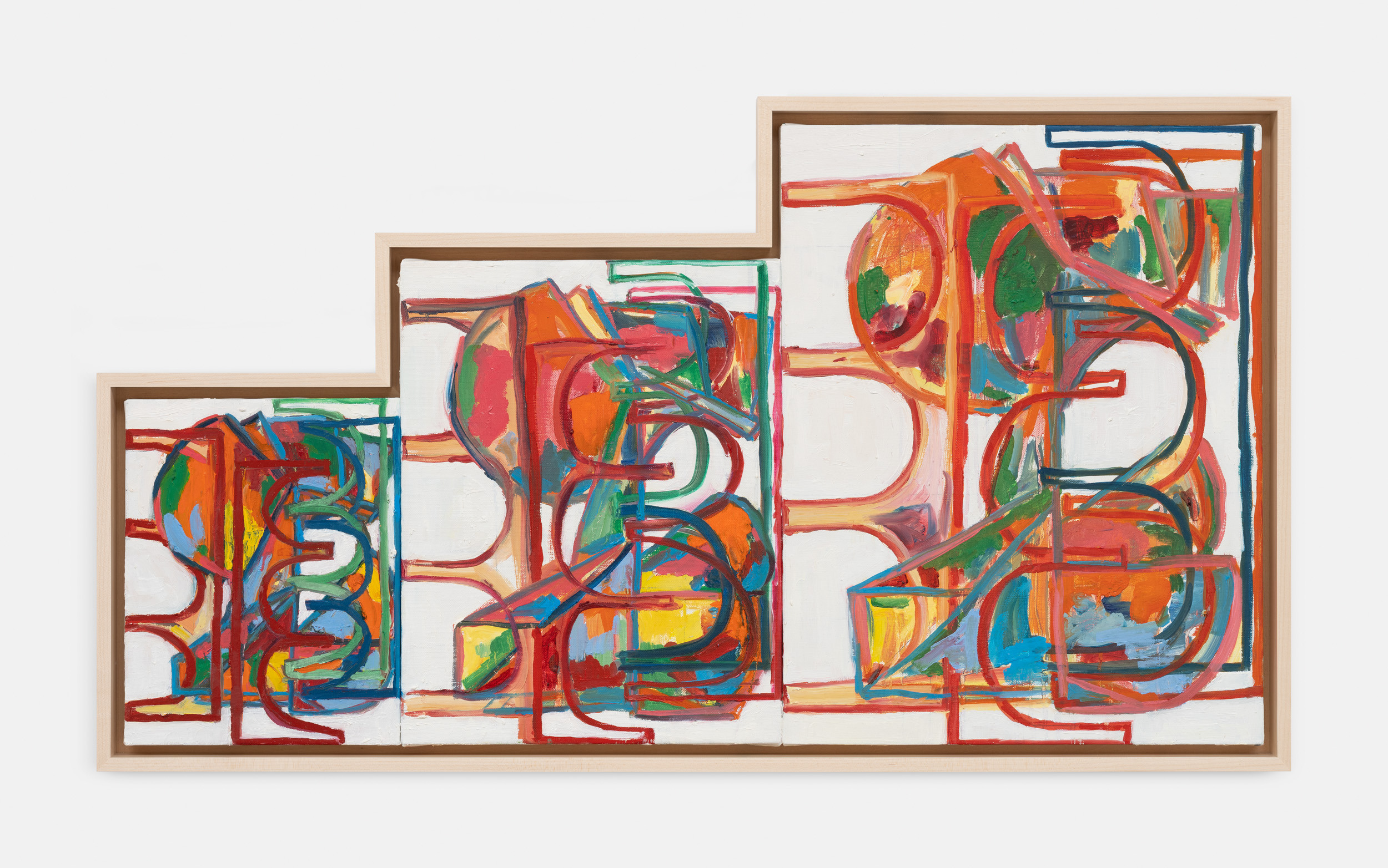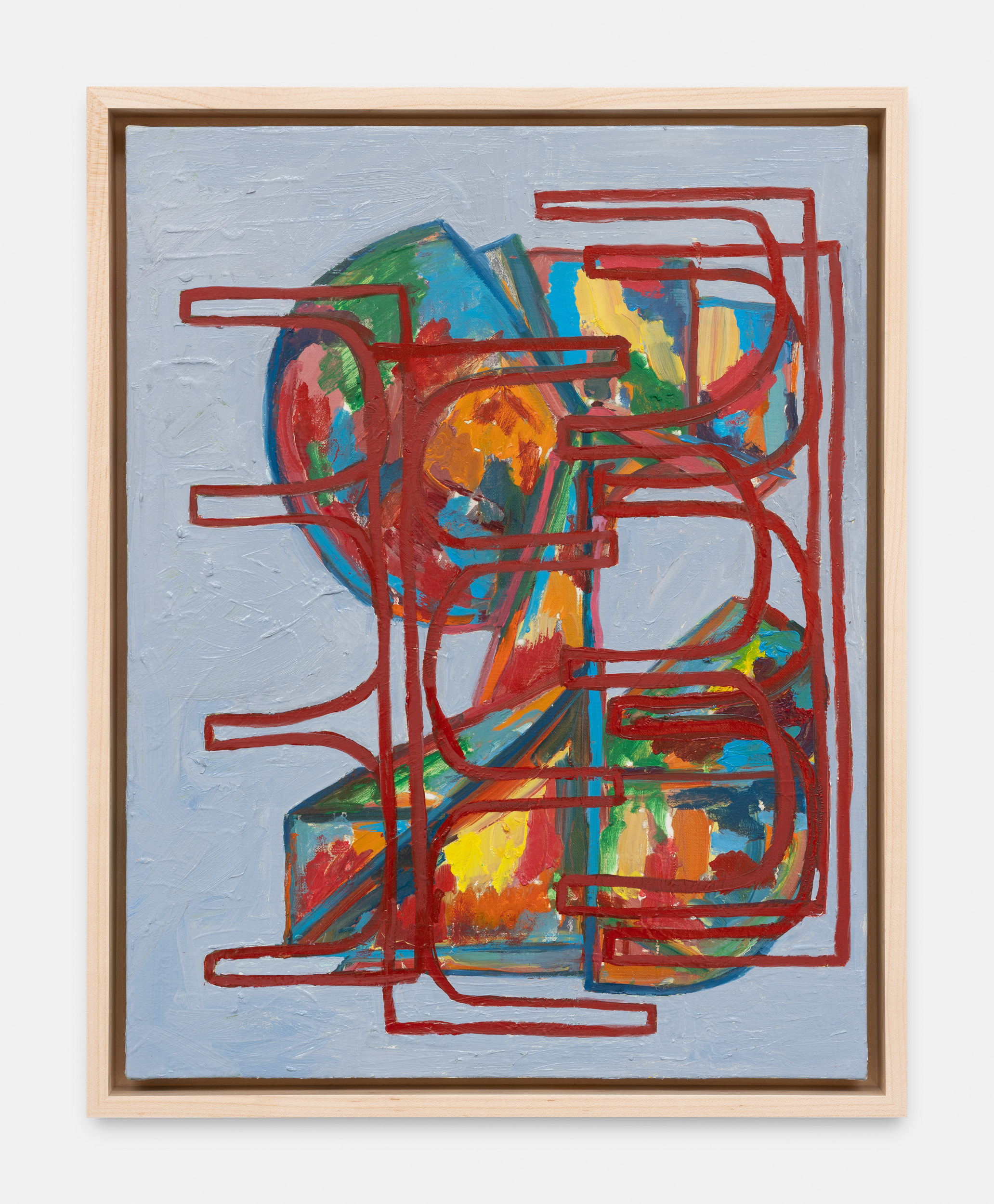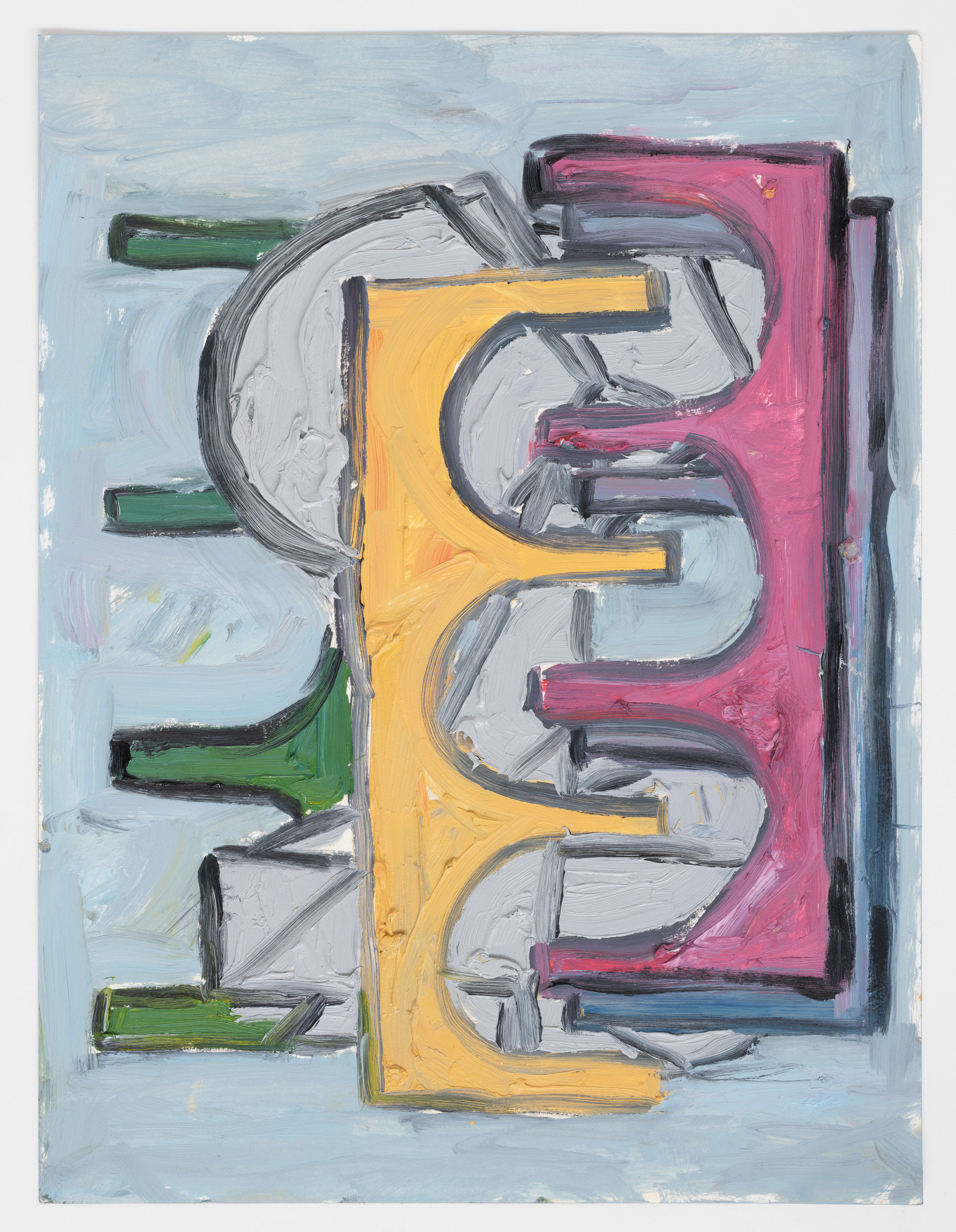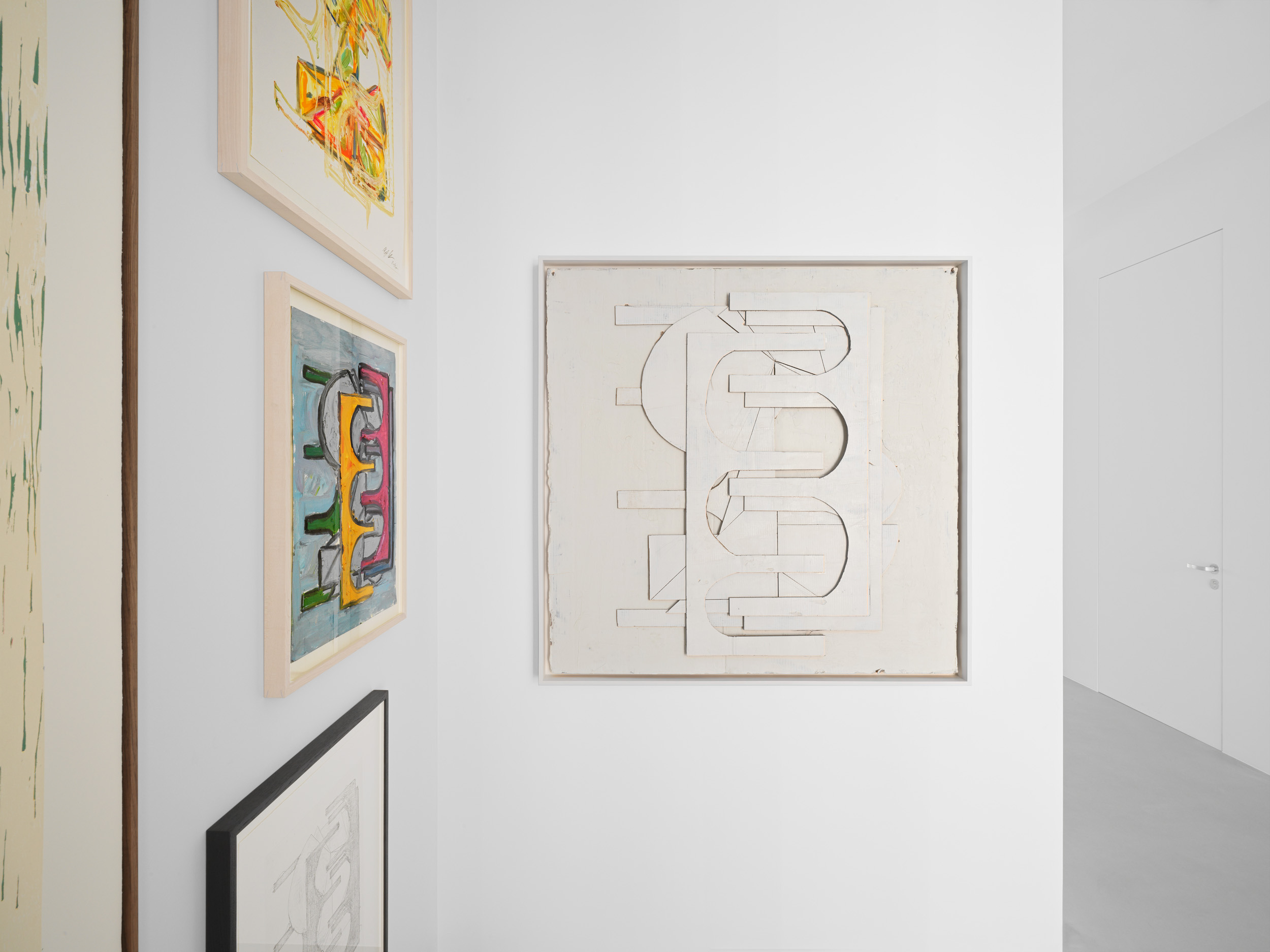 By focusing solely on painting’s underlying support, Kahn directs attention from the pictorial surface to the edges of the canvases and the divisional spaces. These crevices and openings are the spatial equivalents of lines and planes, while the wall becomes an integral part of the composition. Likewise, the idea of a canvas as a single and uninterrupted surface is challenged: these works are splintered, yet coherent. Juxtapositions of organic and geometric shapes, a number of which recur throughout the artist’s oeuvre, are the enduring carriers of meaning. Whilst notionally abstract, the origins of these forms can often be traced back to Kahn’s engagement with art history, especially early modernism, as well as to daily life and varied emotional states. The work Harlequin, for example, speaks to Picasso’s works on the same subject, while the forms in New Houston Street, Spring 2021 are derived from the arches of a new building in the said location.