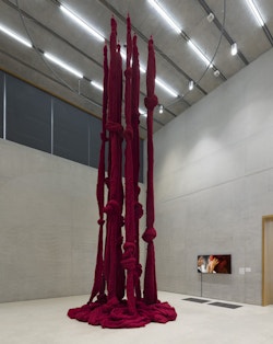 A striking centerpiece within this gallery space, a tall structure of thick, bright red ropes hanging from the ceiling and has eight connecting points at the top of a wire circle frame and is knotted at different points in the fabric sculpture. s sculpture reaches from the ceiling to the floor, with the excess fabric lying on the gallery floor.