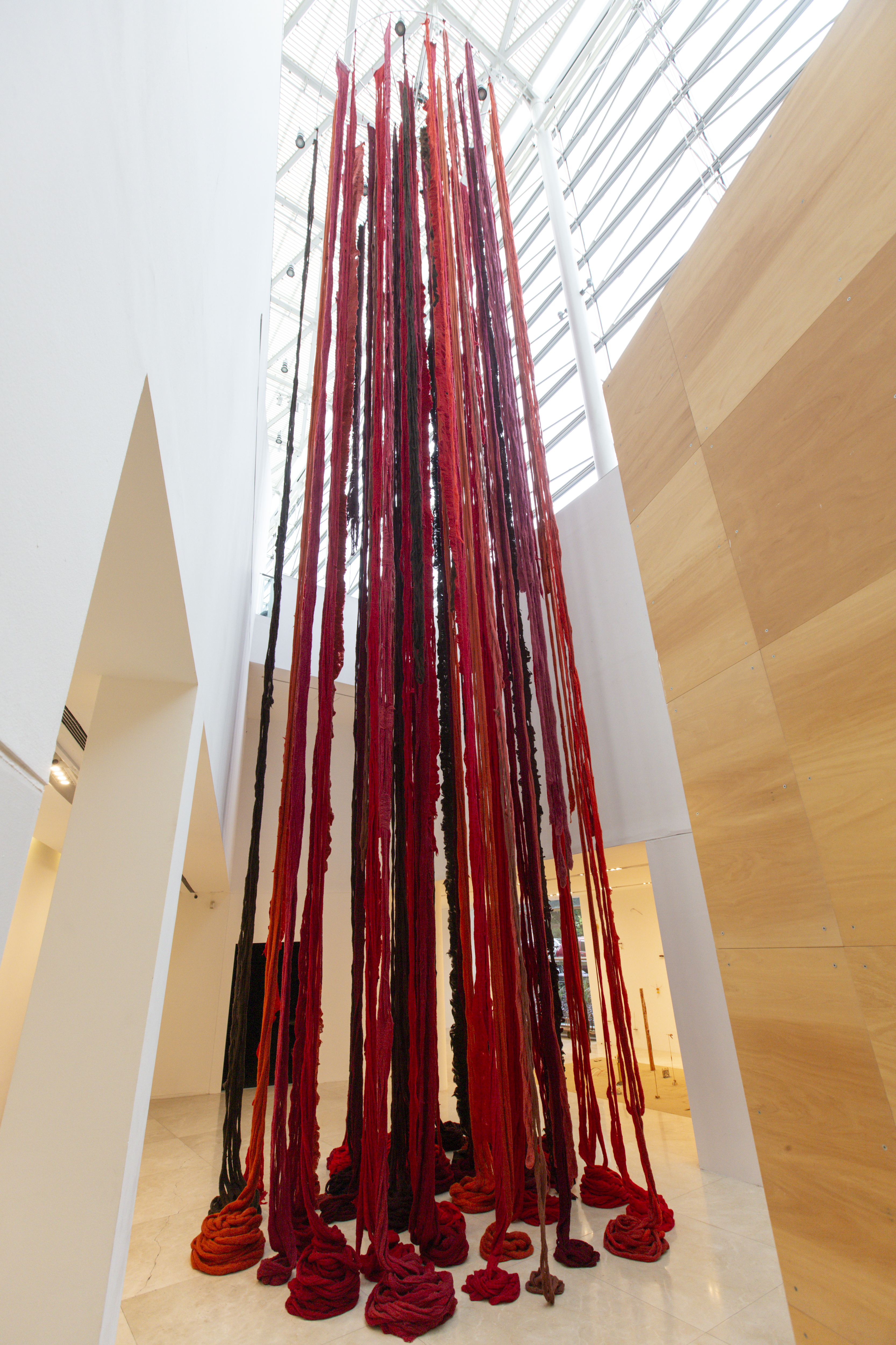 In this sense, in the double height above the room on level -1 of the museum, the installation for a specific site is presented Menstrual quipu (The blood of the glaciers)Menstrual quipu (The blood of the glaciers), originally conceived by Vicuña in 2006 as a way to express his support for Michelle Bachelet, the first female president of Chile.