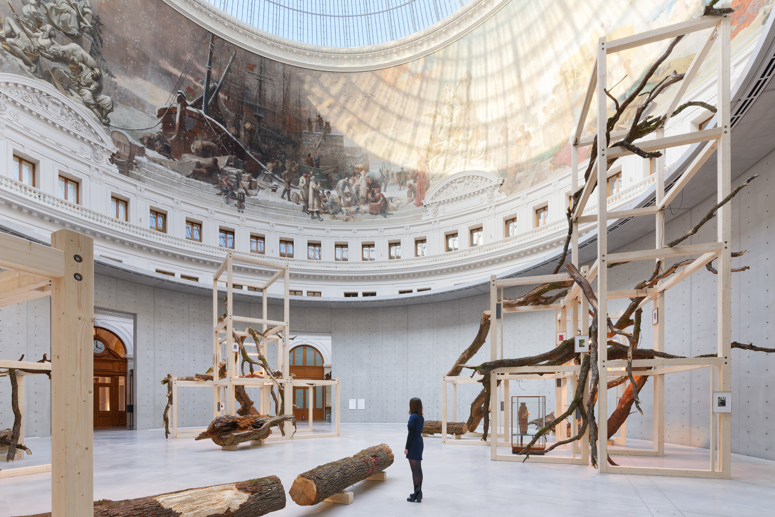 Whereas ancestral calendars were conditioned by cosmic movements, our frantic race for progress and abundance has irrevocably transformed our environment. Its disruption forces us to adapt in turn. Formerly the granary of Paris, the Bourse de Commerce building has been both a witness to and an agent in the global acceleration of predatory trade since 1889, resulting from colonisation and the intensive exploitation of the planet’s resources. The building embodies this new, desynchronised cycle of time. In the iron, glass, stone, and concrete architecture of the Bourse de Commerce, which could be that of a greenhouse, a series of fleeting and contradictory temporalities appear, including the landscape imagined by Danh Vō for the Rotunda.