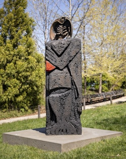 With the ominous title Before The End, Huma Bhabha (b. Karachi, Pakistan, 1962) sets the stage to evoke mythologies as old as humankind. Conceived for Brooklyn Bridge Park, Bhabha’s four monumental painted and patinated bronzes were cast from carved cork and skull fragments. The mysterious figures recall ancient effigies cut into tombstones, their surfaces evoking centuries of eroded sediment and stone. Yet, unlike a tomb, these four-sided vertical forms stand elevated above the earth, their bones open to the sky.