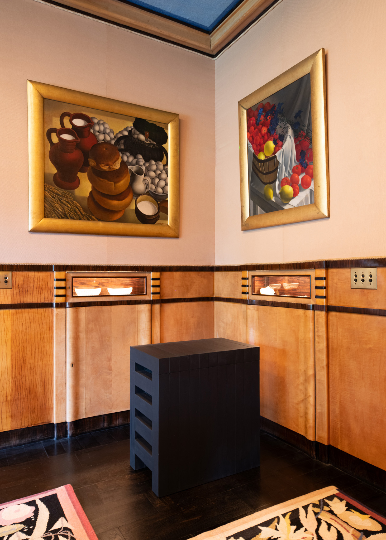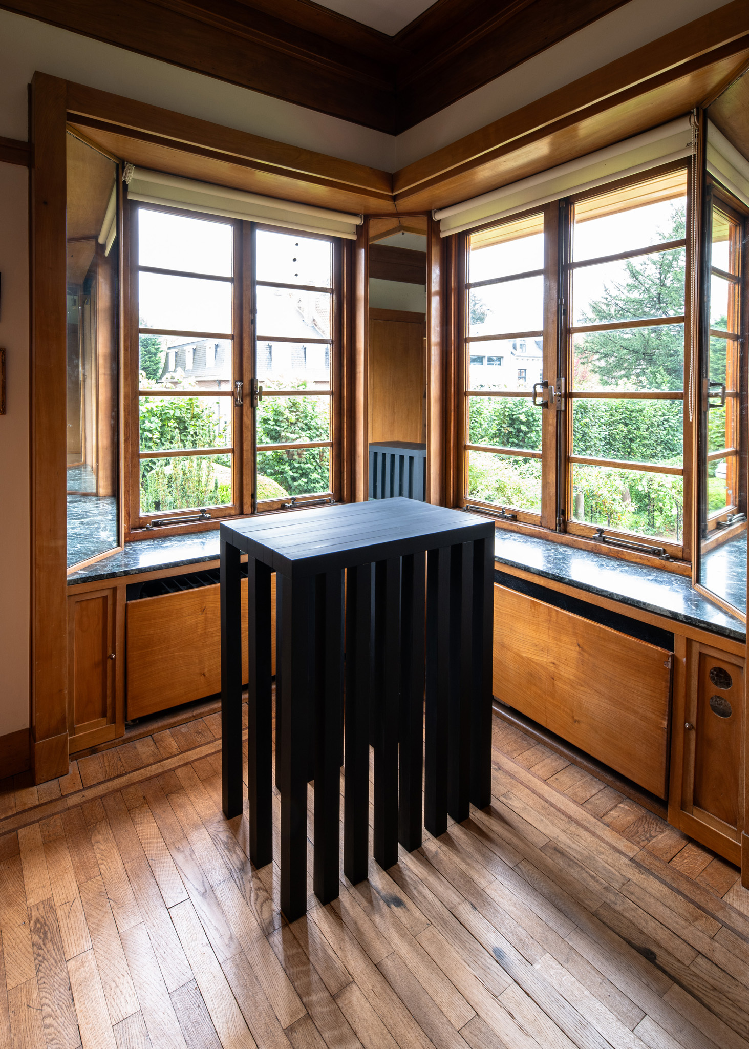 Meanwhile, the Tombeaux sculptures can be interpreted as sculptural still lifes. Composed of everyday objects such as cabinets, shelves and tables, the Tombeaux evoke interiors, furniture, theatre settings or architecture. Strategically placed within the museum’s domestic setting, they often lack identifiable content, thereby presenting a riddle to the viewer. The term Tombeaux, which translates to “tombs” or “graves,” also refers to a poem or musical composition commemorating a notable individual. Instead of serving as traditional monuments dedicated to specific subjects, these non- functional, furniture-like sculptures are self-referential and resist any type of straightforward interpretation.