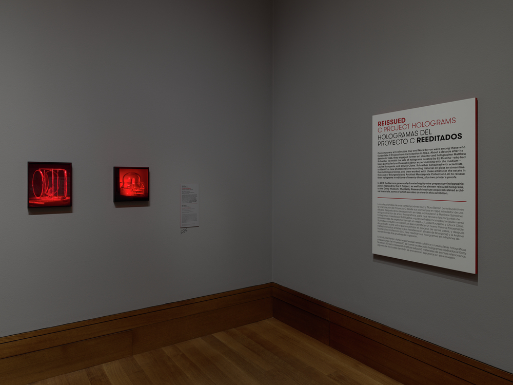 Holograms produce the magical illusion of three-dimensional objects floating in space. They were made possible by the invention of laser technology in the 1960s, and since then, many artists have experimented with the art form. This exhibition presents holograms by John Baldessari, Louise Bourgeois, Ed Ruscha, and other artists who were invited by the C Project to explore the creative potential of the medium in the 1990s. Deana Lawson turned to holography to expand her photographic practice around 2020. The master technician in both instances was artist Matthew Schreiber, whose work is also featured.