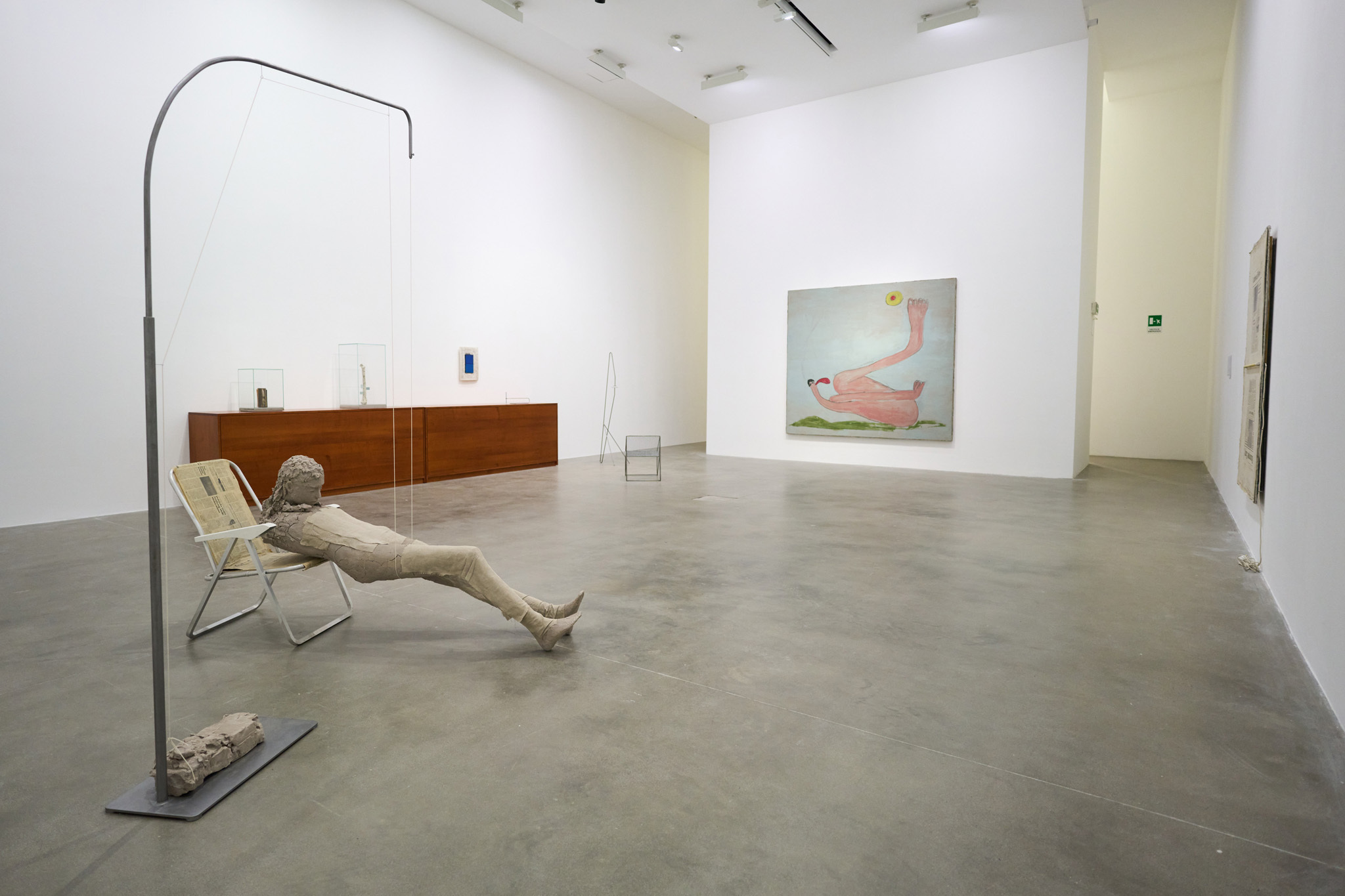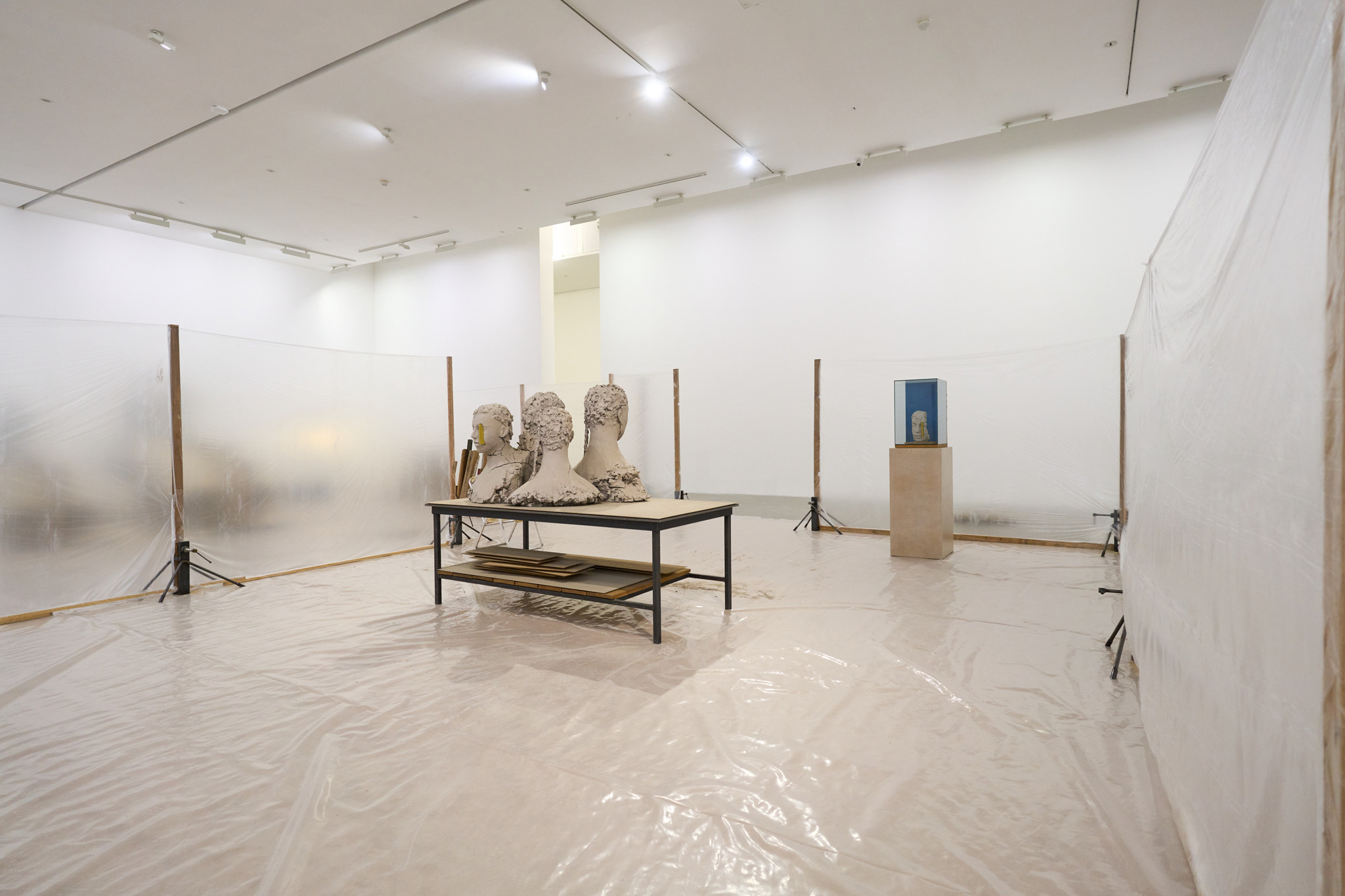 The subject of Silent Studio is Manders’ studio, a space both real and conceptual, that merges seamlessly with the minimalist architecture of the Fondazione. The exhibition features over twenty works, including sculptures, paintings, works on paper, installations, and furniture in bronze, steel, and iron. Despite their solid construction, Manders’ works convey a sense of transience and vulnerability, with their unfinished appearance and the use of enduring materials like bronze to simulate the fragility of clay.