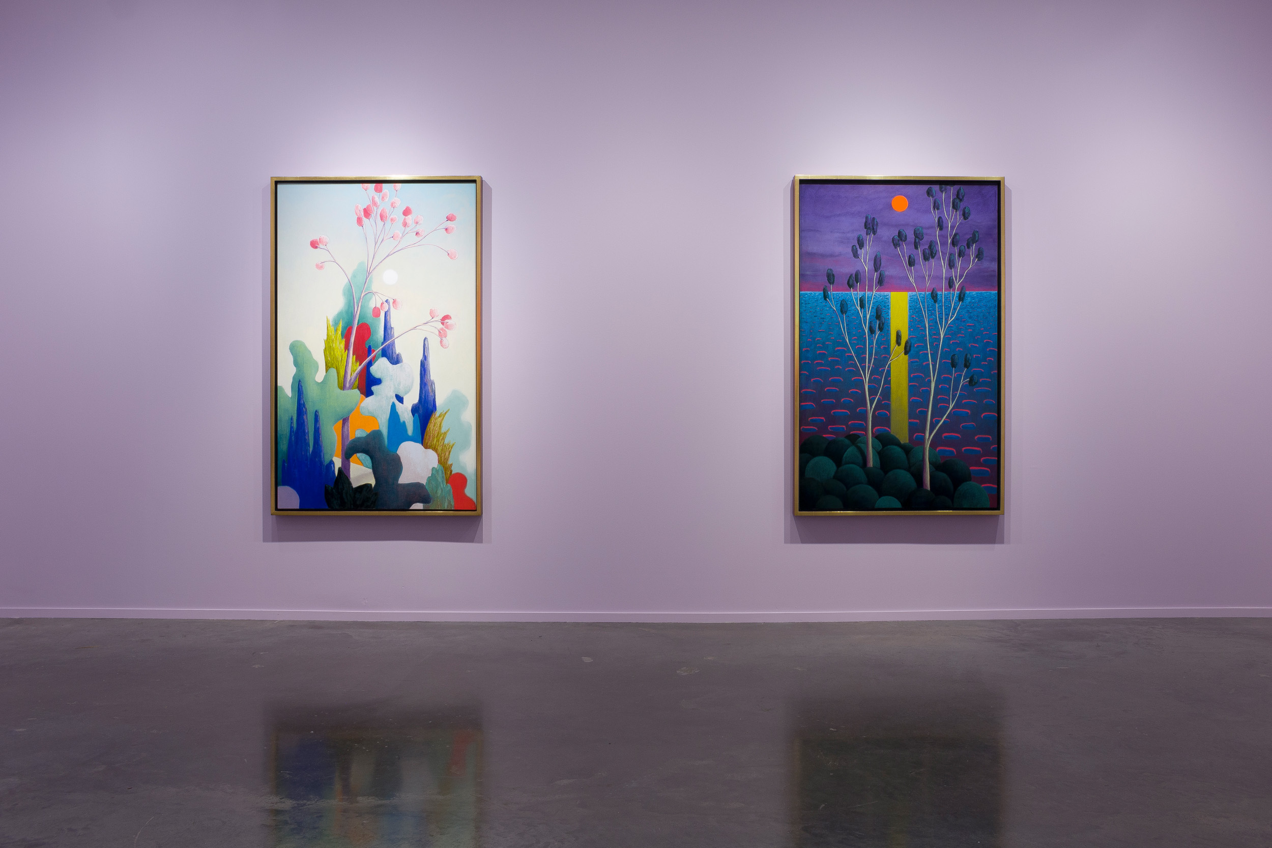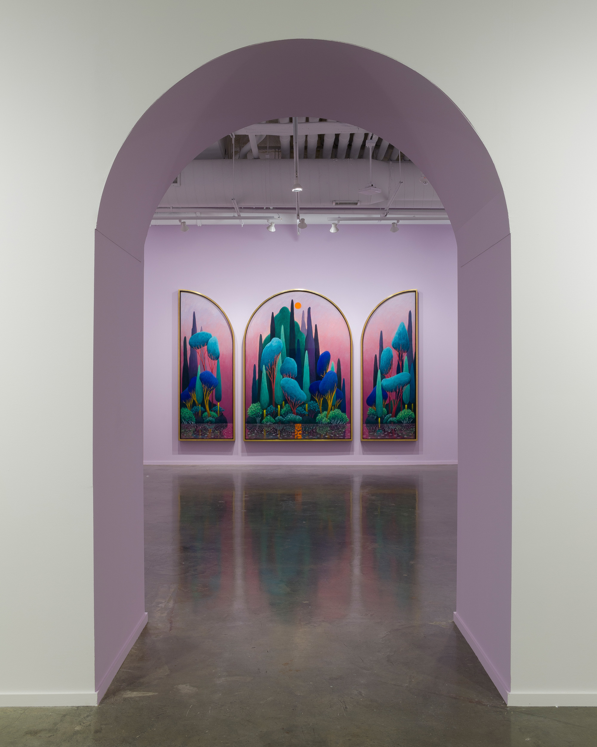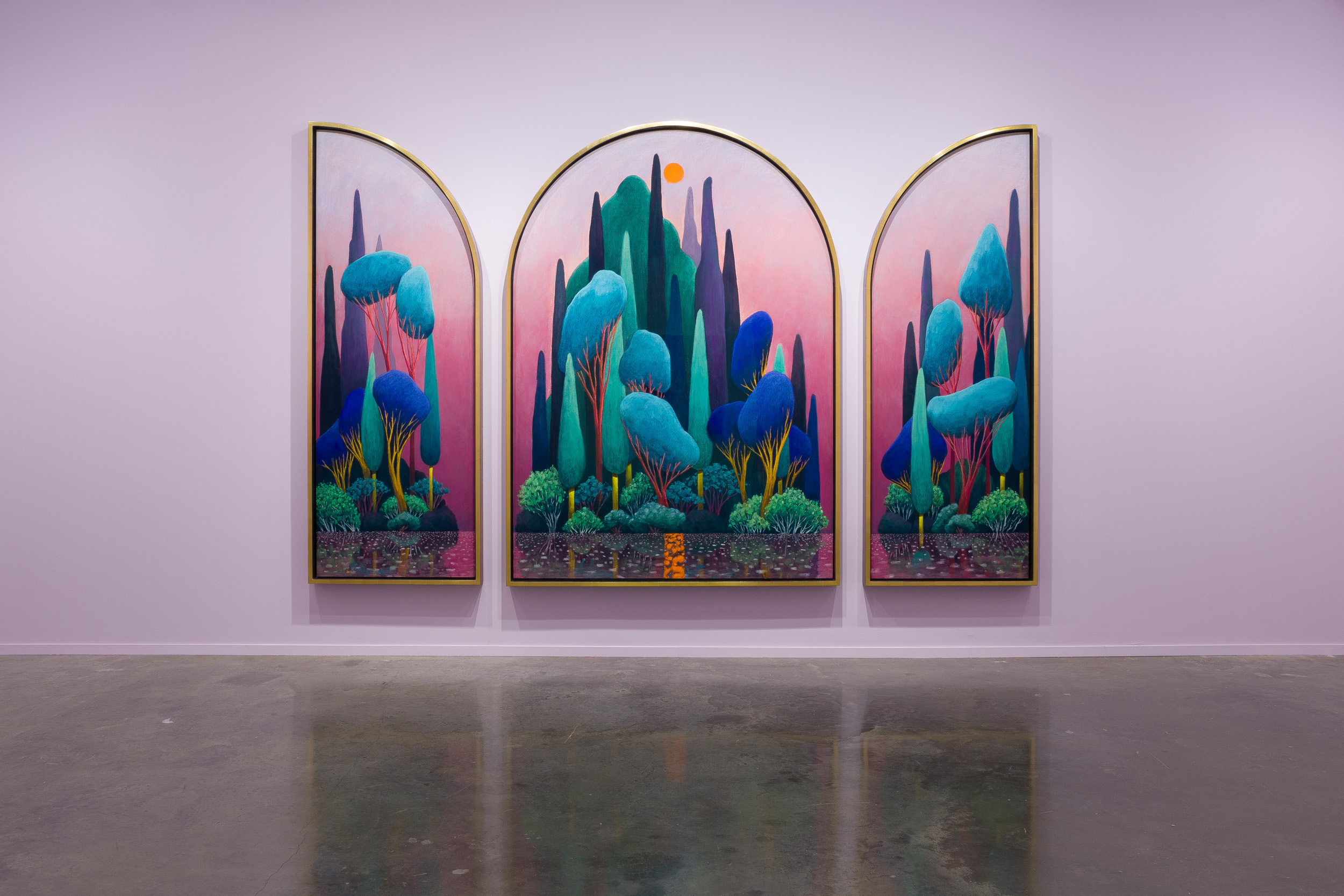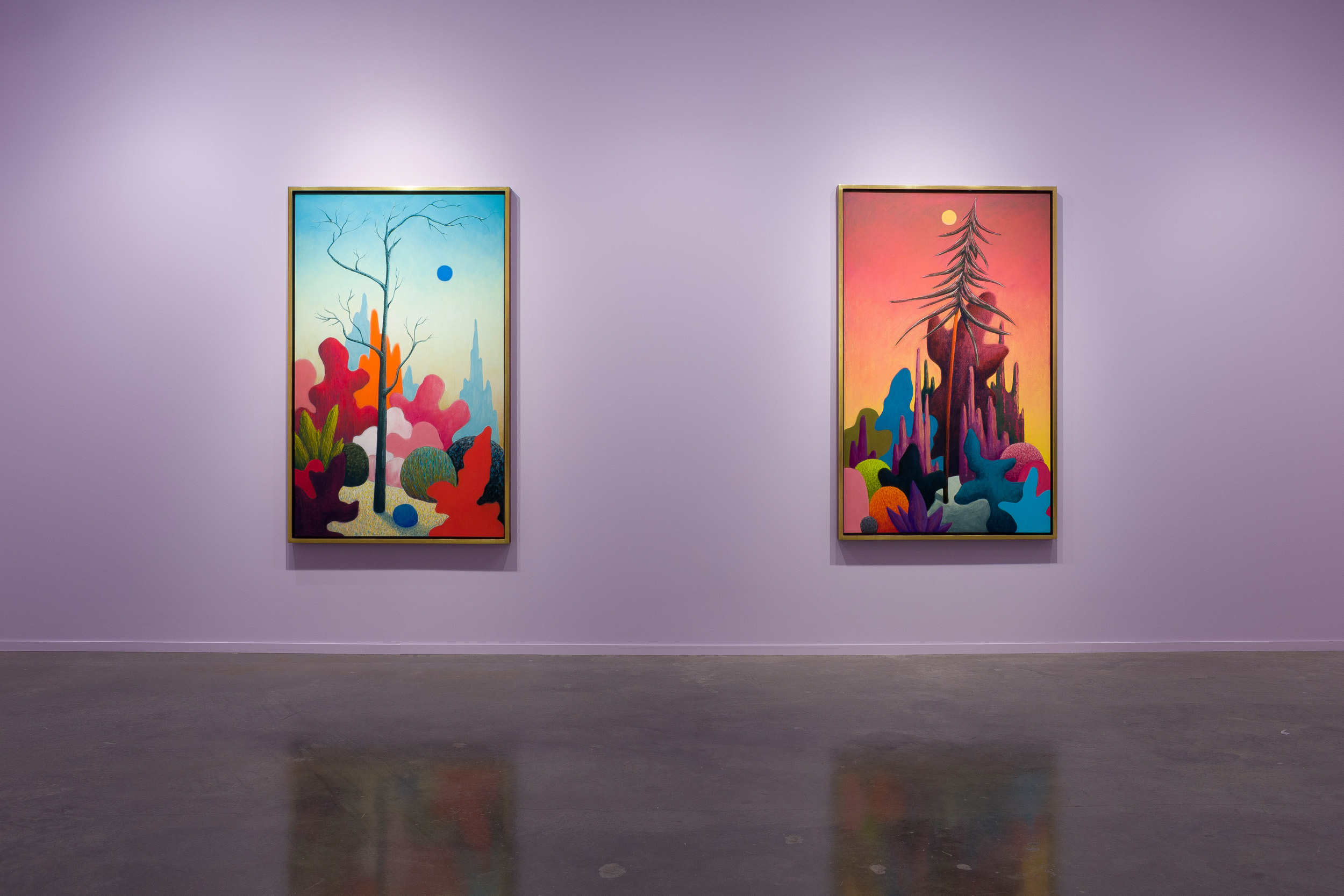 Featuring five artworks by Swiss artist Nicolas Party, Landscape transforms the Spotlight Gallery into an immersive world where visitors can step into imaginary worlds full of beauty and splendor. This exhibition provides a look into Party’s landscapes from recent years: their rich pastels transporting the viewer into surrealist scenes of uncanny whimsy. As a teenager, Party often spent time tagging trains with graffiti in his home of Lausanne, Switzerland. He later adapted this practice to create large-scale murals for museums and public spaces which have become a hallmark of his career and are echoed in the colorful walls of the foundation’s Spotlight Gallery. Neither idyllic nor recognizable, Party’s context-less landscapes leave the viewer to ponder these strange and fantastical worlds without the guiding hand of human intervention. Speaking of these scenes, Party indicates that he “paints an environment that belongs either to a time before or long after humanity, a time when human culture doesn’t affect the landscape.”