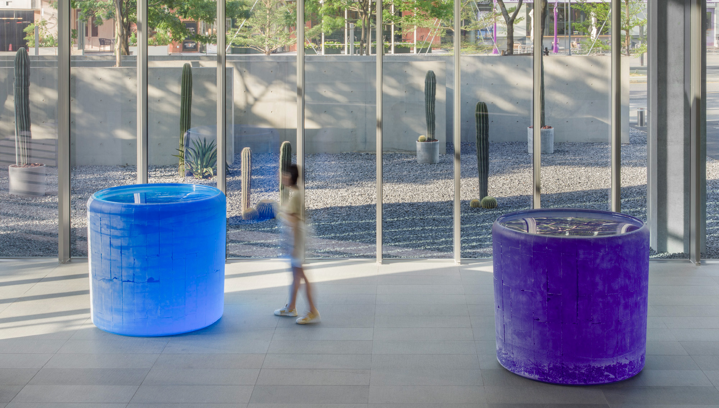 Since the mid-1990s, Horn has been producing cast-glass sculptures. For these works, colored molten glass assumes the shape and qualities of a mold as it gradually anneals over the course of months. The sides and bottom of the resulting sculpture are left with the rough translucent impression of the mold in which it was cast. By contrast, the top surface is smooth and gives the appearance of liquid under tension. The seductively glossy surface invites the viewer to gaze into the optically pristine interior of the sculpture, as if looking down on a body of water. Exposed to the reflections from the sun or to the shadows of an overcast day, Horn’s glass sculpture relies upon natural elements like the weather to manifest her experimentations in color, weight and lightness, solidity and fluidity. The endless subtle shifts in the work’s appearance place it in an eternal state of mutability, as it refuses a fixed visual identity. Begetting solidity and singularity, the changing appearance of her sculptures is where one discovers meaning and connects her work to the concept of identity.