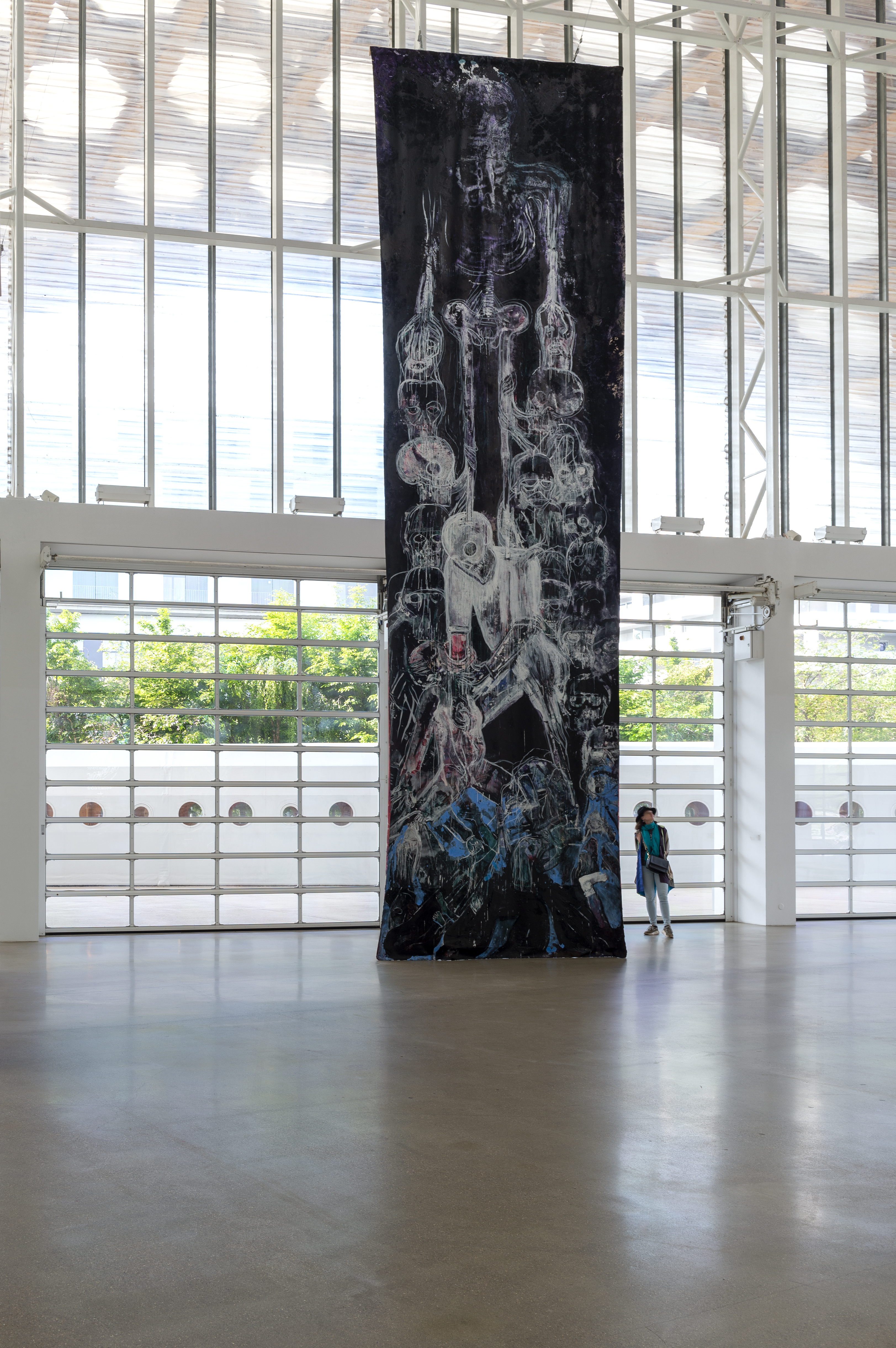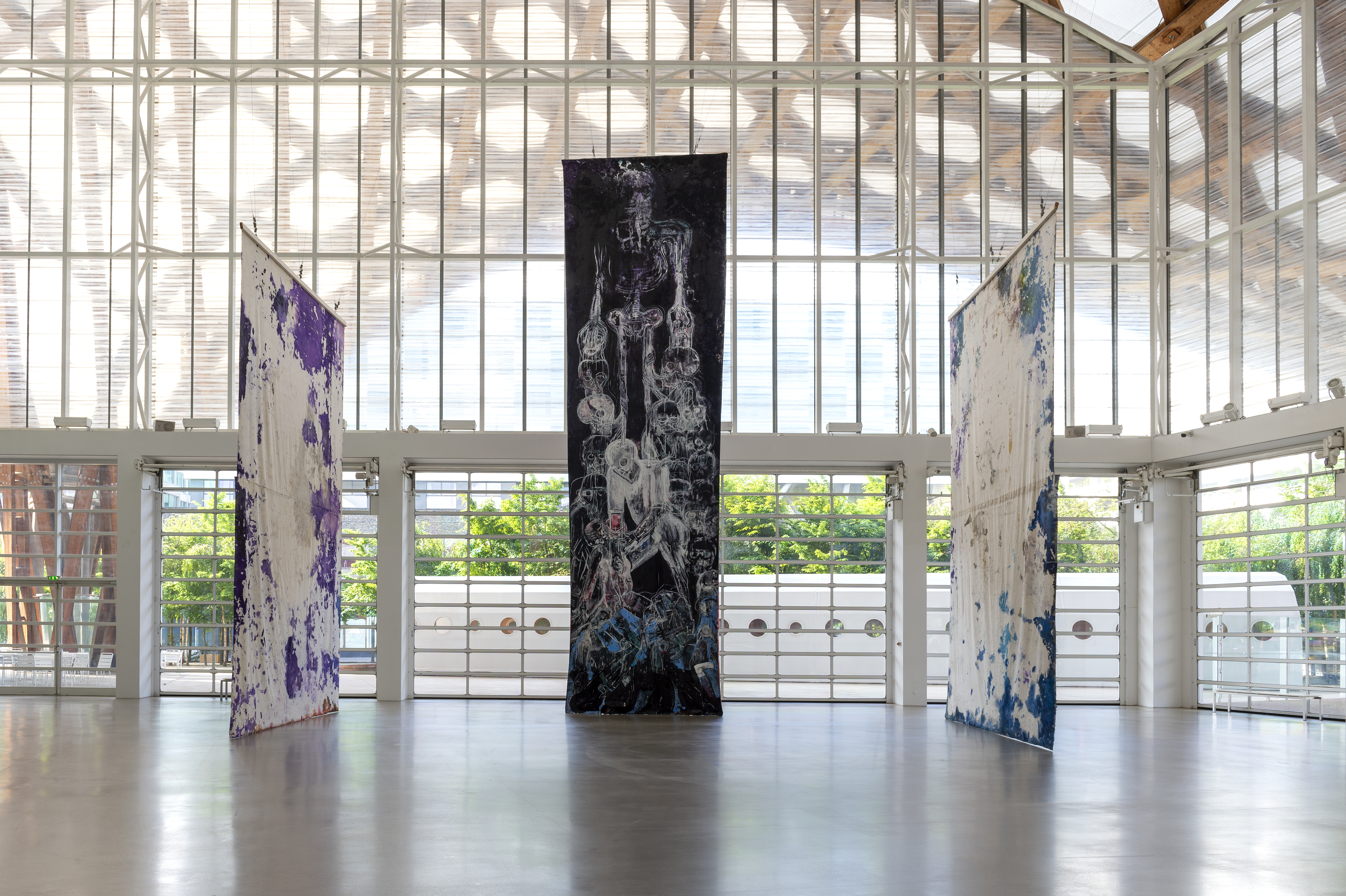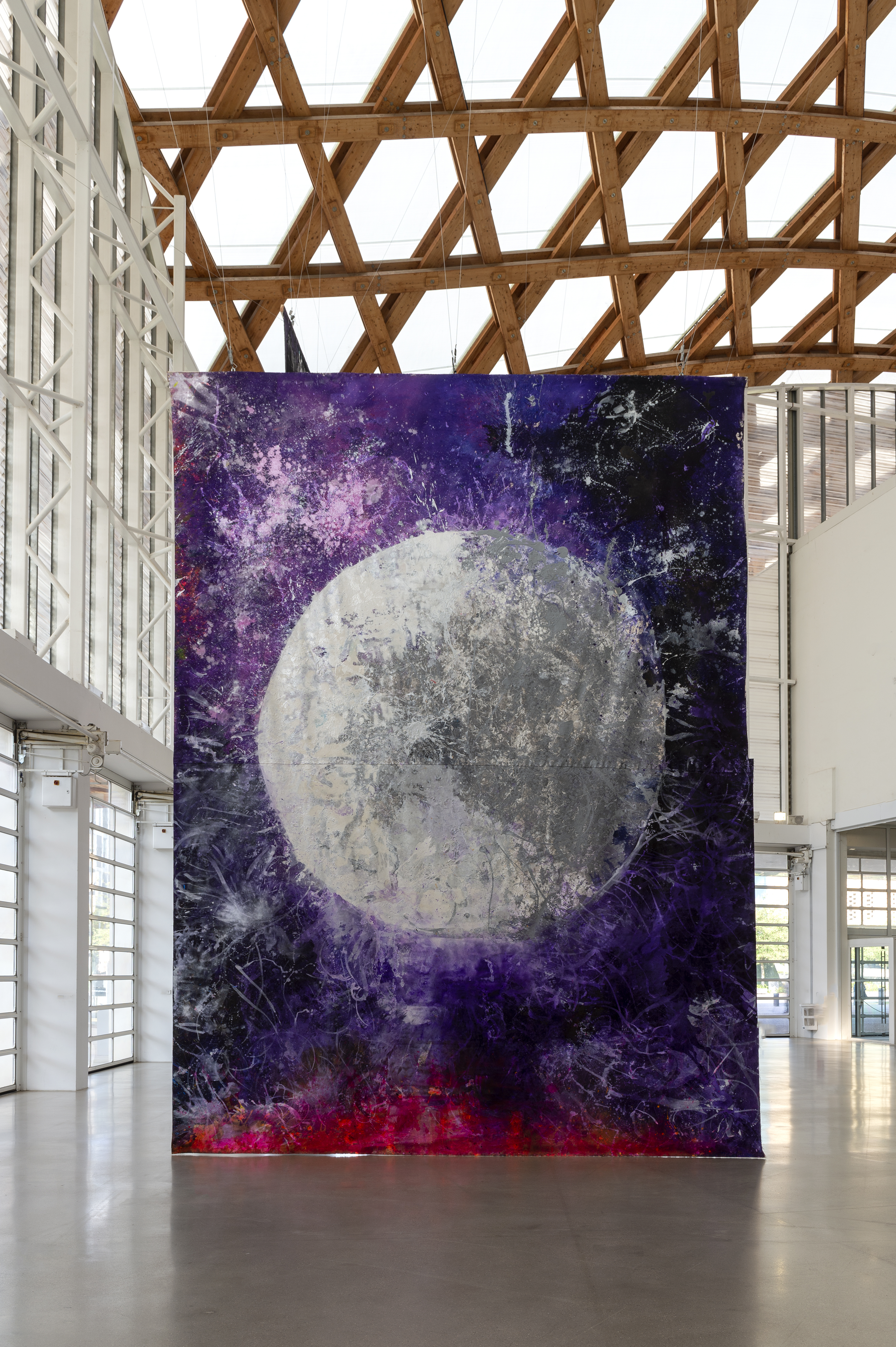 In May, Houseago hung three monumental unstretched canvases – Moon Wane, Sunrise / Set, and Bucha – from the roof of the museum producing a dialog with the architecture. Made at his studio in California outdoors and exposed to the elements, these paintings mark a new stage in his work. Nature has always been an inspiration for the artist, but here it is the main subject, the source of a cosmic energy that he seeks to capture. The force of nature and the destructive power of living beings are also expressed in the work Bucha, made in response to the massacres perpetrated by the Russians in Ukraine.