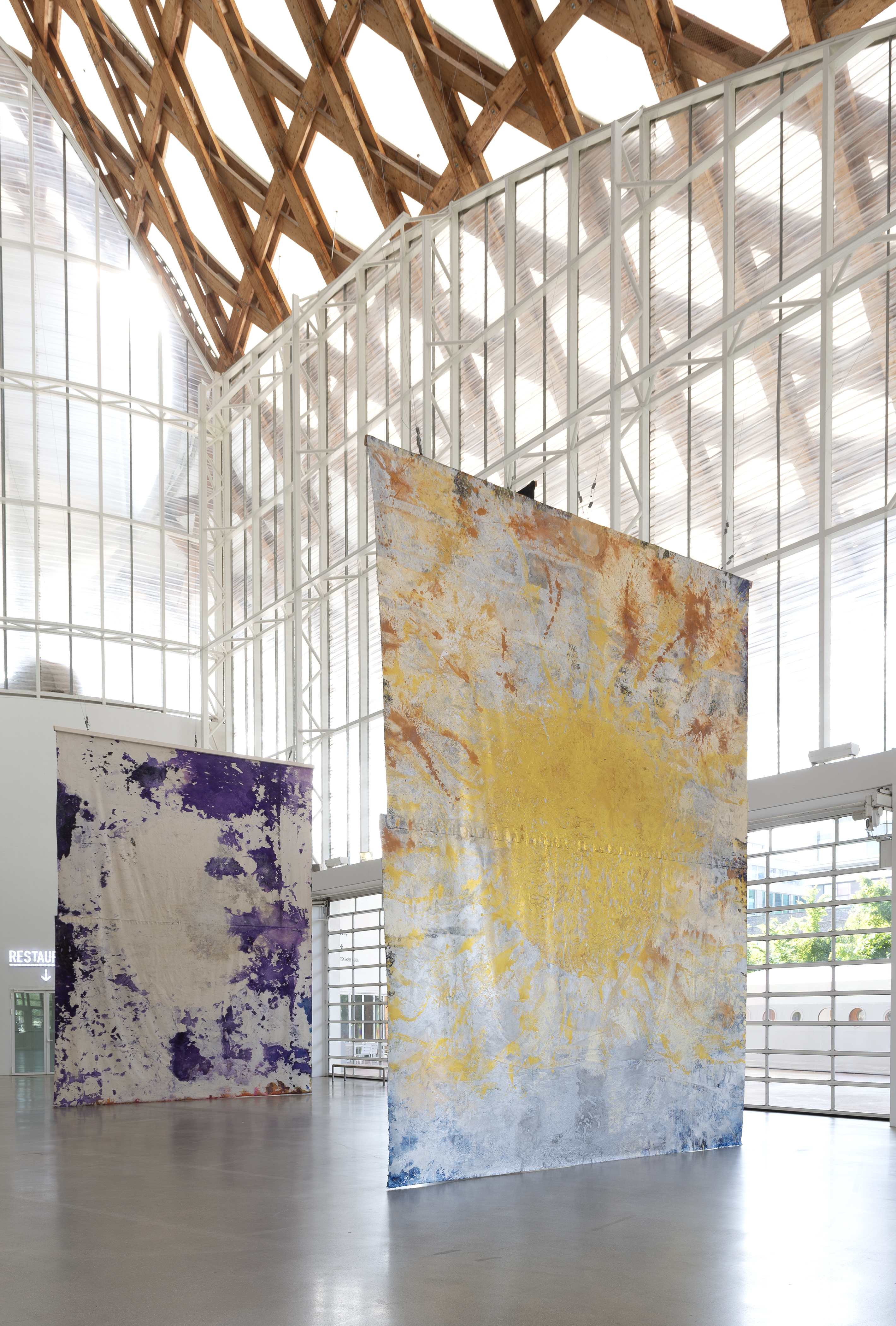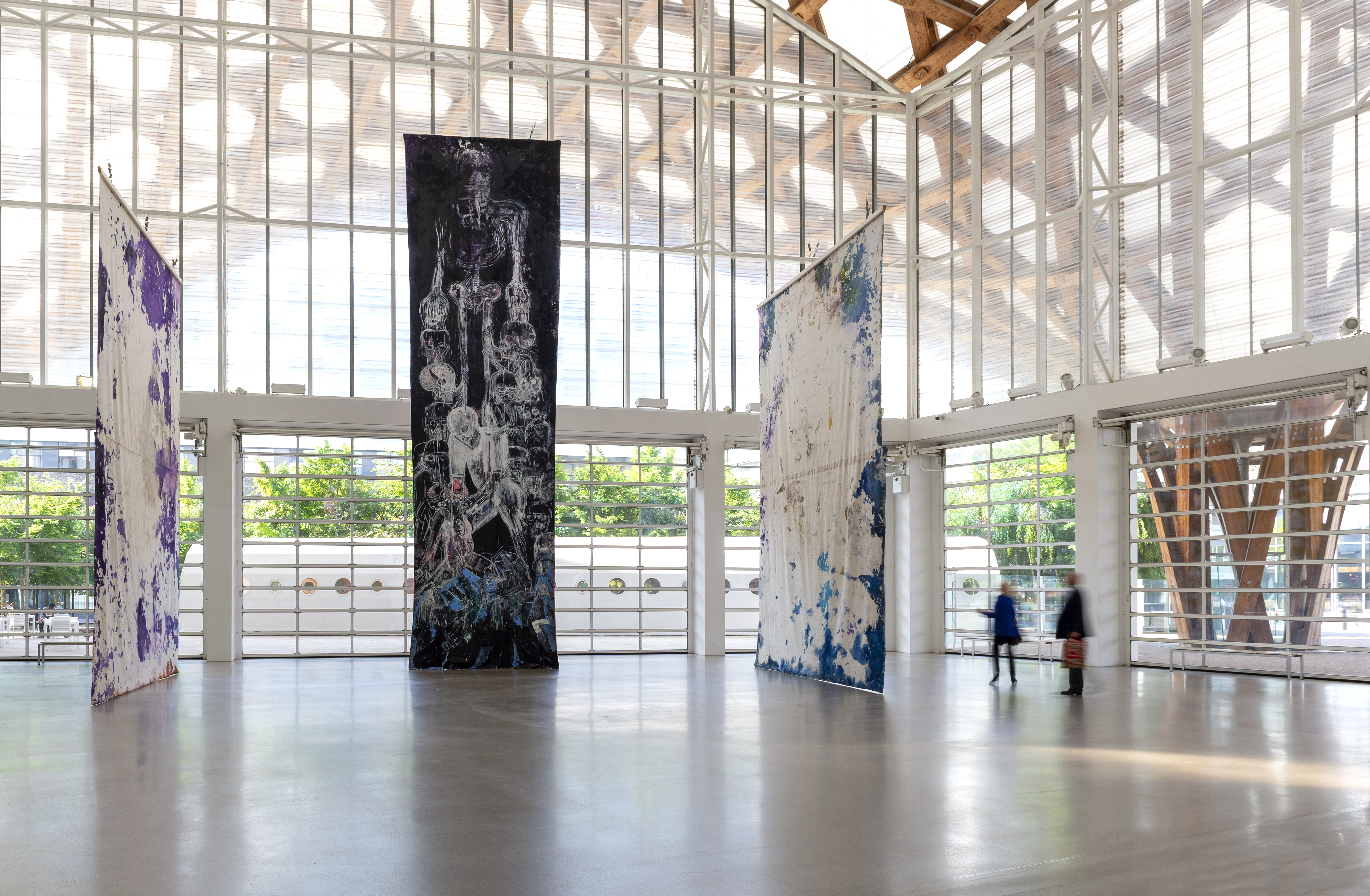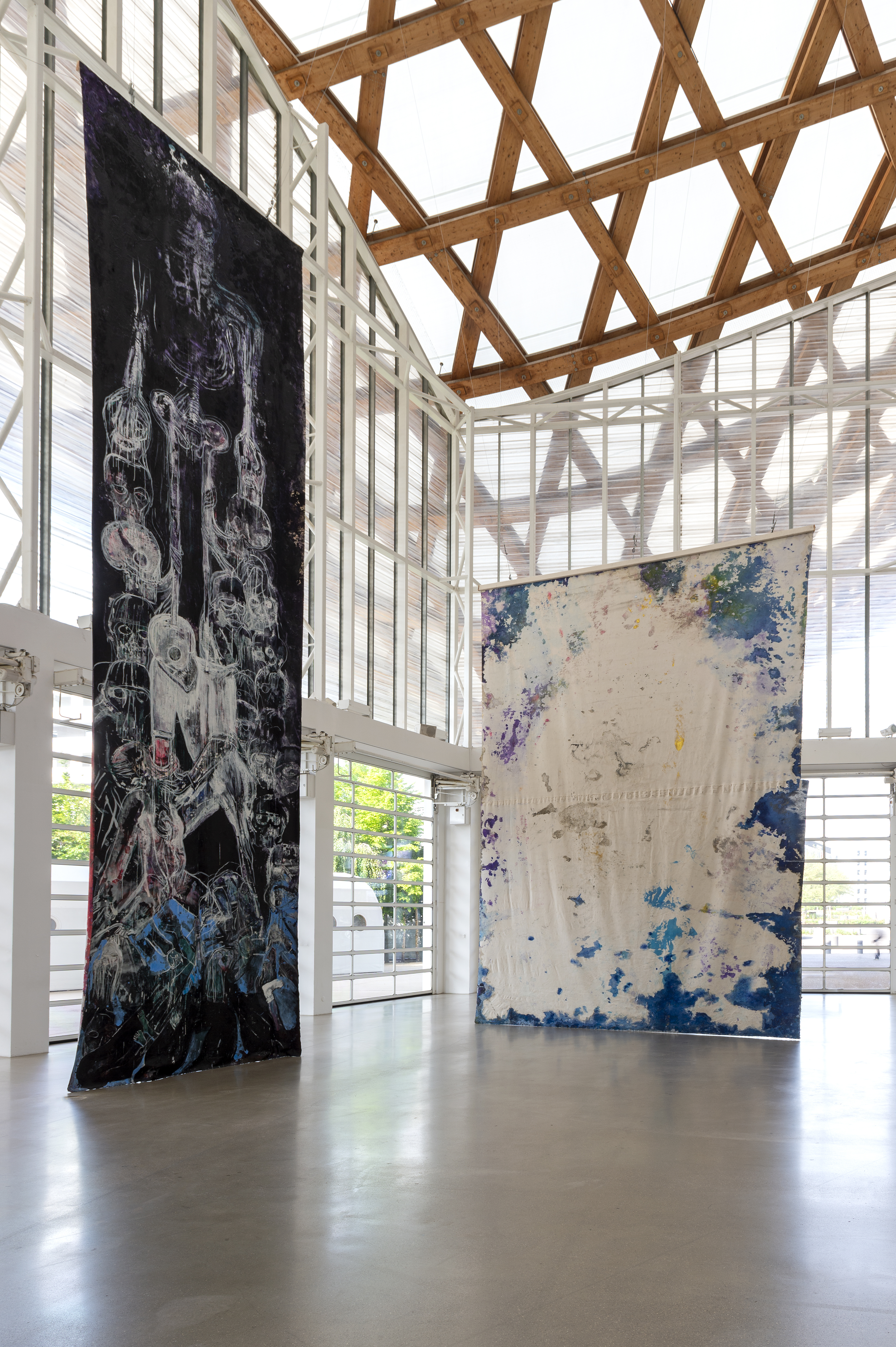 In May, Houseago hung three monumental unstretched canvases – Moon Wane, Sunrise / Set, and Bucha – from the roof of the museum producing a dialog with the architecture. Made at his studio in California outdoors and exposed to the elements, these paintings mark a new stage in his work. Nature has always been an inspiration for the artist, but here it is the main subject, the source of a cosmic energy that he seeks to capture. The force of nature and the destructive power of living beings are also expressed in the work Bucha, made in response to the massacres perpetrated by the Russians in Ukraine.