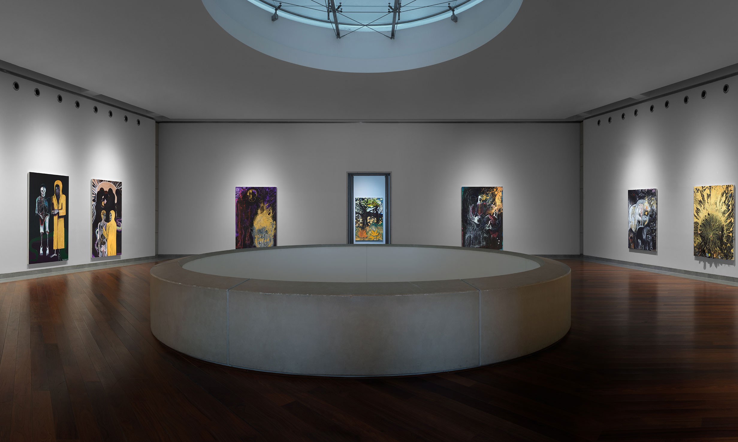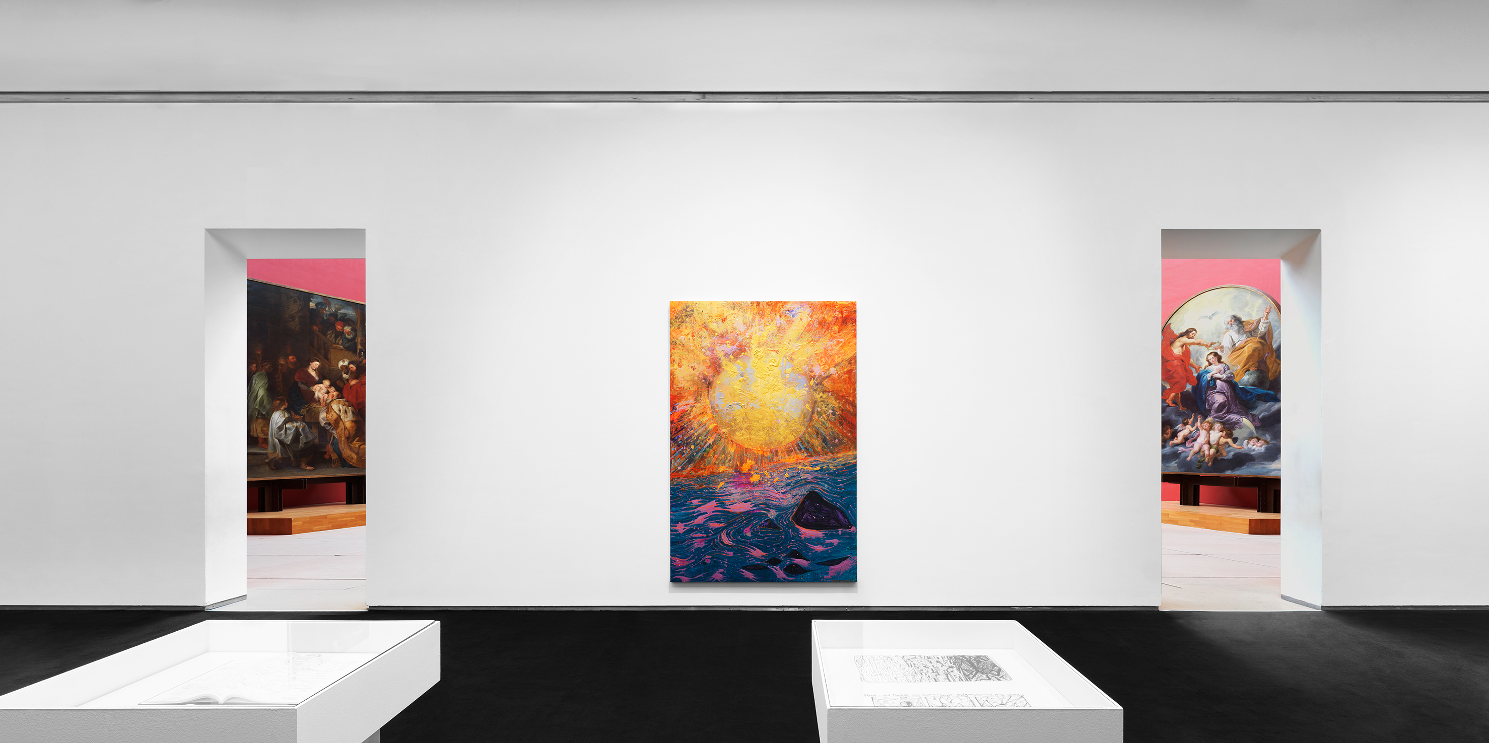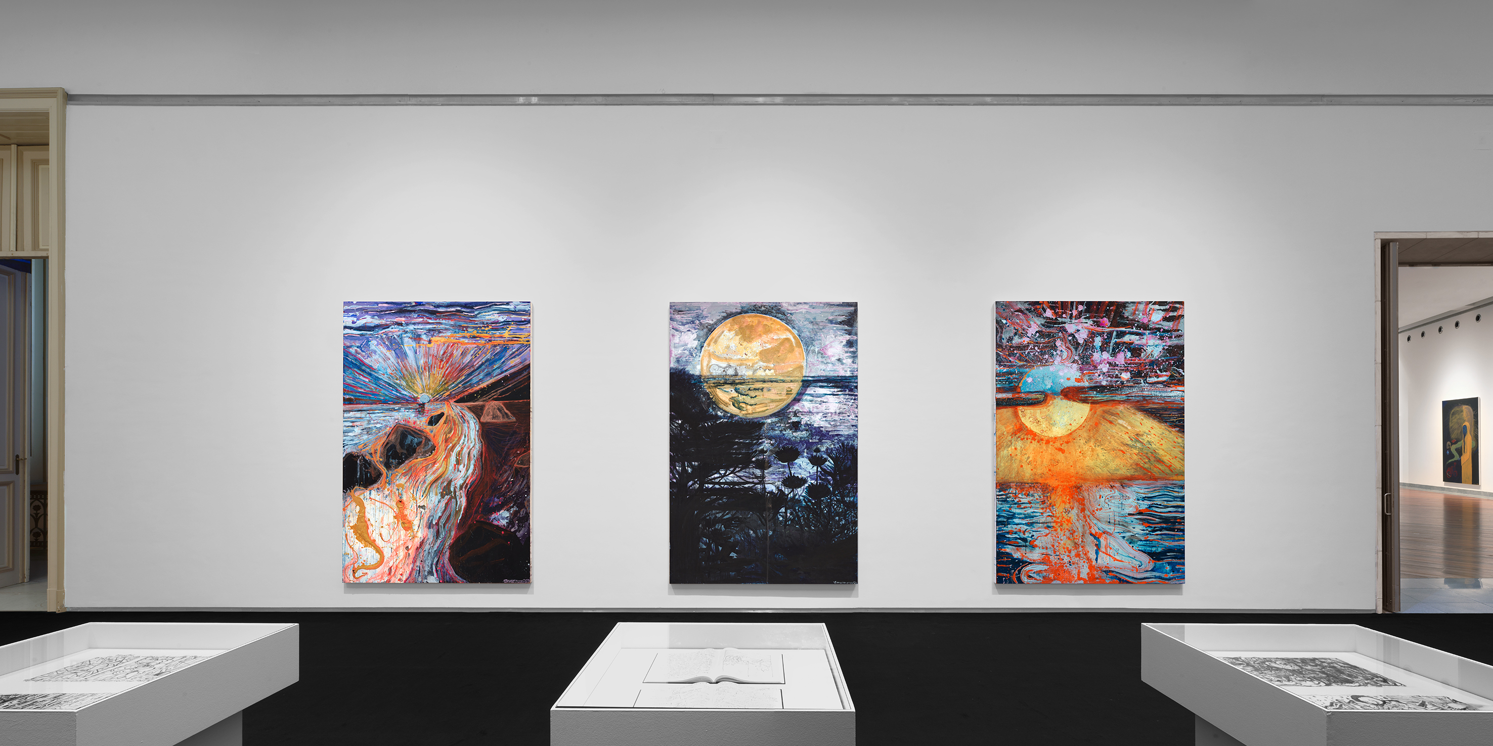 Another group of works in darker hues form a strong counterpoint to the radiant landscapes. The origins of these visionary paintings lie in an altered level of consciousness that is attained through meditation. Linked to creativity, inspiration, intuition and enlightenment, the theta state activates intense energy flows and unlocks hidden areas of the subconscious. In these transcendental works, faces and figures emerge from an indeterminate, pitch black space that is shot through with scintillating flashes of pure, blinding colour. While certain images allude to death and past trauma, yet others suggest a dynamic process of transformation.