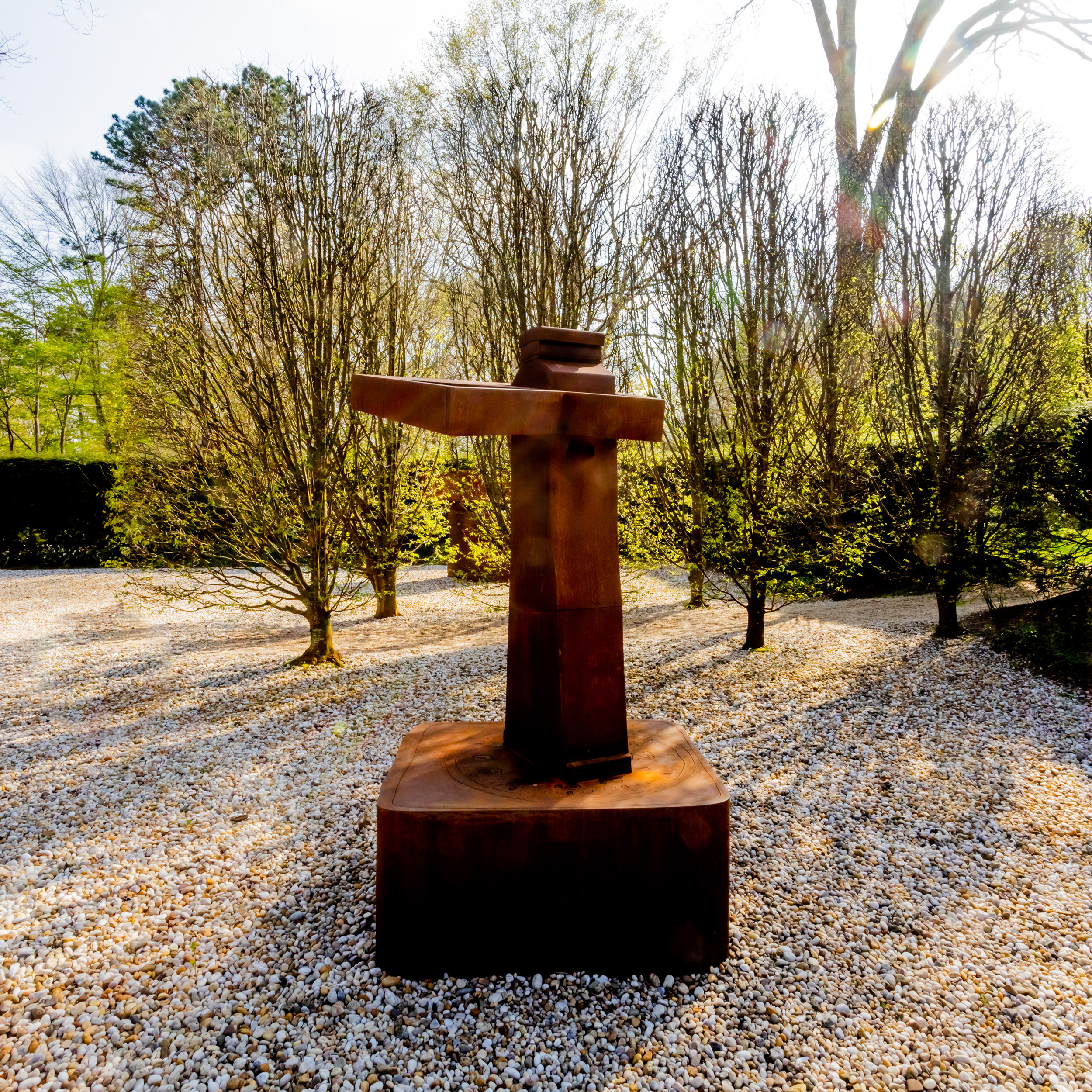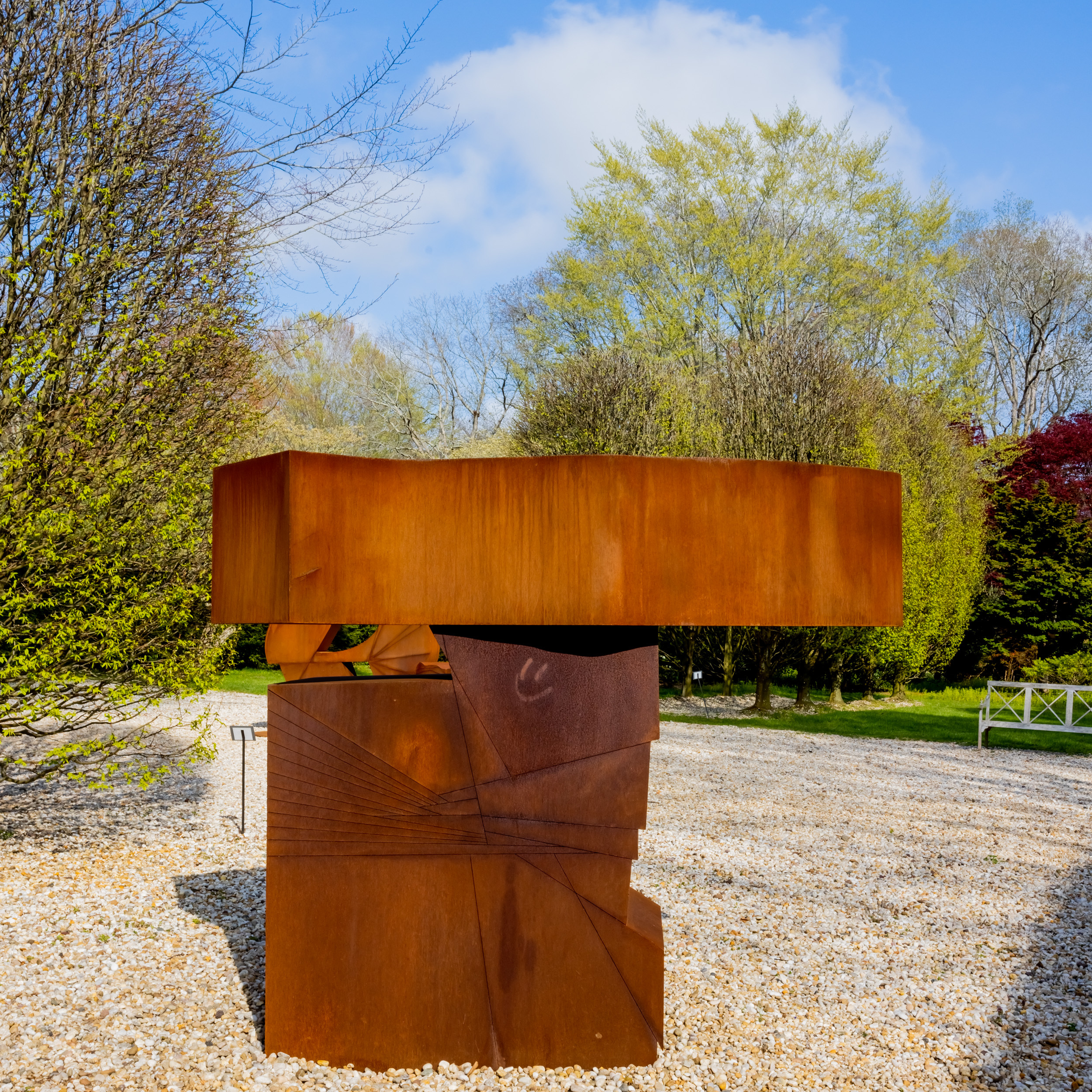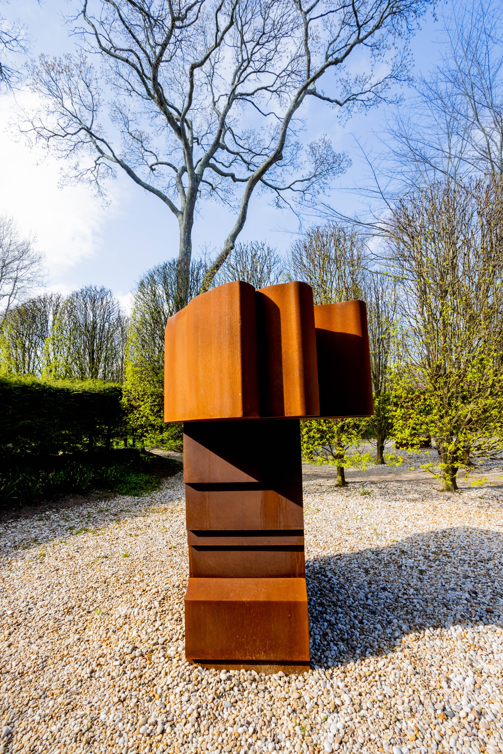 The new artworks include two large-scale sculptures by Maren Hassinger and three by Wyatt Kahn, plus ceramics by the Korean artist Jane Yang D’Haene. The sculptures by Wyatt Kahn—Parade, Painting the Painter and Umbrella—were among seven installed last year by the Public Art Fund in City Hall Park in Lower Manhattan. Fabricated in Corten steel, which weathers into a deep rusted red, the works combine elements of geometric abstraction with objects from everyday life—such as, in Parade—a foot about to crush a light bulb.