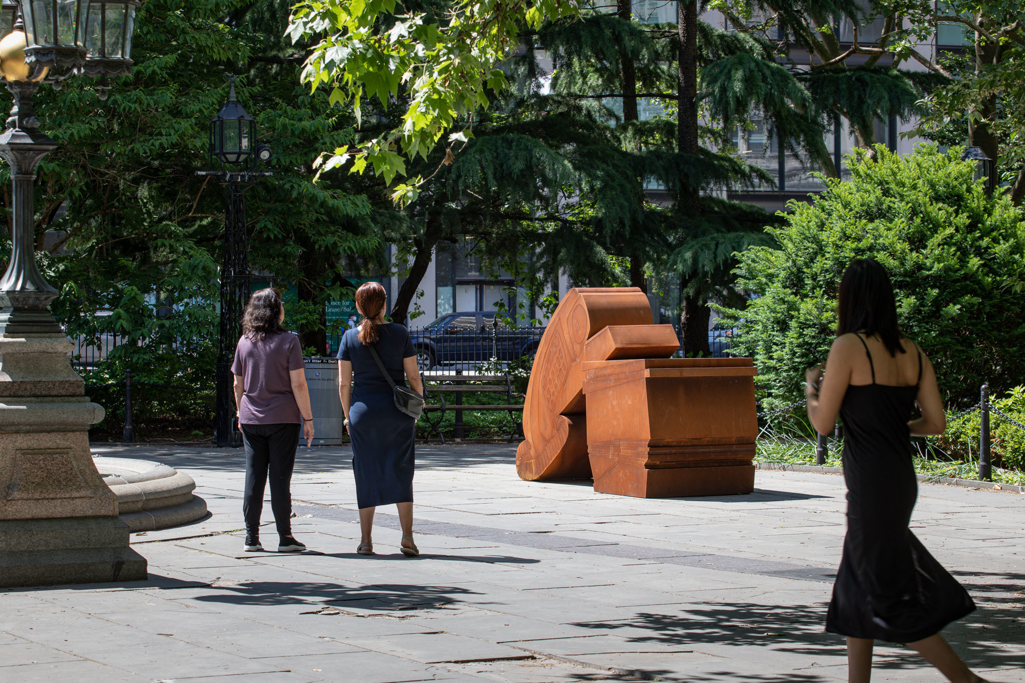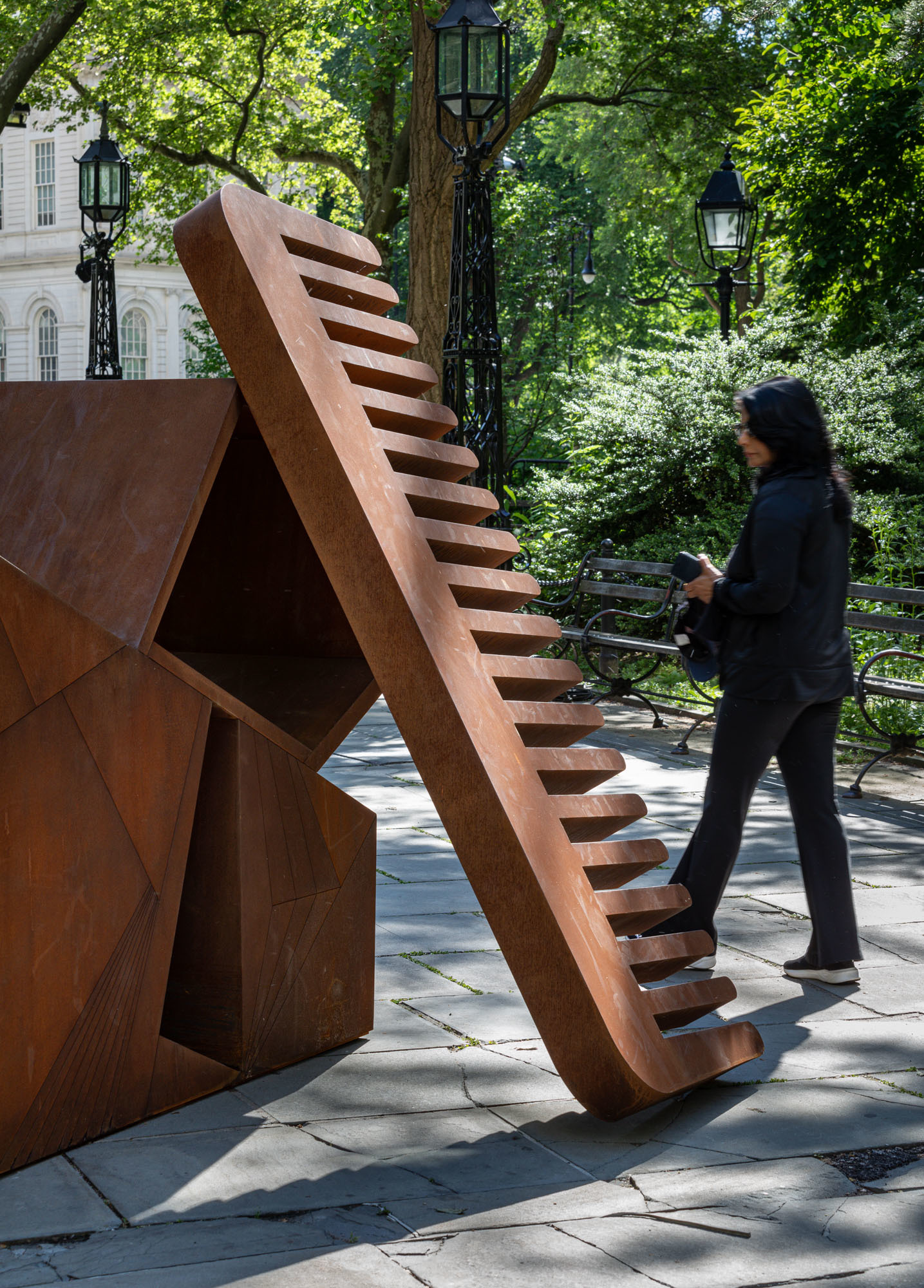 Over the past ten years, Kahn has examined the spatial relationship between painting and sculpture to construct a visual vocabulary of representational and abstract forms that integrate formal concerns with materials from everyday life. The new works unite geometric shapes from his earliest series of canvas paintings with oversized figurative “readymade” icons taken from domestic life, including a comb and phone, among others. Juxtapositions such as glasses resting on abstract shapes and a foot about to crush a lightbulb produce playful narrative compositions. Each component comprises numerous sections of steel that have been welded together into block-like forms, their front and back mirroring each other to create an illusion of drawing in space. The deep, rusted red tone of the sculptures is a result of the natural weathering process of Cor-Ten steel, contrasting with the lush green foliage of City Hall Park and evoking the steel structures of the city’s architecture and infrastructure. Life in the Abstract expands the lineage of modernist public sculpture, while the significance of each artwork takes on personal meaning and resonance for the viewer.