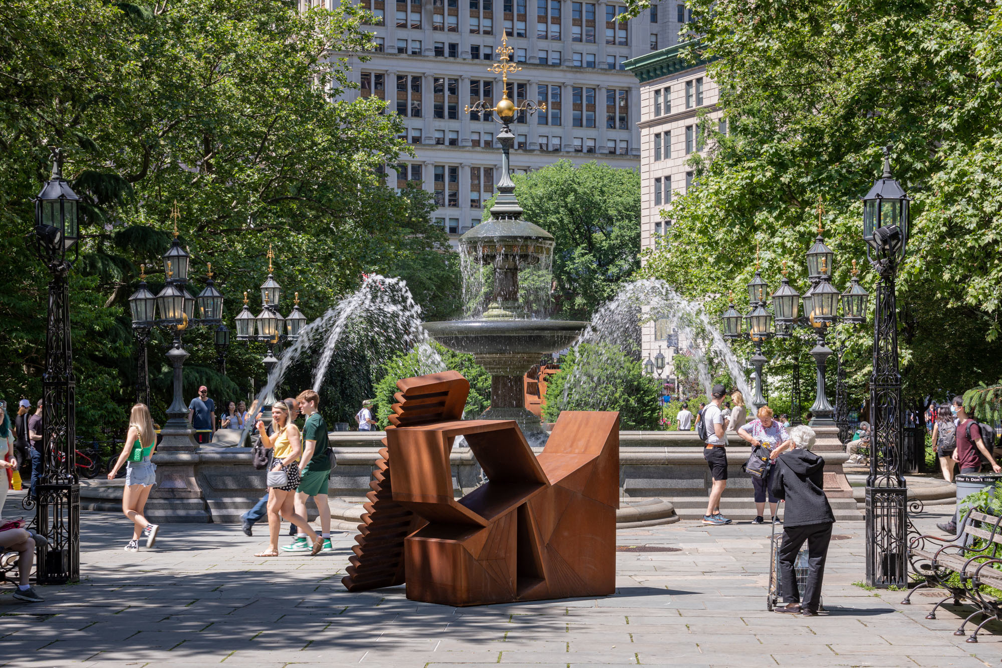 Brooklyn-based artist Wyatt Kahn will share seven monumental sculptures for his first exhibition in public space at City Hall Park in 2022. Kahn has adapted forms he previously explored in his canvas works, transforming them into seventeen massive Cor-Ten steel objects. Assembled in unique compositions, the largest will weigh nearly 3300 lbs and measure over 15 feet wide.