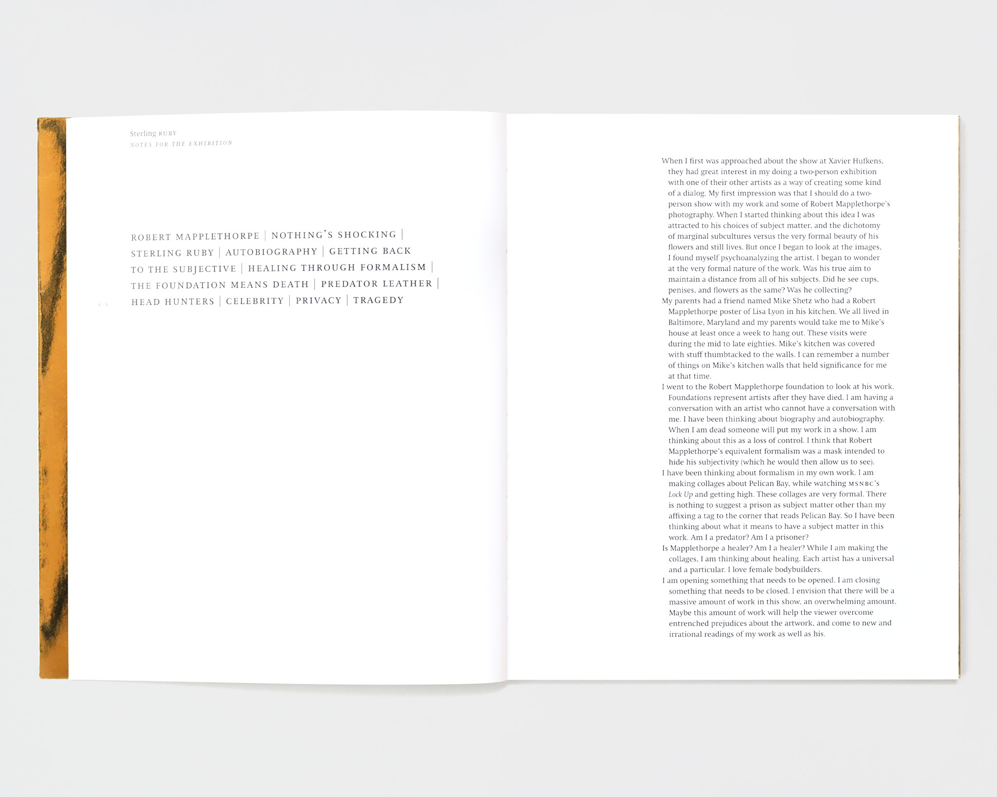 Xavier Hufkens is pleased to present a new catalogue by Sterling Ruby and Robert Mapplethorpe, published in accordance with the exhibition Sterling Ruby | Robert Mapplethorpe (2009-2010).