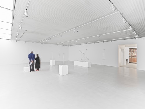 Flowers also appear in the artist’s cast aluminium sculptures. The FP in the title stands for ‘Flower Power’, a slogan used in the 1960s and 70s to denote passive resistance to the Vietnam War. Ginsberg invented the phrase in 1965, the year in which he wrote Drowse Murmurs, and it served to transform war protests into peaceful affirmative spectacles. An iconic photograph of a man placing a carnation inside the barrel of an M14 rifle, taken by Bernie Boston in 1971, captures the ethos. This image also featured on a poster in the Ruby household. Ruby’s sculptures are permeated with the same uneasy tension. Their slender forms—which reference his earlier wooden reliefs—resemble gun shafts and bayonets. They are typical examples of the artist’s regenerative practice and cast from assemblages of wood and other materials. Ruby salvages scrap from his creative projects and endlessly repurposes it, meaning that old works give rise to new. The flowers and foliage, all gathered from around the artist’s home and studio, were cast from life. Through these sculptures, Ruby also introduces a modern material into his work: aluminium. Synonymous with the space age, it is now a ubiquitous part of everyday life, thanks to its lightness and strength. But it also has extensive military applications. The metal played a significant role in the Vietnam War, for example, when it was used to manufacture people carriers and bombs. With their skeletal, almost spectral appearance, Ruby’s sculptures stand on the threshold of past and present. By establishing an analogy between militarism and activism, the works also raise questions about the conflicts that define our own epoch.