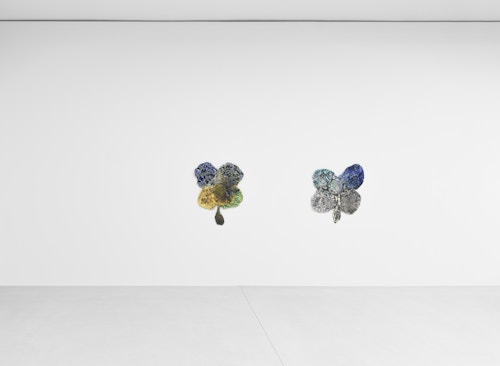 In his recent ceramics, Ruby continues his exploration of the four-petalled flower motif, or quatrefoil. This archetypal image has multiple spiritual and heraldic connotations, including an association with the four cardinal winds. Ruby has also made a visceral series of ‘flowers’ with lobe-like ‘petals’, and articulated stems that resemble vertebrae. With their gnarled and pockmarked surfaces, and their similarity to arrowheads, they resemble archaeological finds from a post-apocalyptic age. Lucio Fontana’s ceramic crucifixes, in which form and matter dissolve through the pressings and mouldings of the artist’s hands, were a reference point when making these works. Ruby has worked the clay just as intensely, pounding it in the open air so that it gathers traces, both positive and negative, of the world outside the studio. Like excavations or aerial views of ravaged landscapes, they follow on from the shattered topographies of the artist’s Basin Theology series.