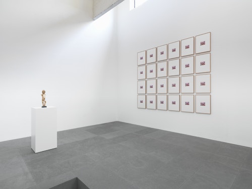 Medicine Ball harks back to Levine’s own Beach Ball, after Roy Lichtenstein’s Girl with Ball, an image he had found in a hotel advertisement. The sculpture was a contradiction-in-form, representing an object of lightness in bronze. This opposition is reversed again in Medicine Ball — the original item is already heavy. Lightness abounds once more in Rabbit, cast from a found folkloric item. It recalls Levine’s postcard collage After Dürer: 1–18, only here the motif is leaping.